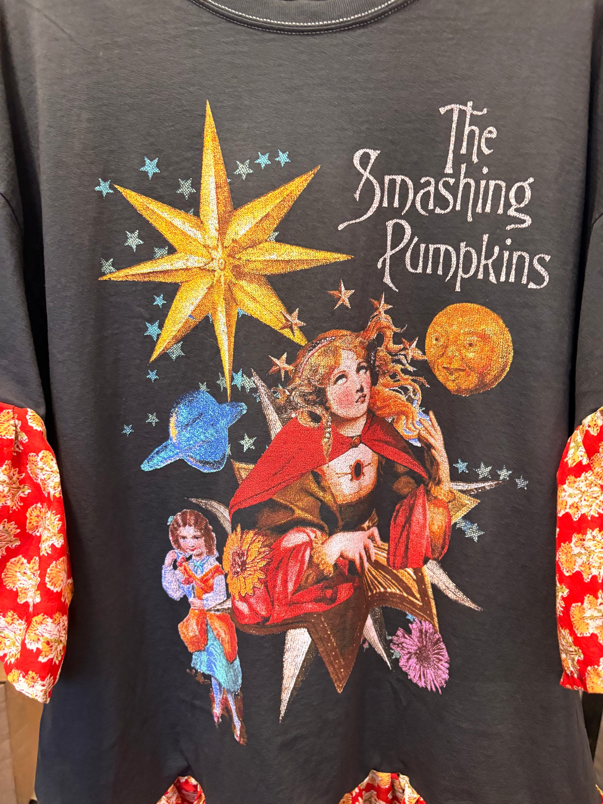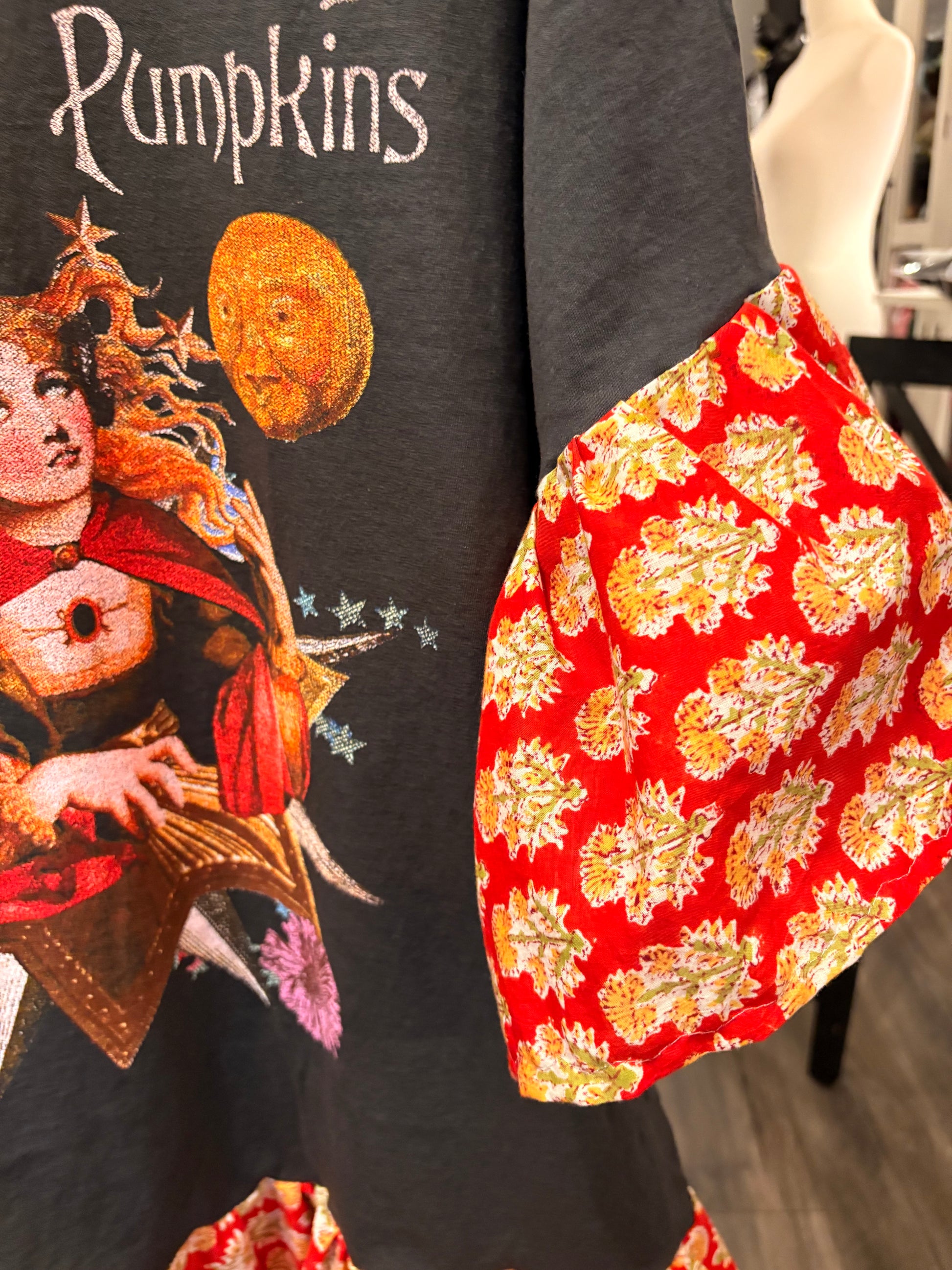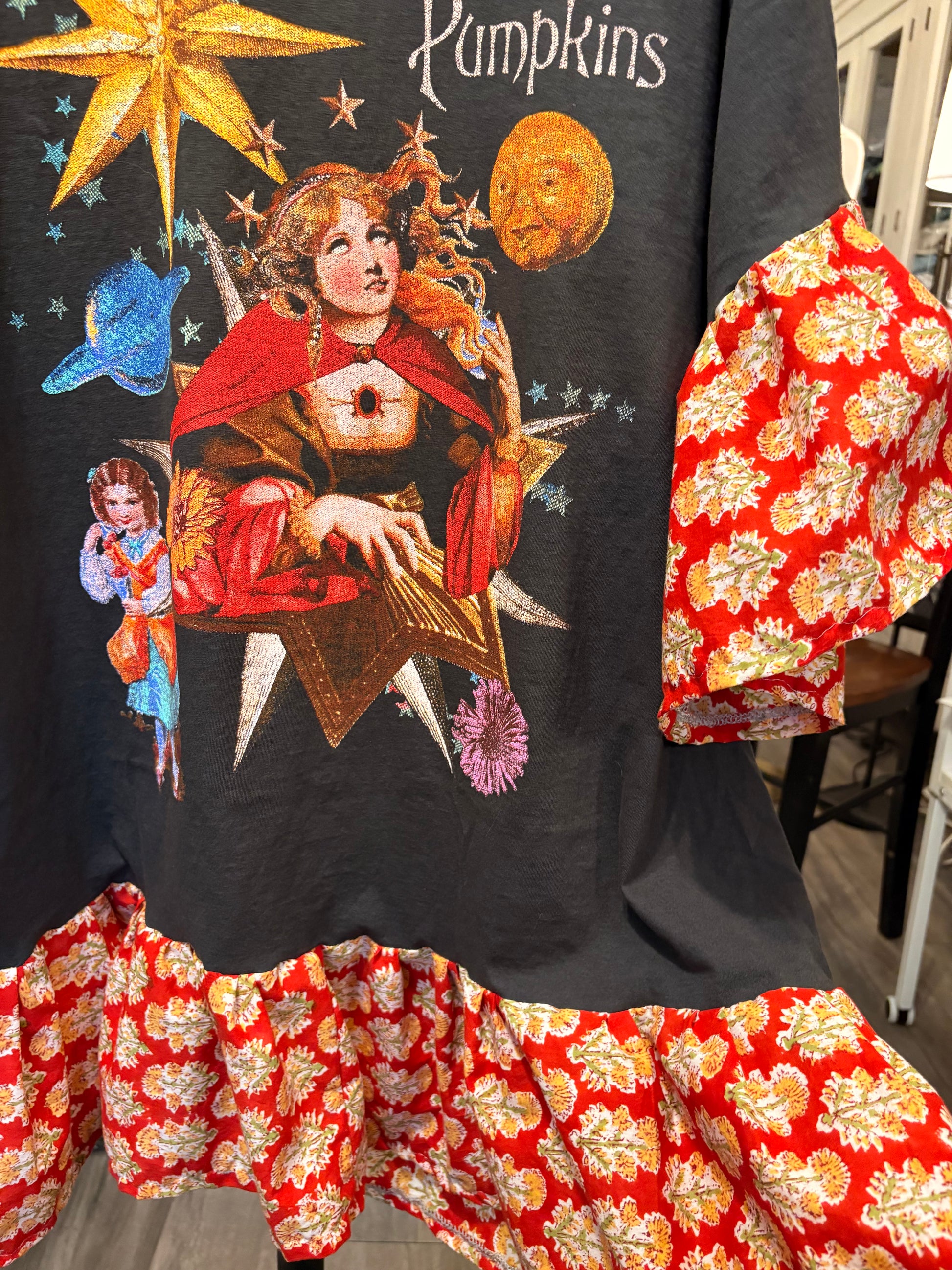 Upcycled rock graphic tee and cotton voile hand blocked fabric paired to make this FABULOUS ruffled dress!! SEW FABULOUS!!!!