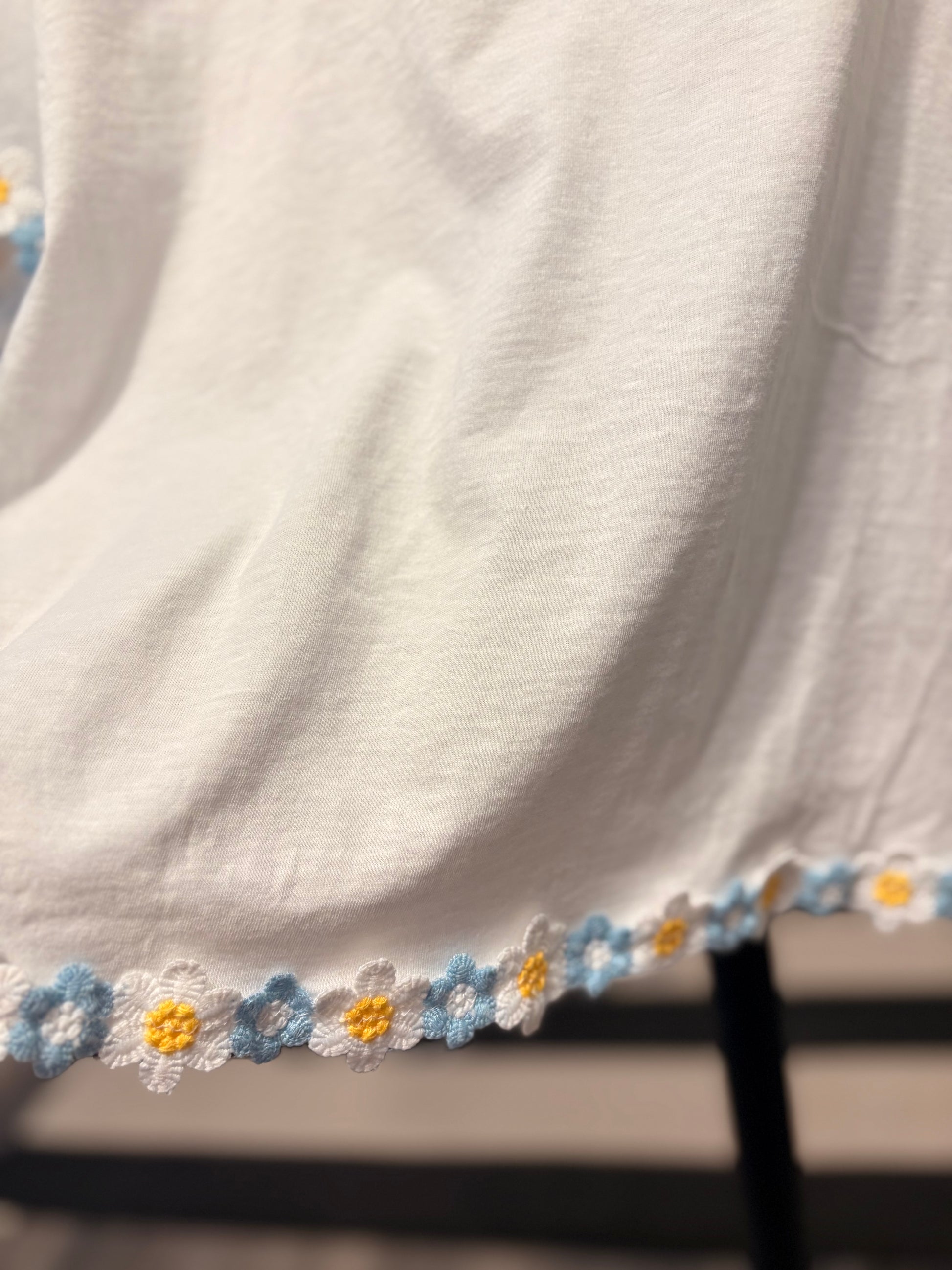 Inspired by Junk Journals. These tees are a collection of favorite things! Upcycled graphic tee and crochet trim. SEW many beautiful details ❤️ Shirt used is a Large.