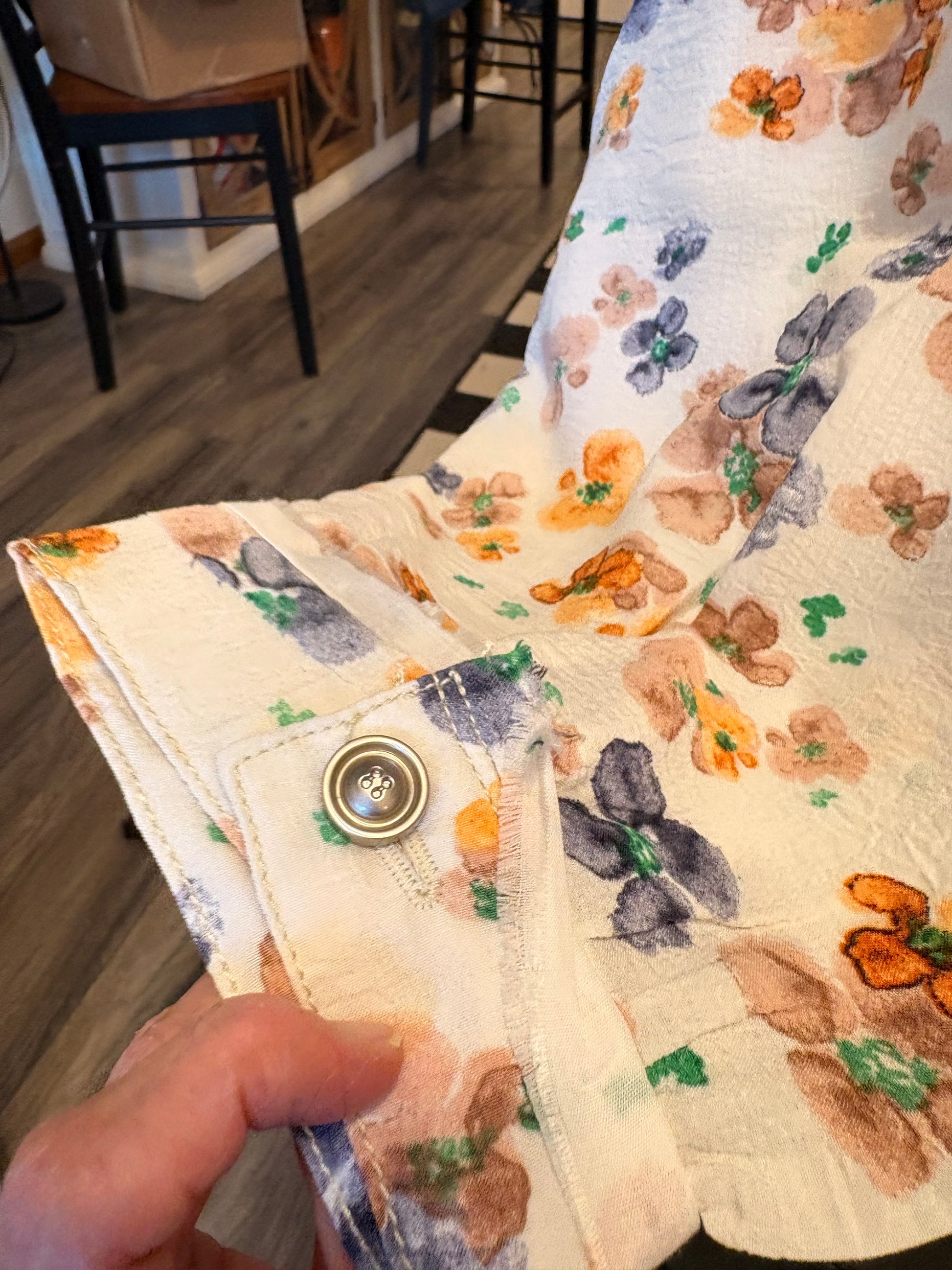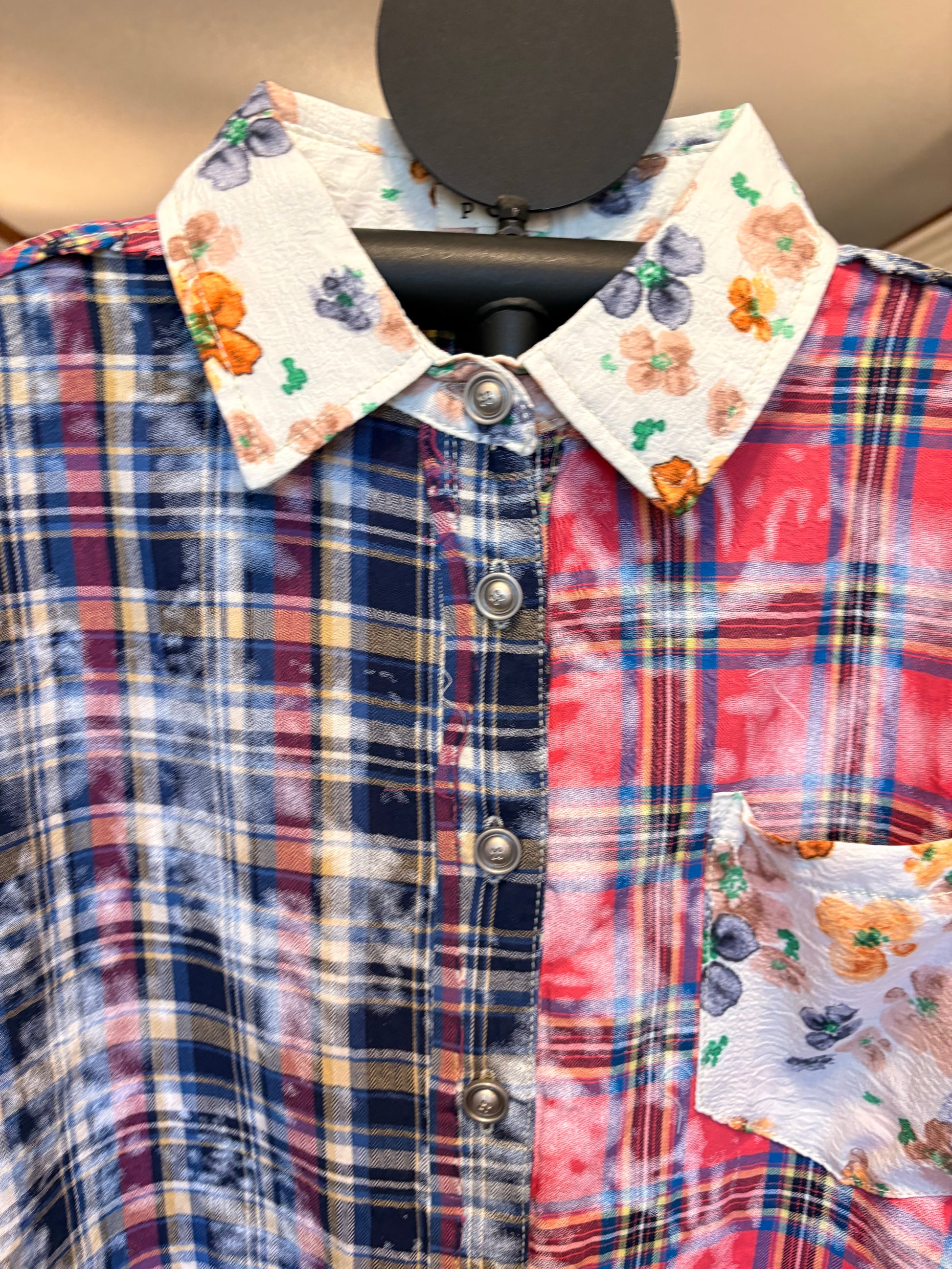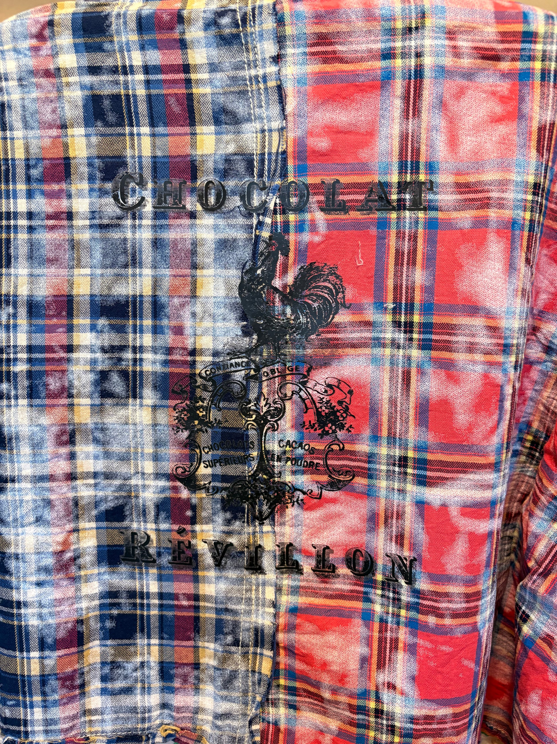 Inspired by Junk Journals. These tops are a collection of favorite things! Upcycled patchwork and frayed button down with vintage graphics design on the back. SEW many beautiful details ❤️