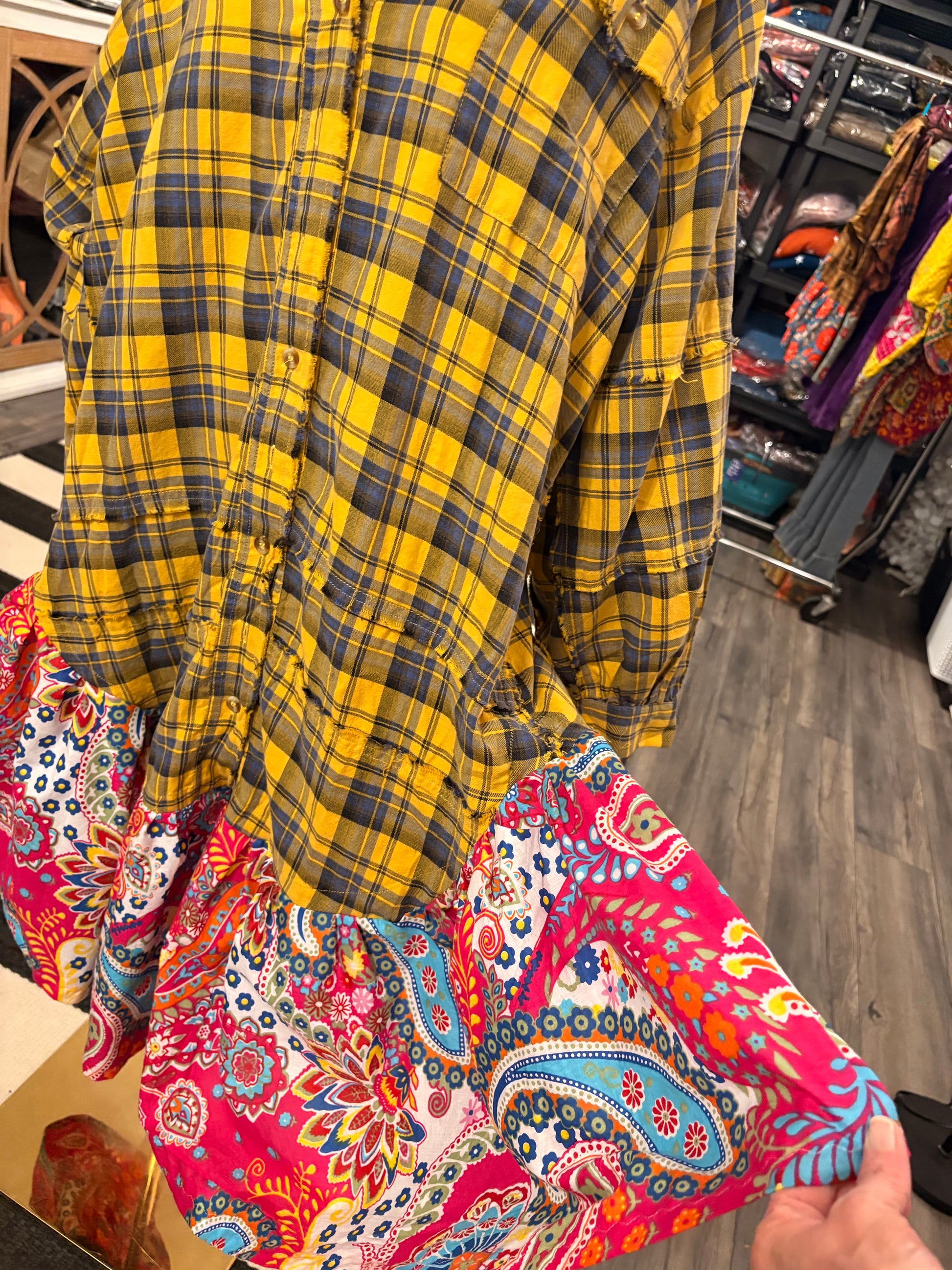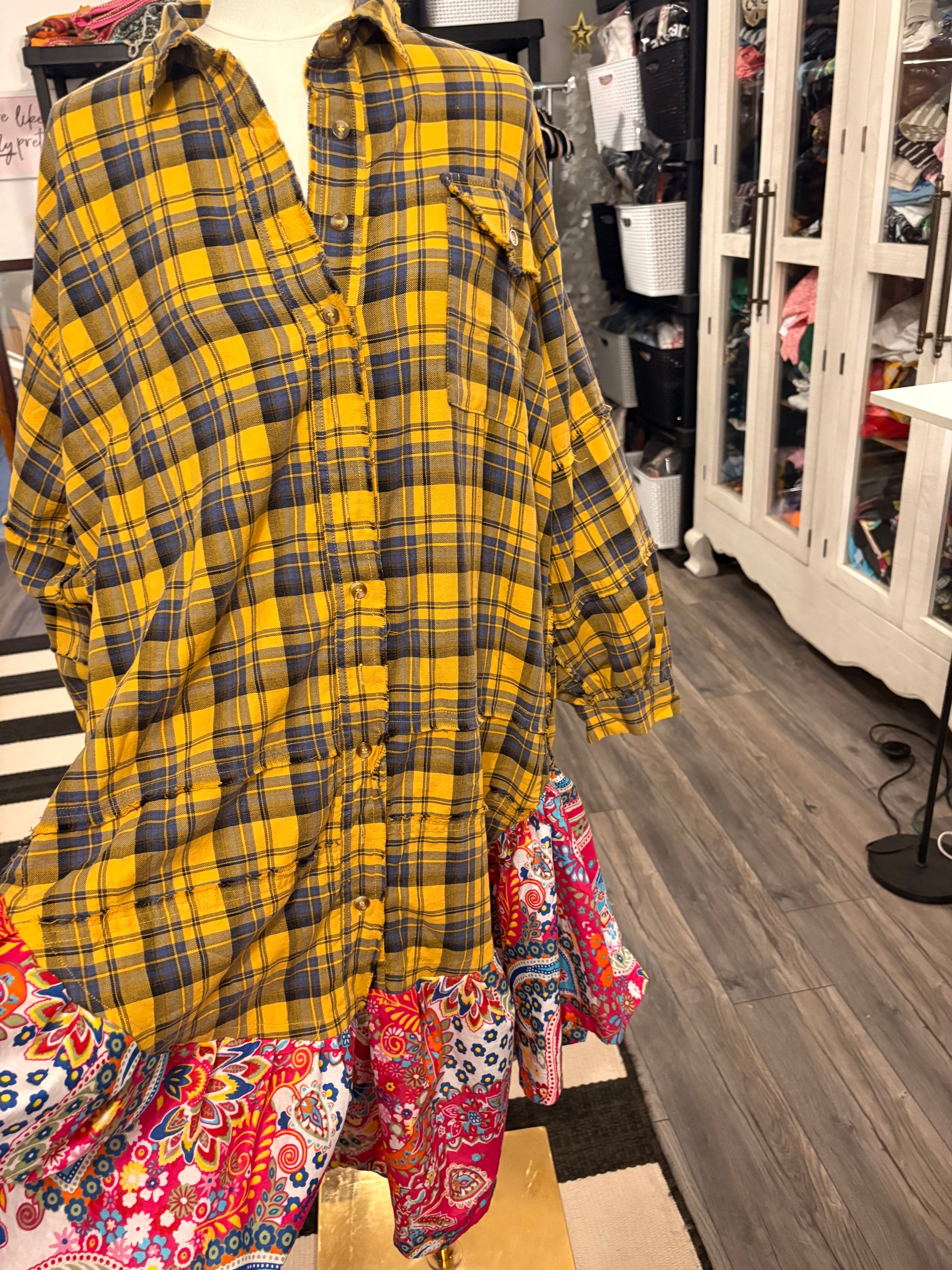 Upcycled boutique flannel and hand blocked cotton voile fabric used to create this super oversized and boot worthy dress or duster!! Long and cozy!! Can be worn with tights and boots or as a duster with jeans!!