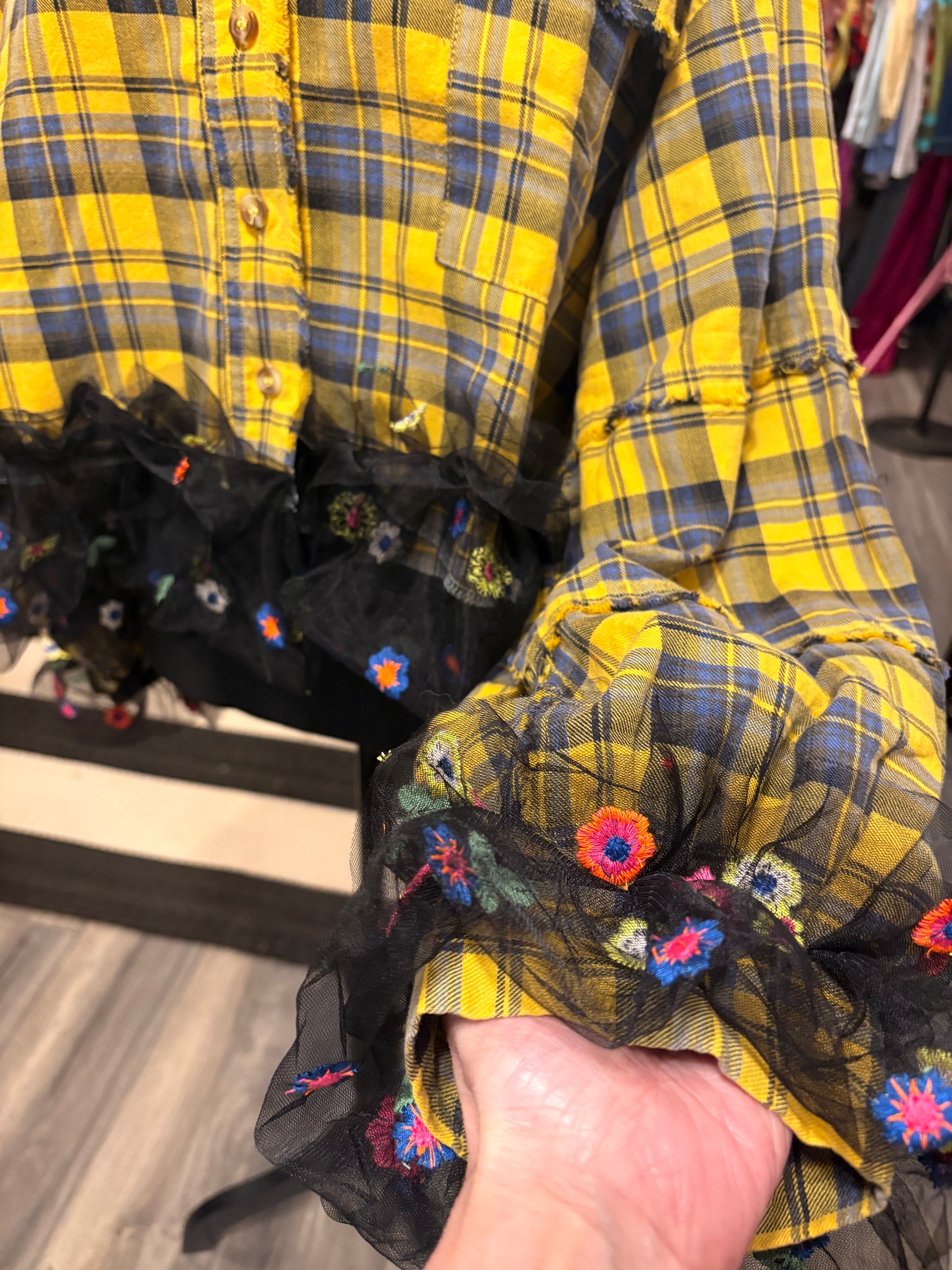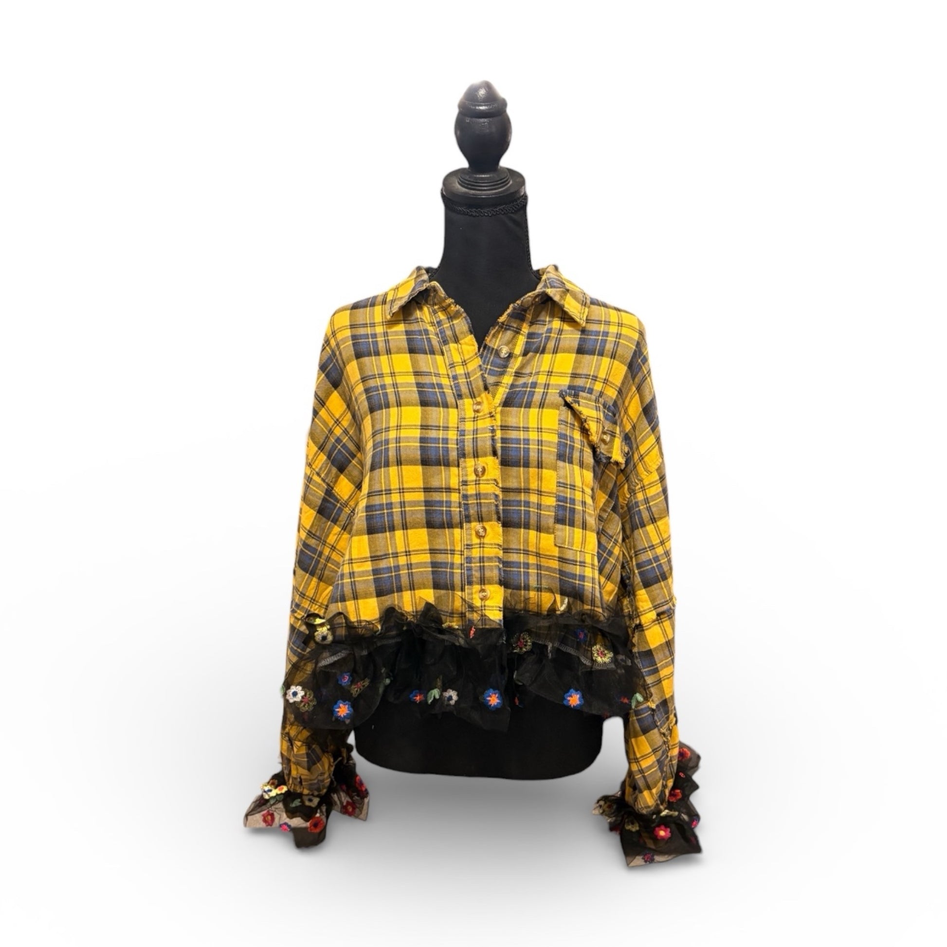 Upcycled boutique flannel and 3D embroidered mesh fabric used to create this FABULOUS cropped top!! Makes a great layering piece!!