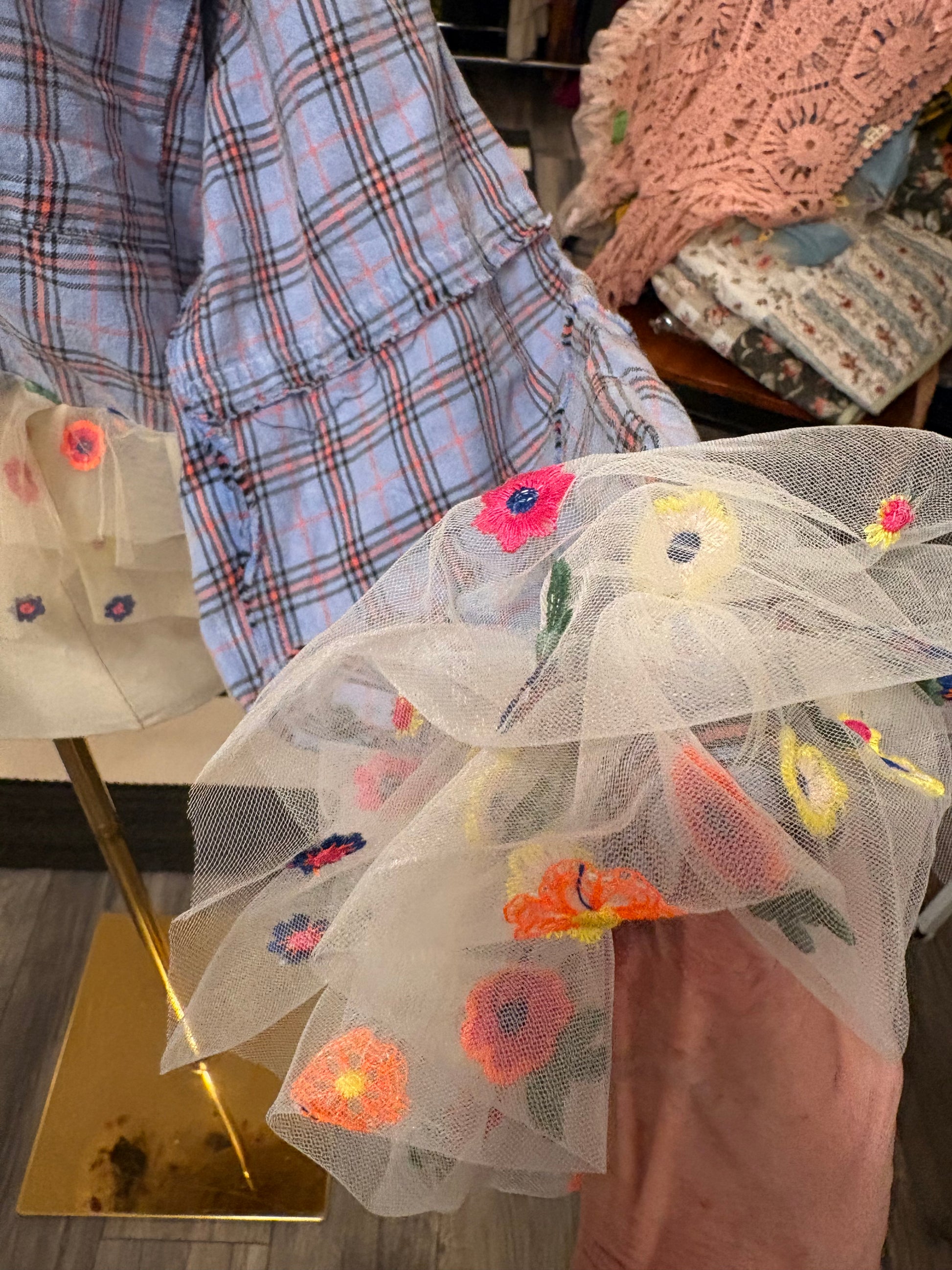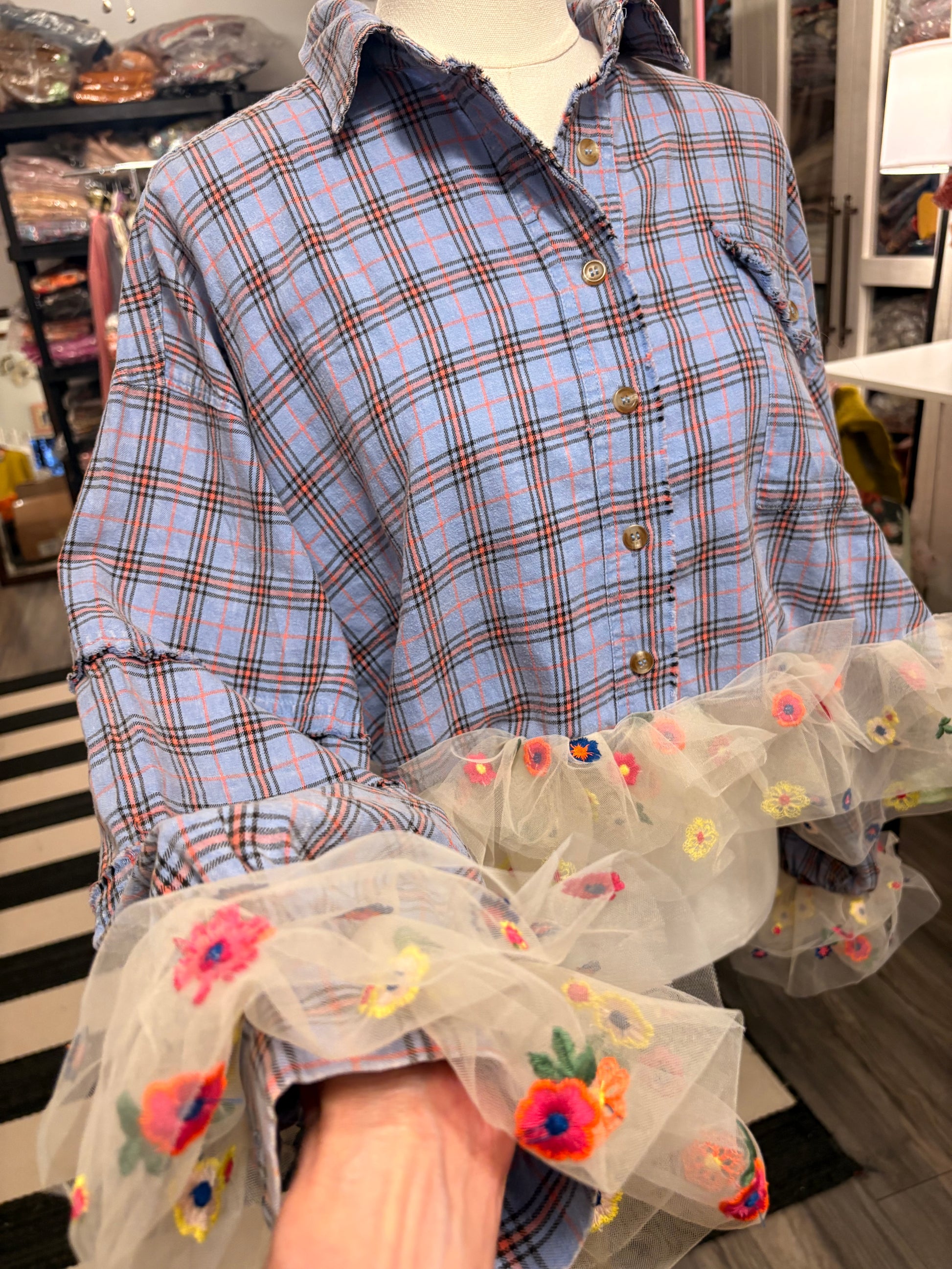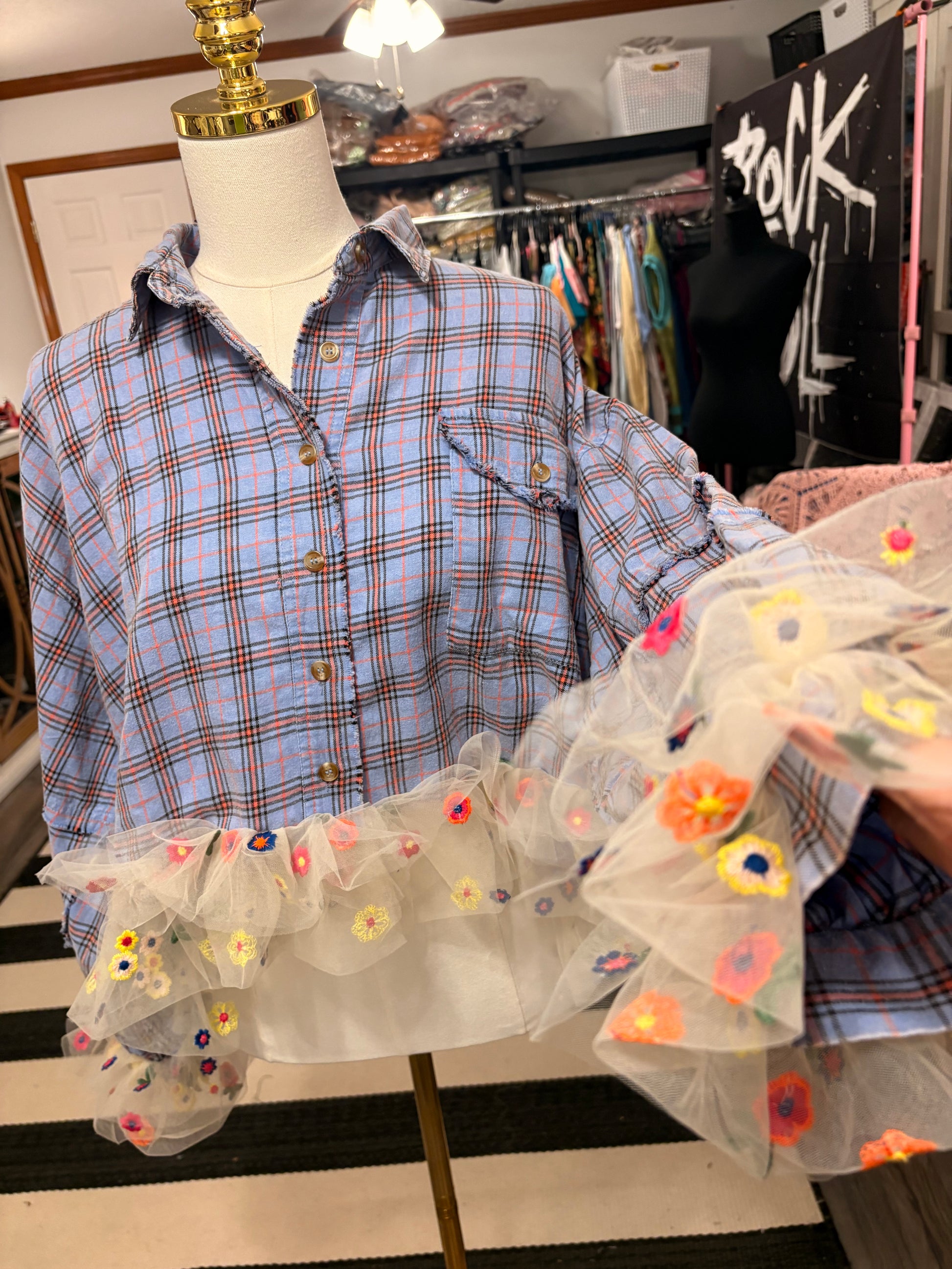 Upcycled boutique flannel and 3D embroidered mesh fabric used to create this FABULOUS cropped top!! Makes a great layering piece!!