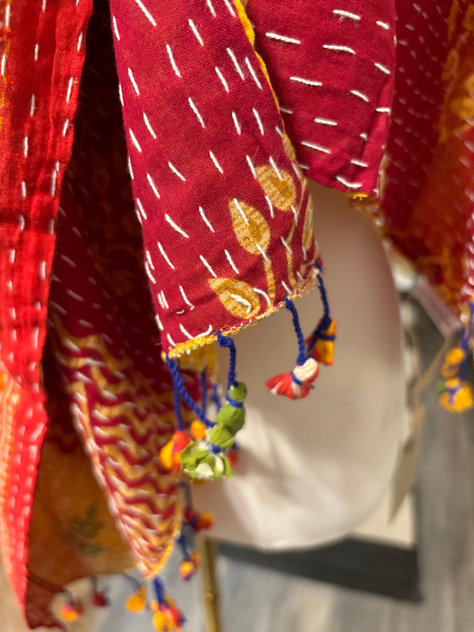 Our Cotton Kantha Scarves are handmade by women artisans in India using 100% cotton up-cycled saris. Each piece is unique and is made from two saris that are stitched together using the traditional “kantha” embroidery technique. • Featuring handmade tassels with vibrant prints and colors on each side, these handmade kantha scarves are works of art and showcase the rich textile crafts of India. • Comes in assorted colors and prints. -------------------------------- • Material: 100% Up-cycled Cotton • Color: Assorted • Shape: Rectangle • Care: Machine Wash in Cold Water • Dimensions: 18" x 70" --------------------------------