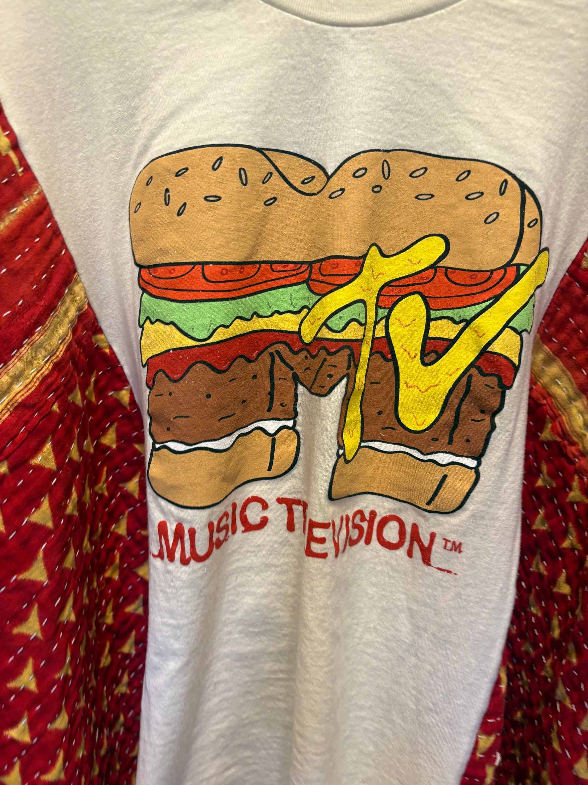 Beautiful vintage Kantha quilt and graphic tee paired to make this FABULOUS Upcycled tee. Vintage Kantha quilts have been well loved. They may have white strings (which can be cut) , slight holes, small stains,and may be weathered, rustic and tattered which all lends to the vintage beauty of the top. Perfectly imperfect!!