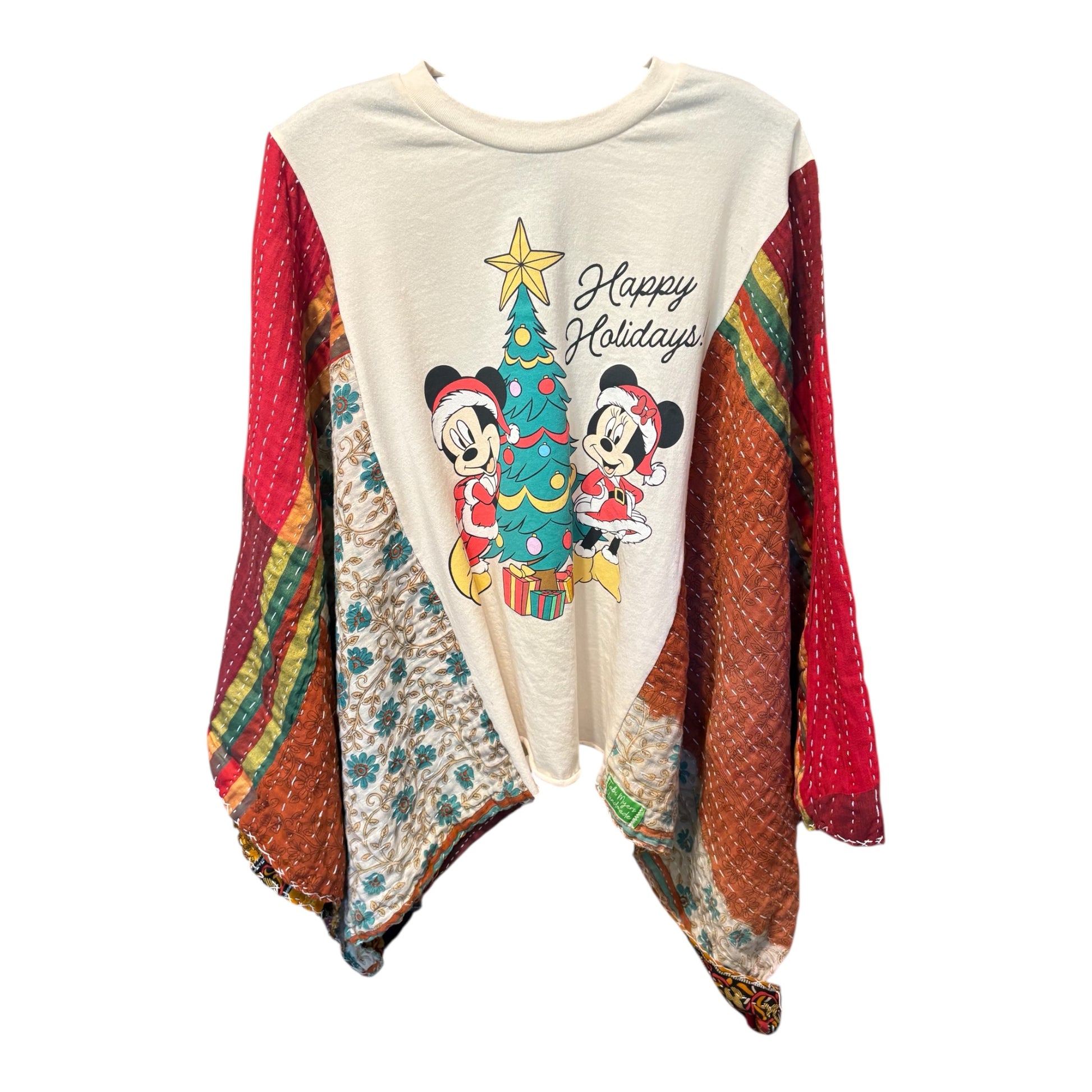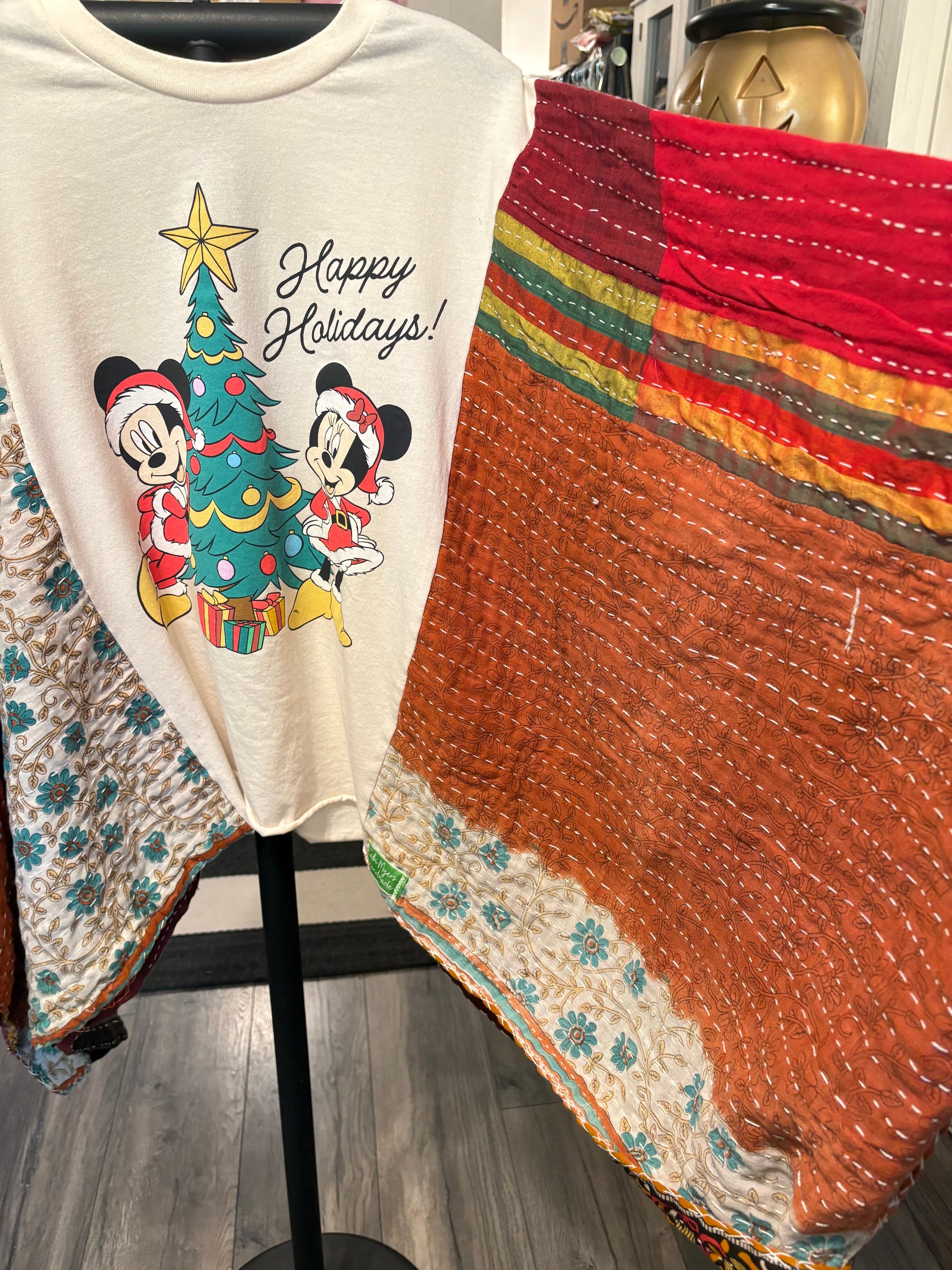 Beautiful vintage Kantha quilt and graphic tee paired to make this FABULOUS Upcycled tee. Vintage Kantha quilts have been well loved. They may have white strings (which can be cut) , slight holes, small stains,and may be weathered, rustic and tattered which all lends to the vintage beauty of the top. Perfectly imperfect!!
