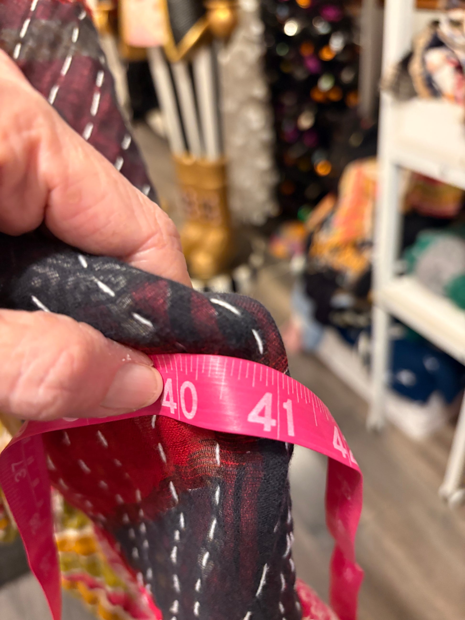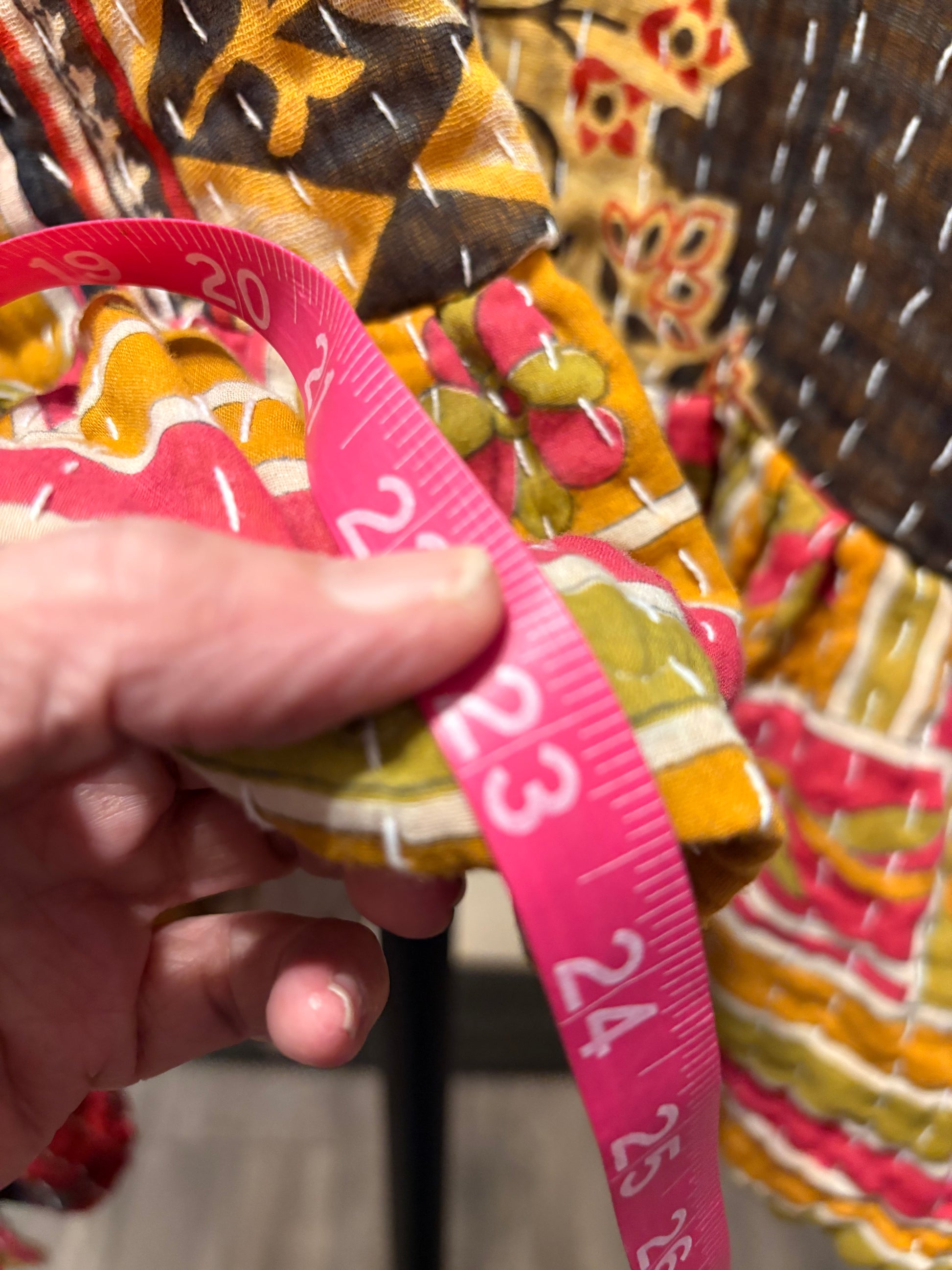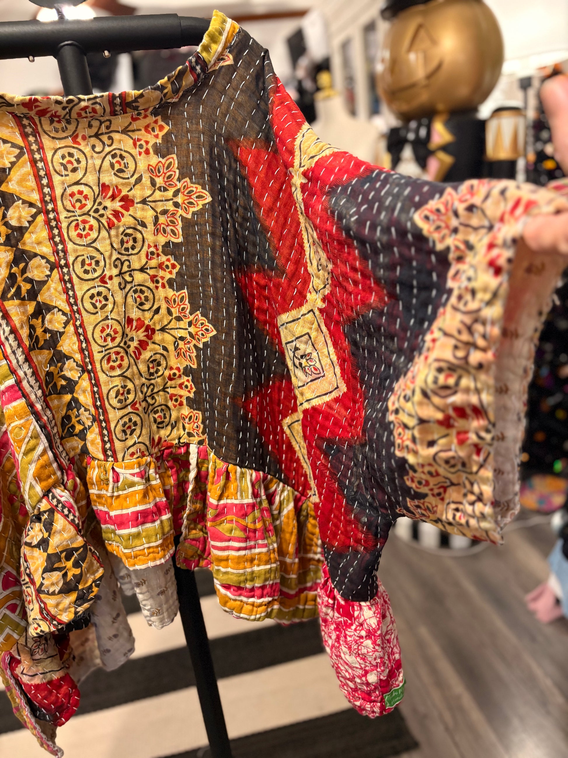 Upcycled Vintage Kantha Quilt used to make this super FABULOUS ART Layering top. Looks great layered over anything!!! Long cropped, side shoulder wide droop neckline and ruffles!! Please check measurements before purchasing!! Will be more oversized the smaller you are. (Small to large will fit side shoulder)