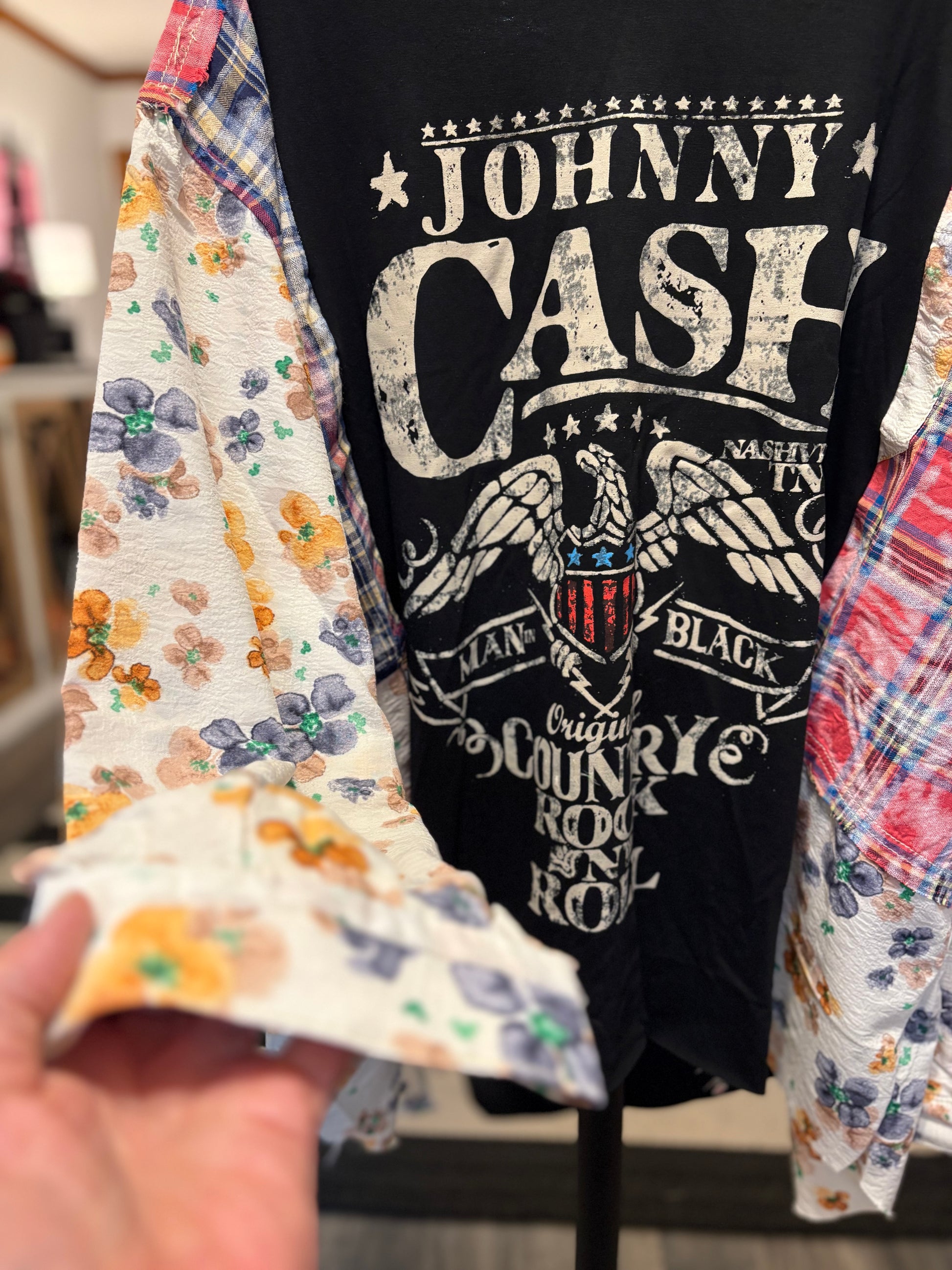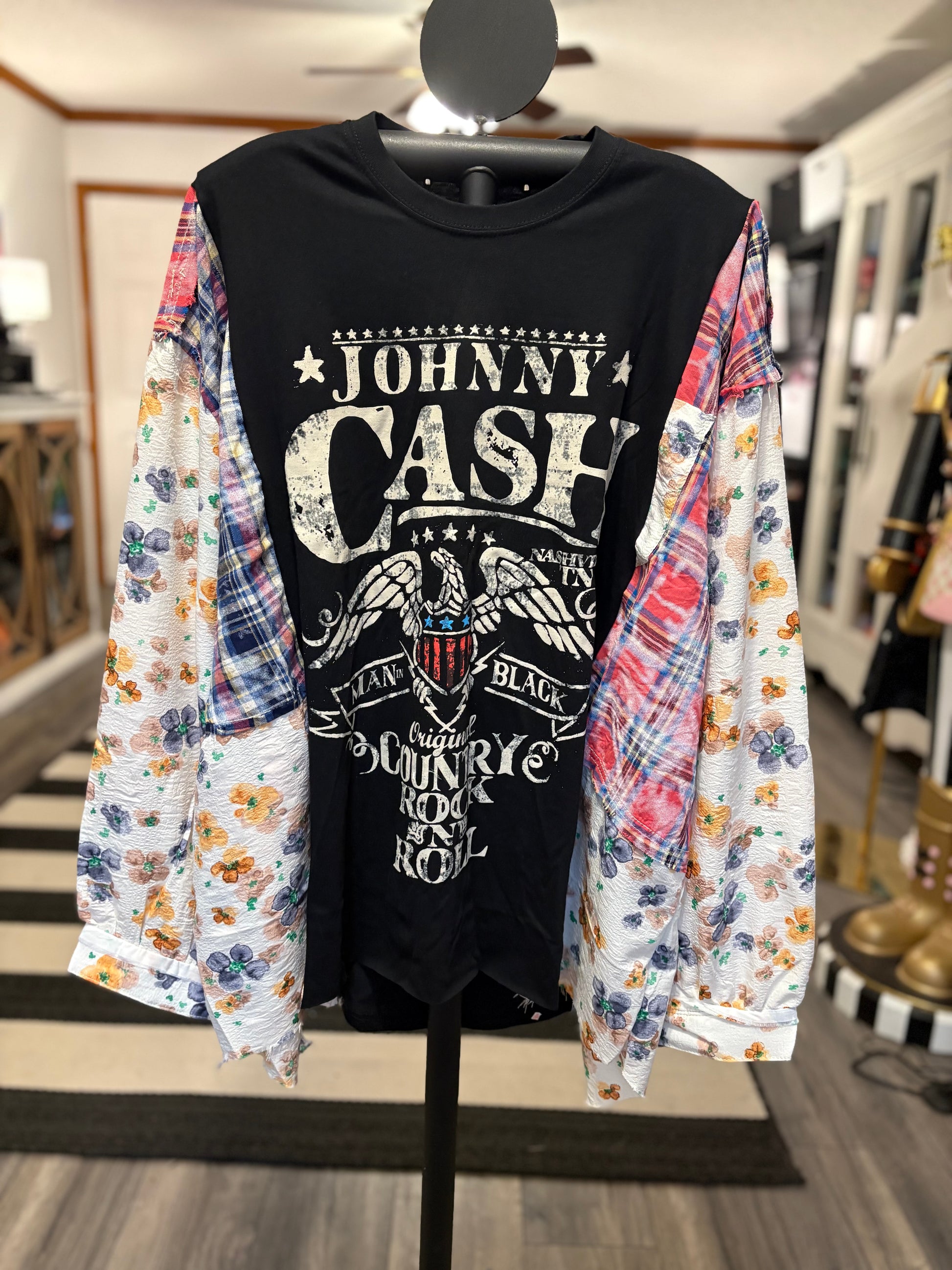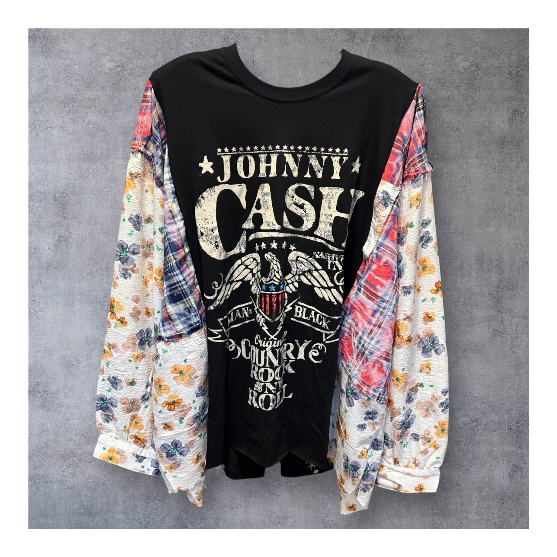 This unique drop sleeve top combines a vintage or upcycled fabric with a graphic tee design to create a sustainable, one-of-a-kind piece. With a relaxed oversized silhouette and long drop sleeves, it’s a comfortable and stylish layering option for casual outfits, streetwear, or cozy lounge looks.