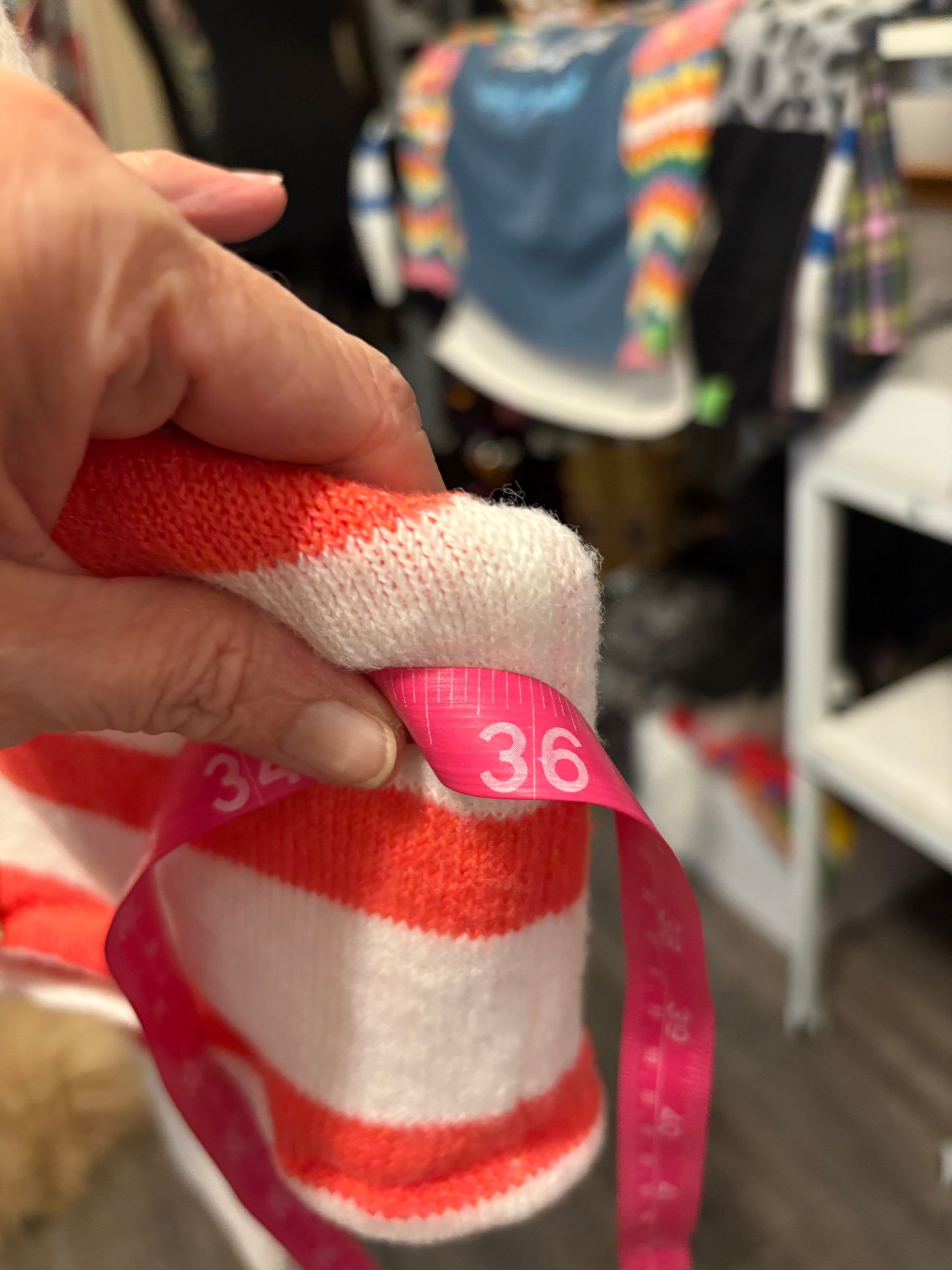 Sleeves are made from black ribbed knit sweater fabric and white thread.