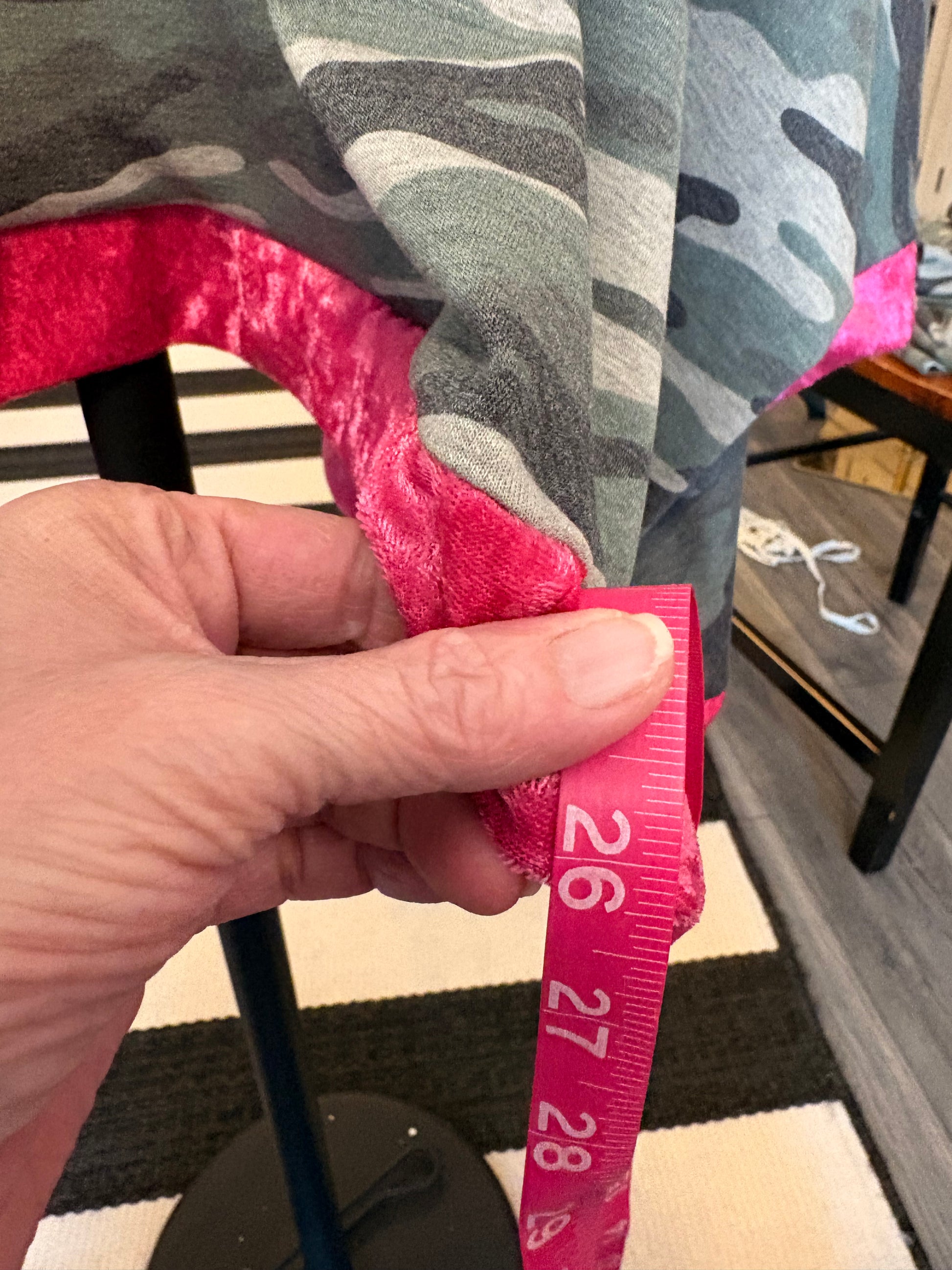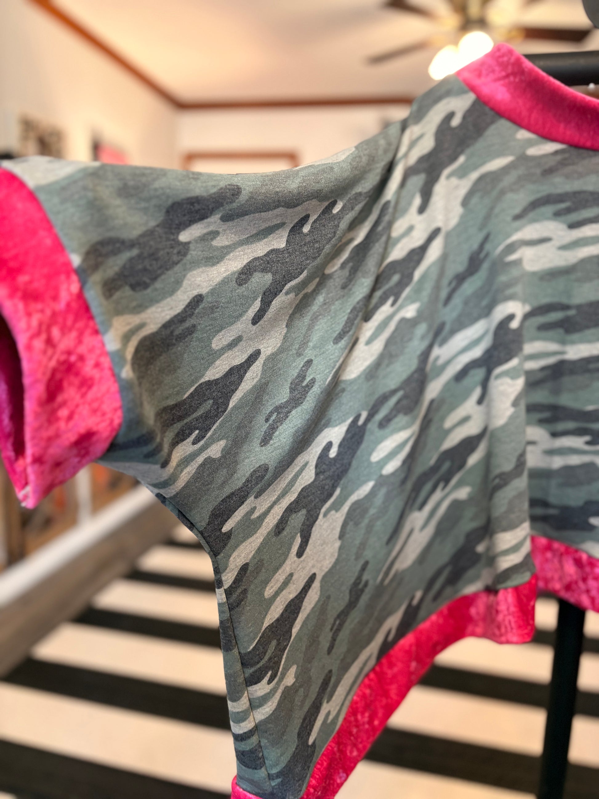 This top is MAGNIFICENT!! Crushed Velvet and Camo Terry Knit fabric used to make this super comfortable top! Short length so you can layer with flannels, tanks, sweaters, and dresses! Wide neckline for easy off and on! Flowy and FABULOUS!! Very OVERSIZED! This top will be more oversized the smaller you are!! Please check measurements!