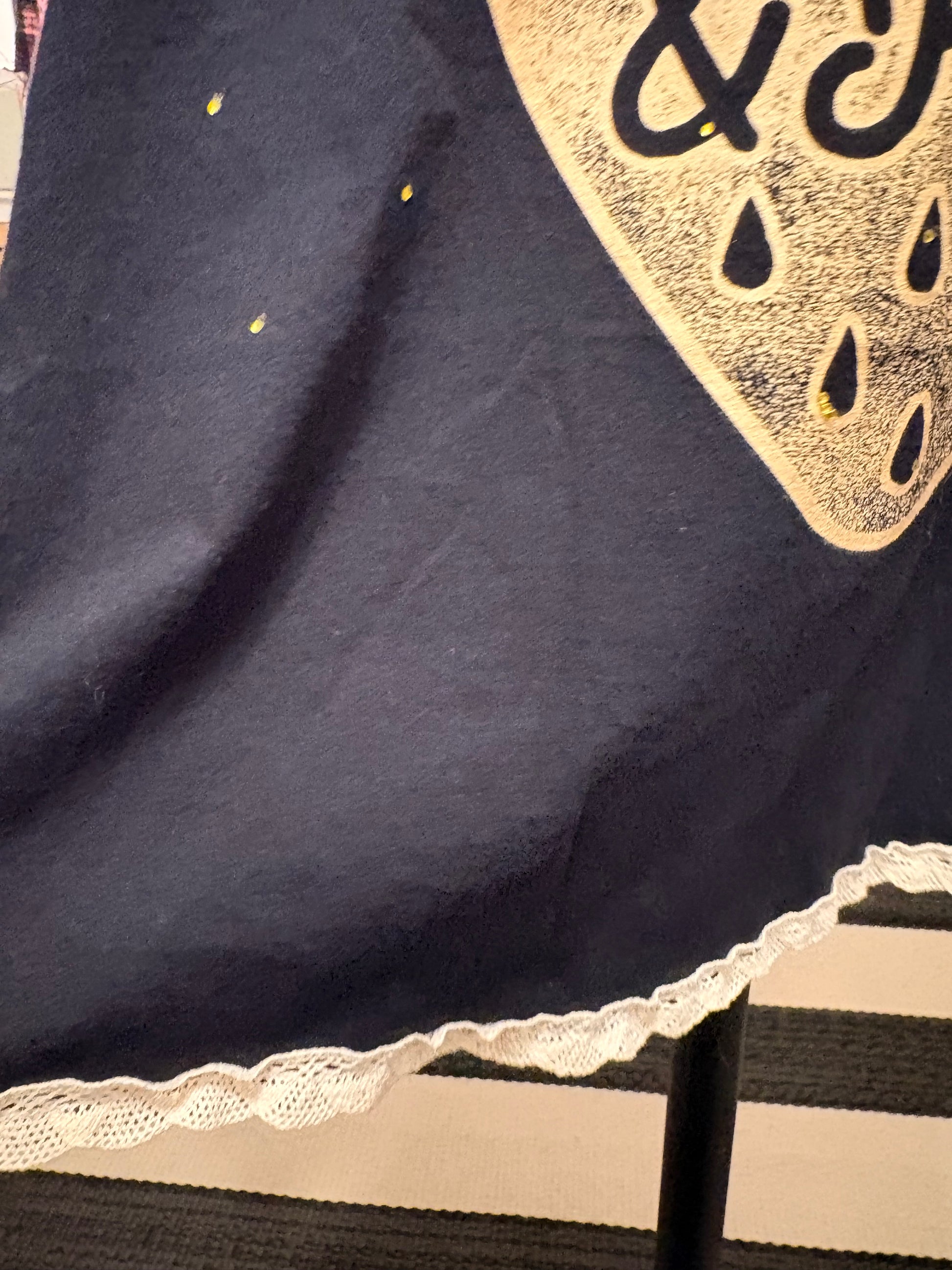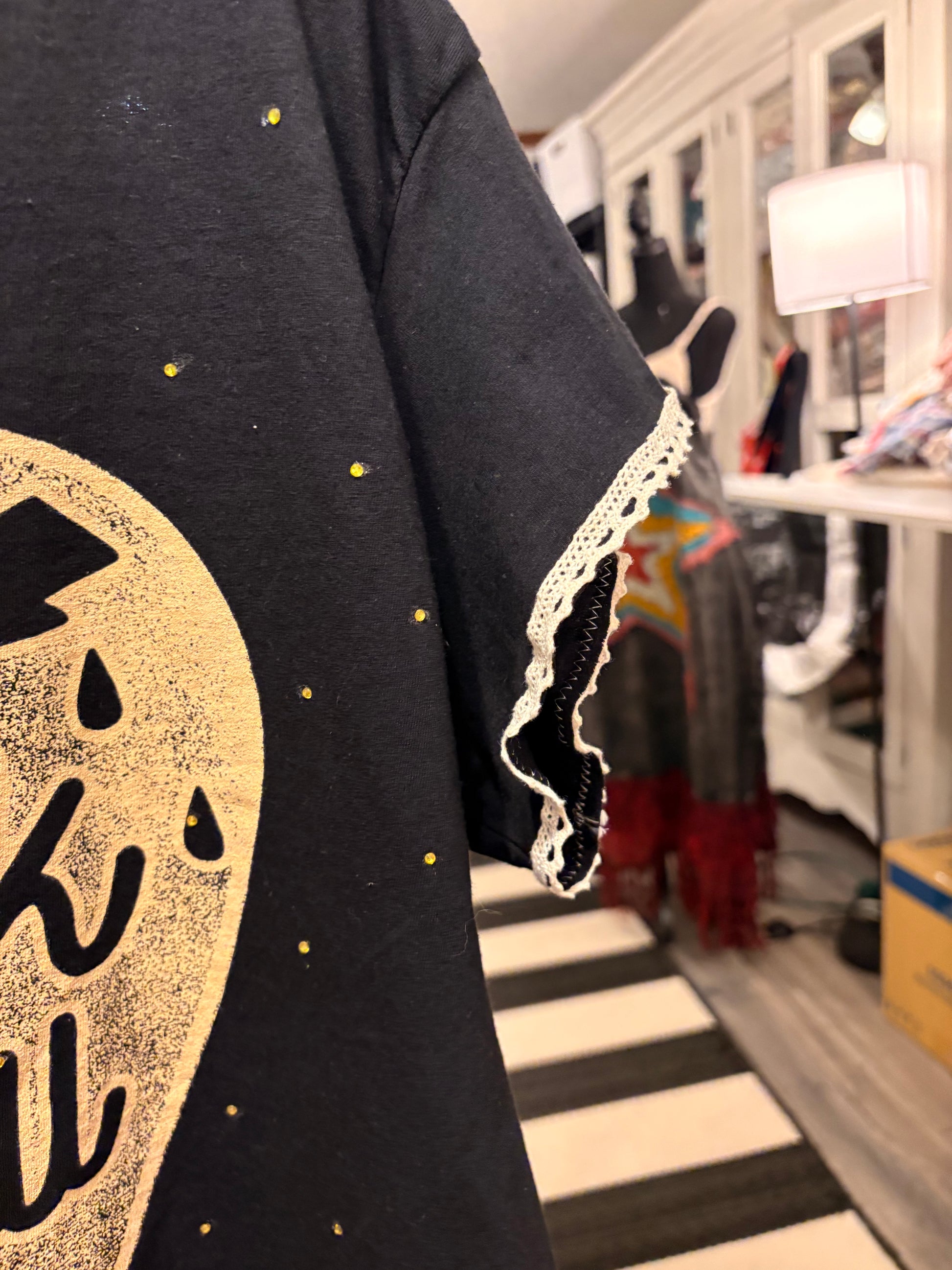 Pretty little tees! Upcycled rock tee adorned with rhinestones and crochet trim. Comfortable and beautiful!! SEW many beautiful details ❤️ Shirt used is an Large