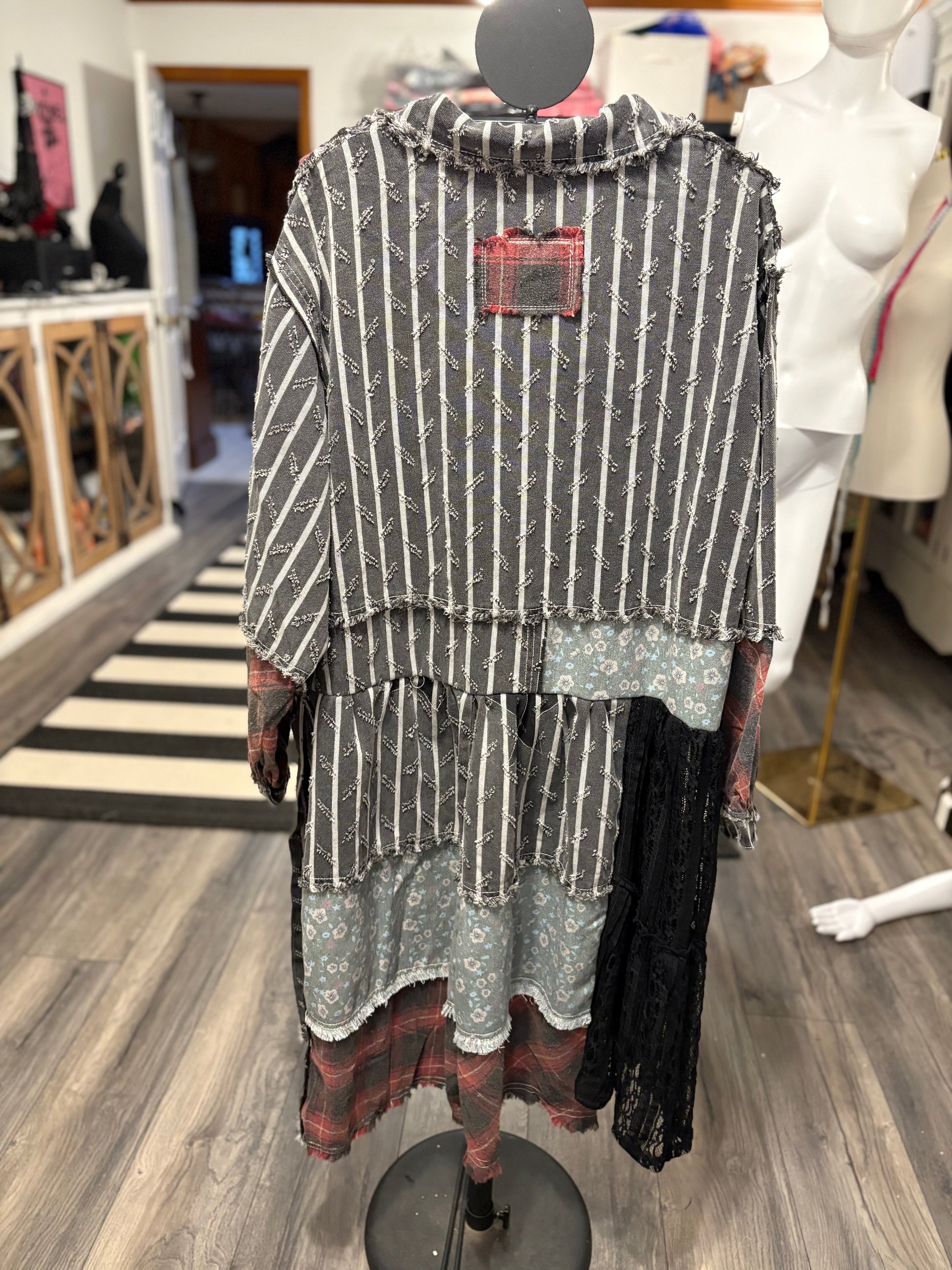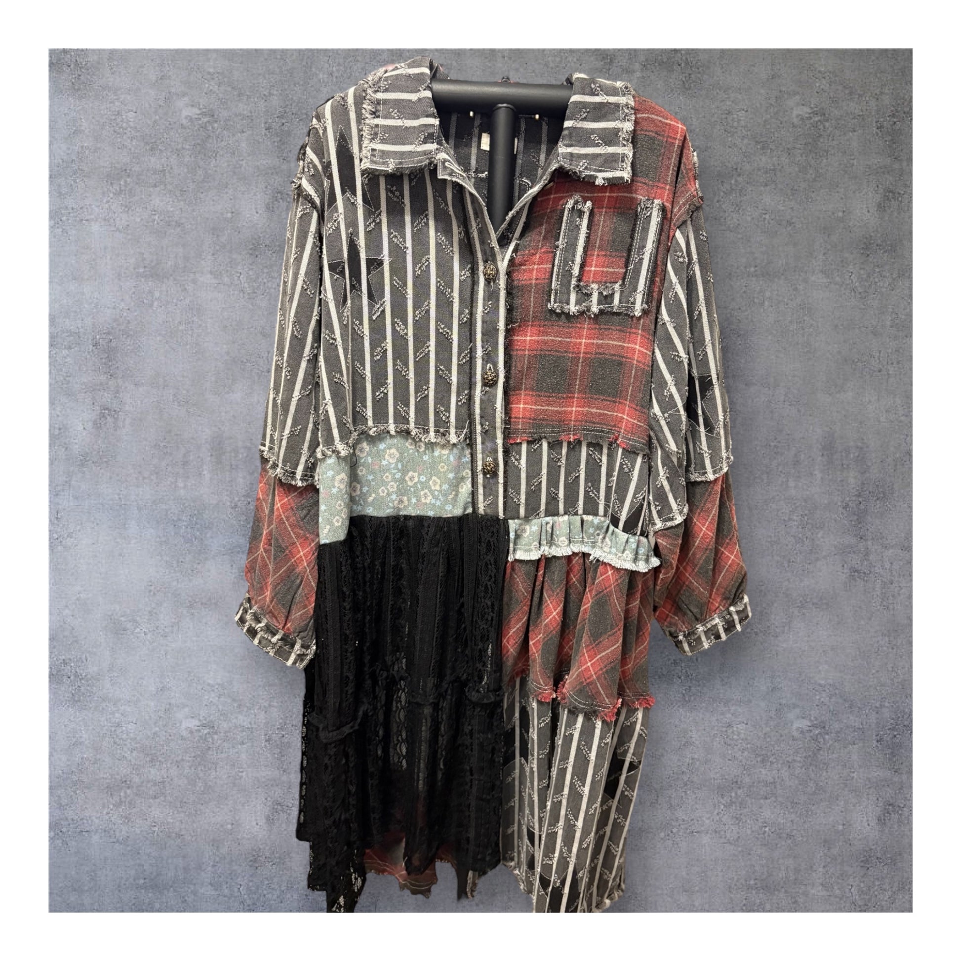 Upcycled denim and star parch work duster and lace combined to create this incredible patchwork creation!! Can be worn as a dress or long shirt. The Love, Tabi Collection are all handmade, original, one of a kind designs!!! Please check measurements before purchasing!! One size fits most!! Super Oversized! Asymmetrical hem!