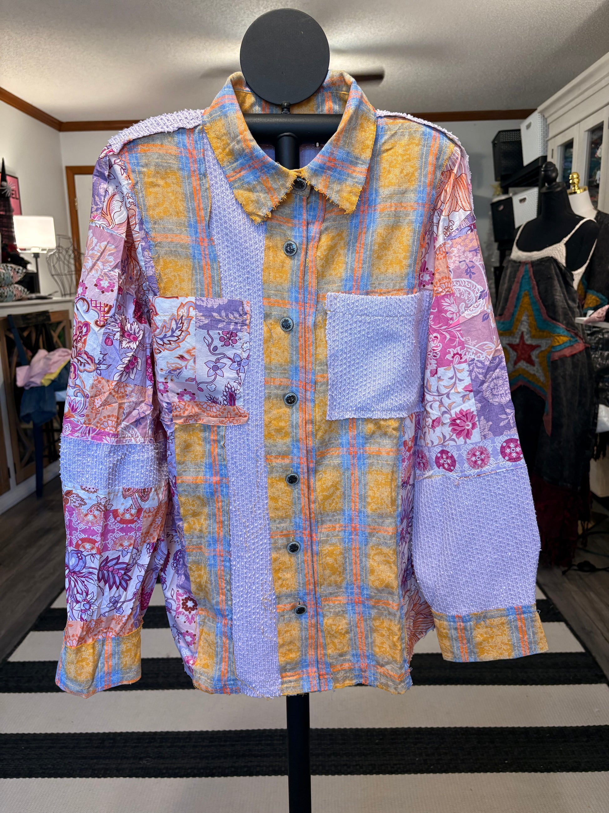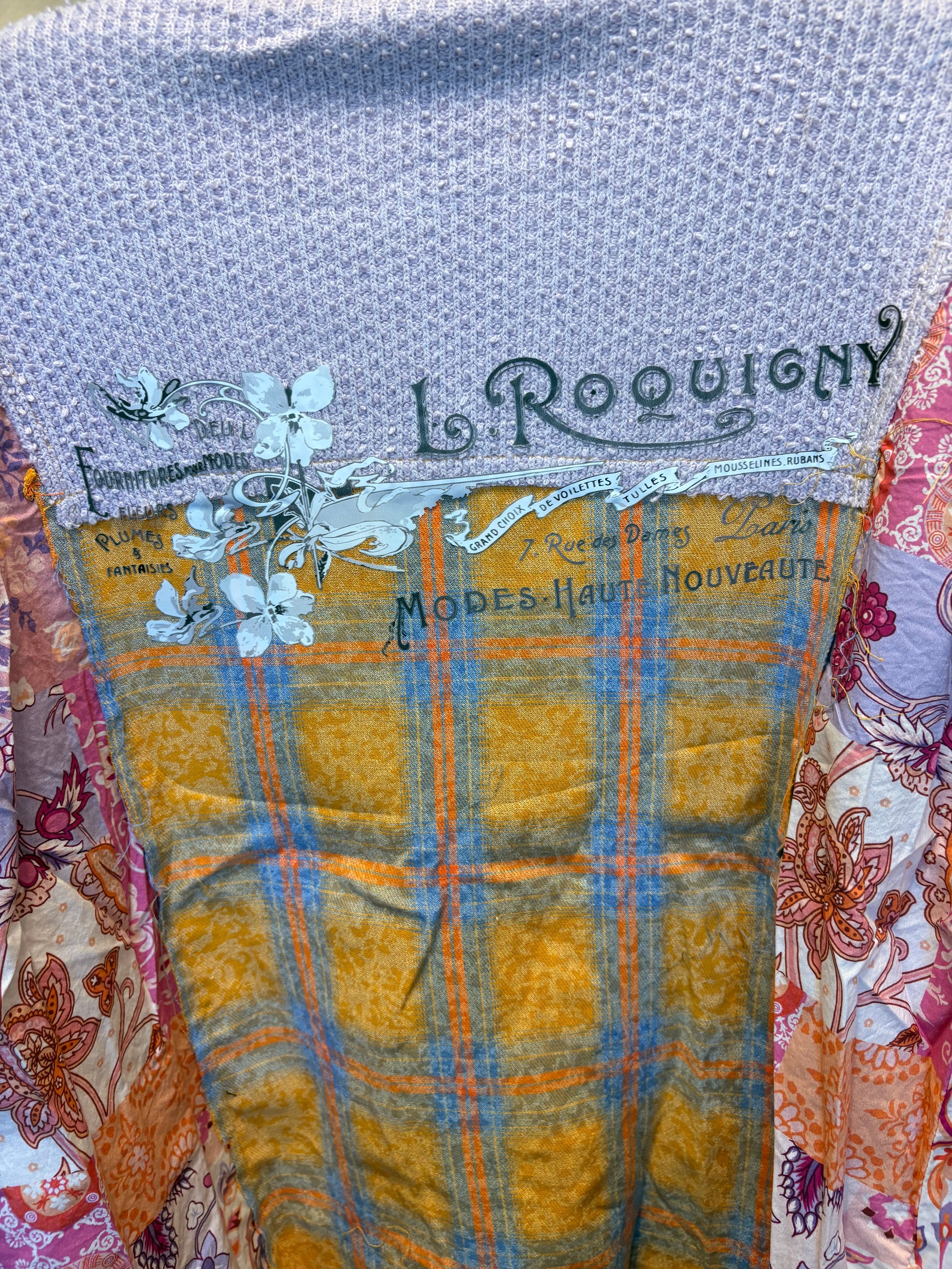 Inspired by Junk Journals.  These tops are a collection of favorite things! Upcycled patchwork and frayed button down with vintage graphics design on the back. SEW many beautiful details ❤️