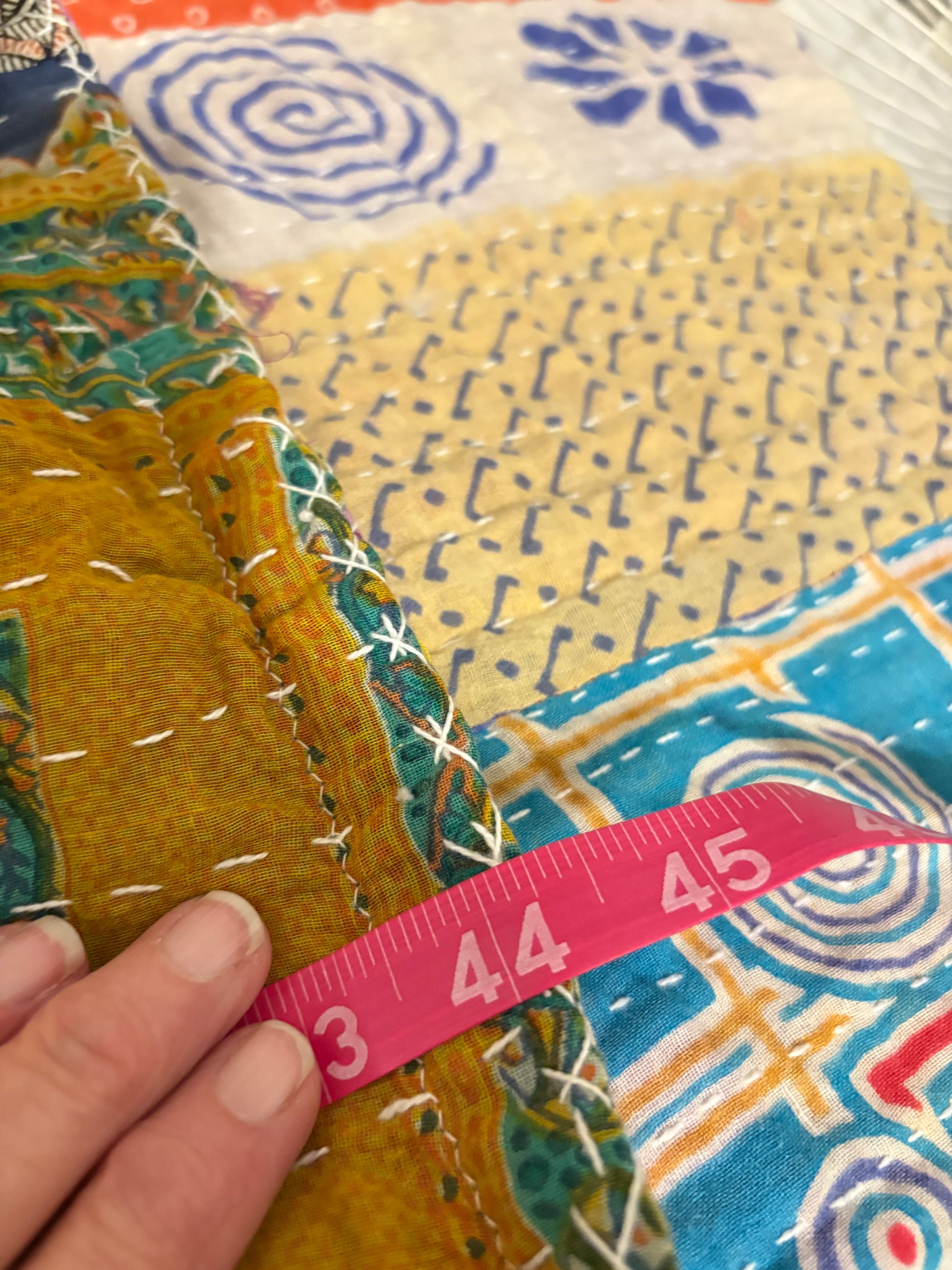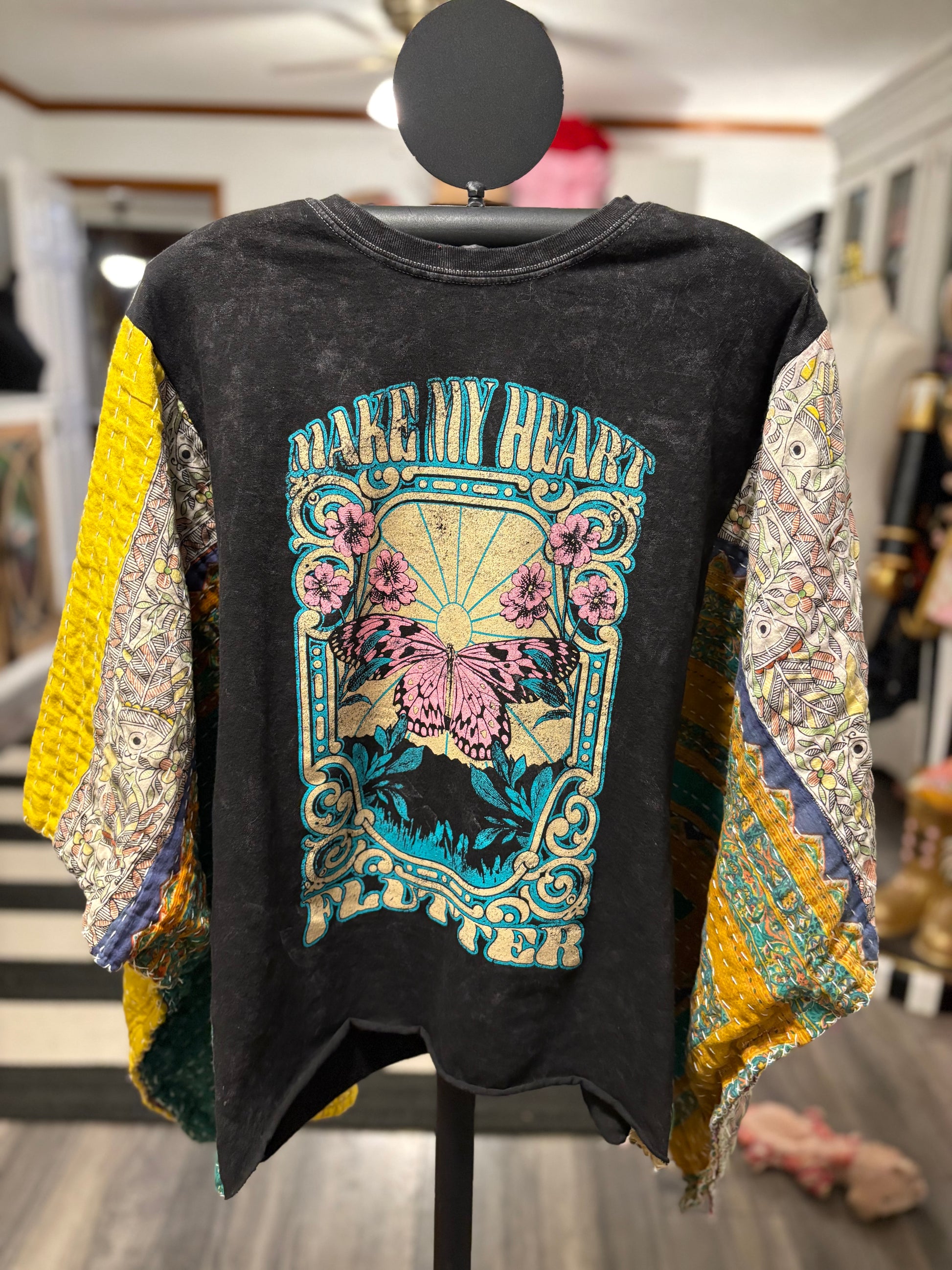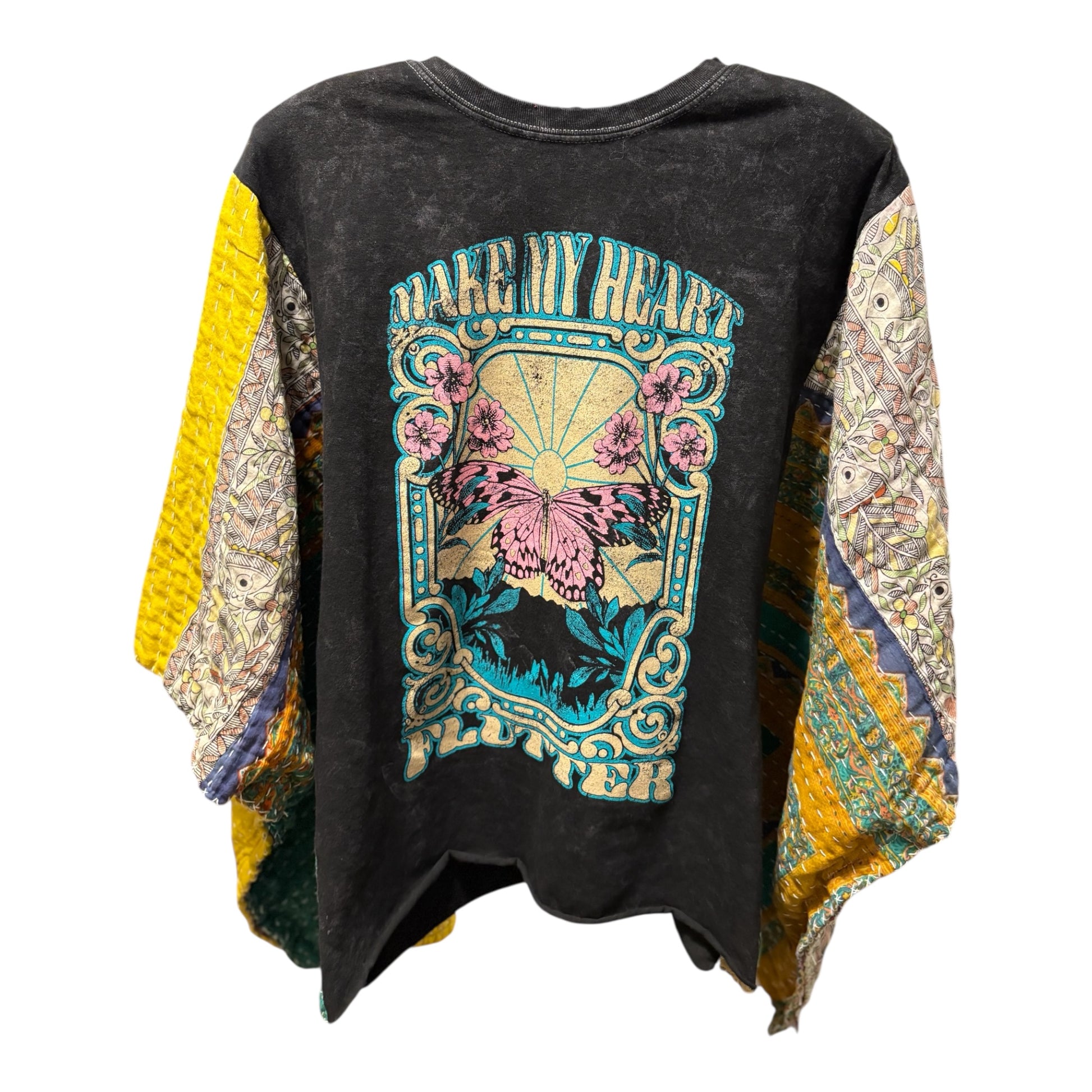 Beautiful vintage Kantha quilt and graphic tee paired to make this FABULOUS Upcycled tee. Vintage Kantha quilts have been well loved. They may have white strings (which can be cut) , slight holes, small stains,and may be weathered, rustic and tattered which all lends to the vintage beauty of the top. Perfectly imperfect!!