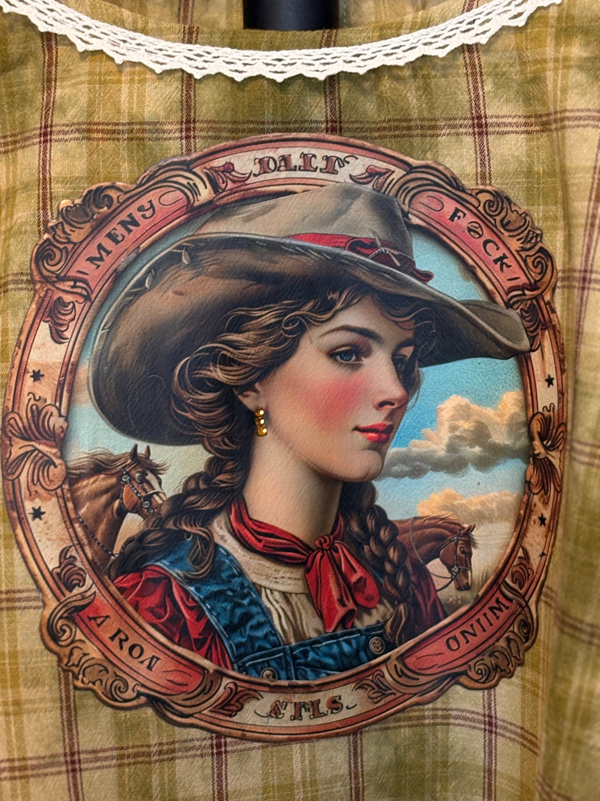 Upcycled plaid top with ruffled sleeves, and bottom. Vintage graphic image and crochet details. Size 2X can fit a 3X also.. oversized fit.
