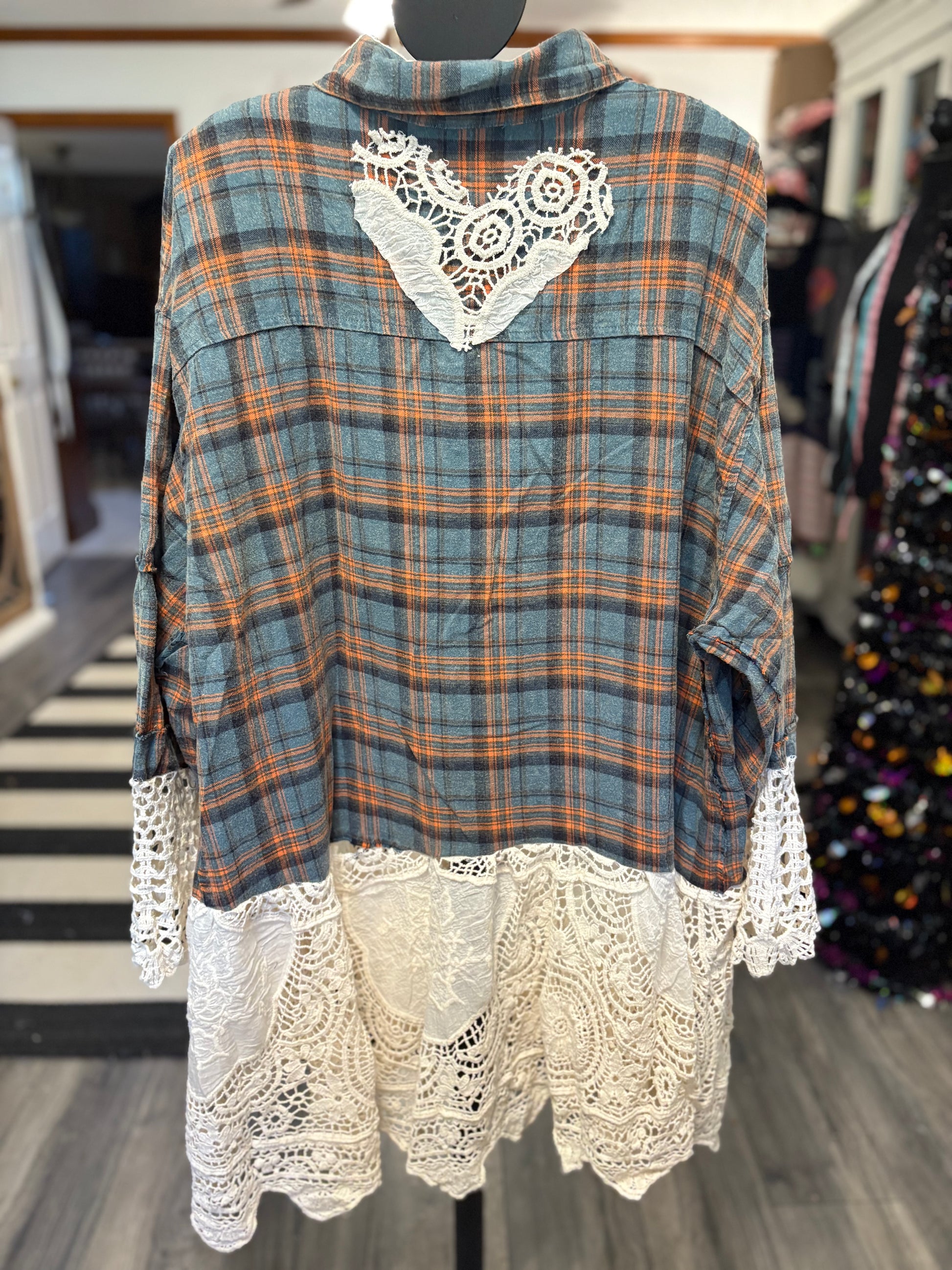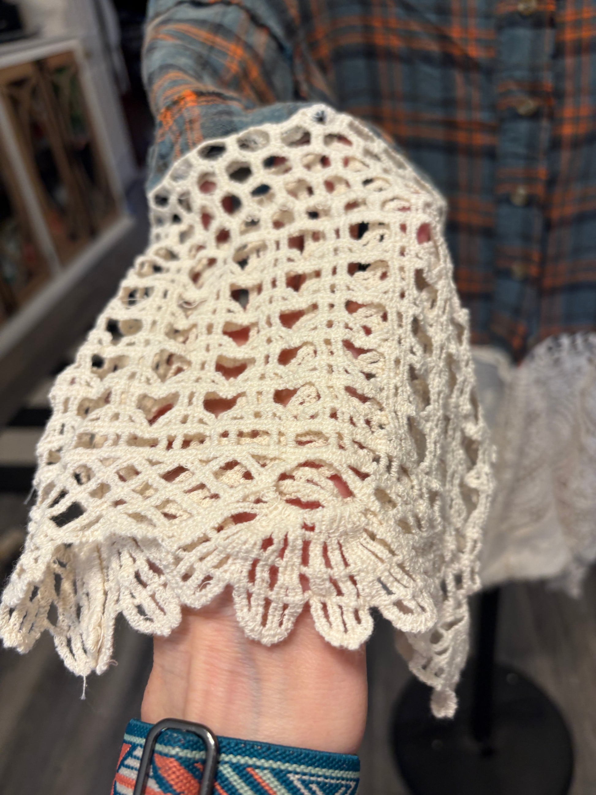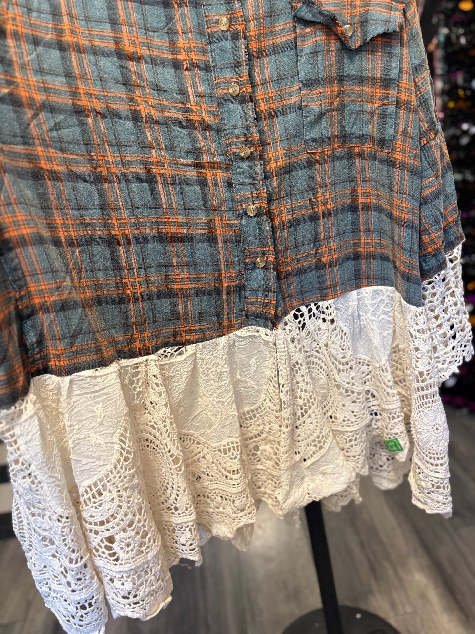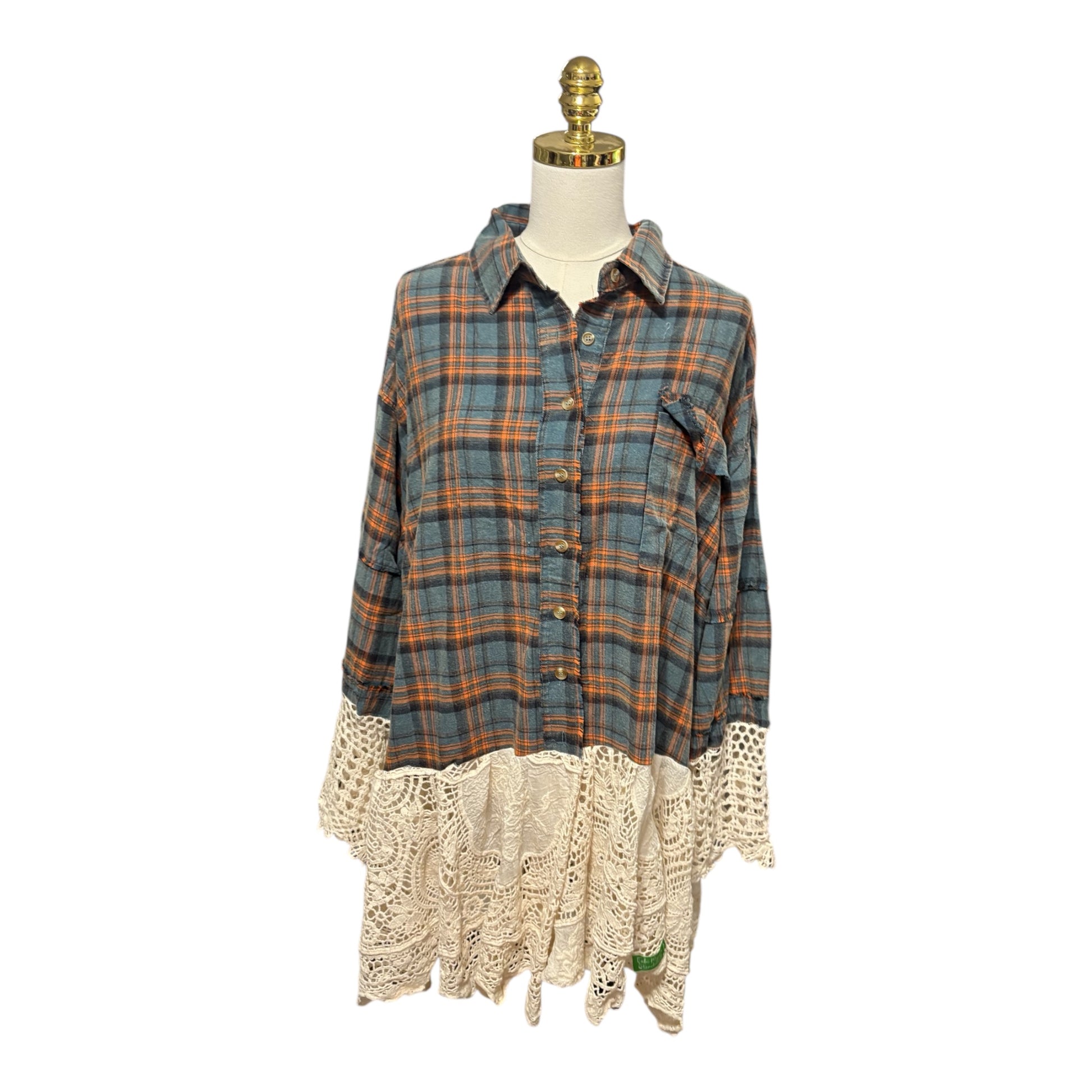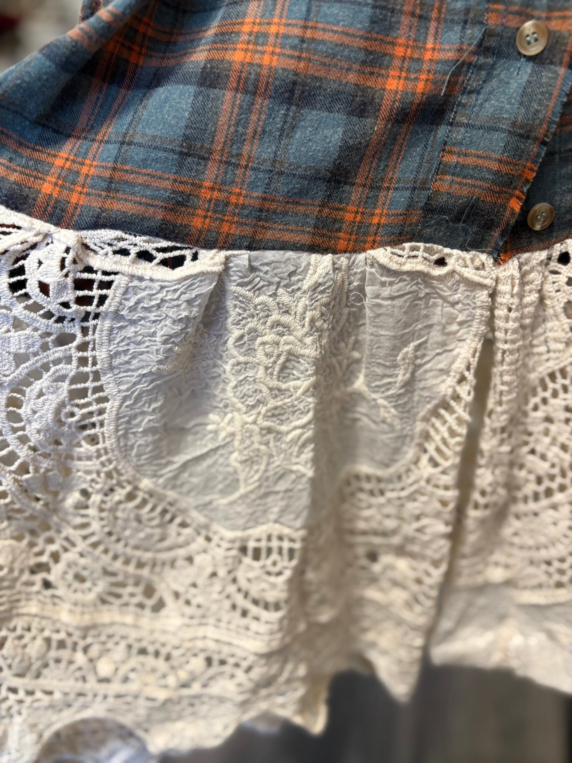 Introducing our brand new line of Patchwork Love Tabi Signature Dresses. Each dress is made from boutique dresses, featuring ruffles, tulle, lace, and crochet details. Each piece is completely unique and handmade!! Shop the Love Tabi collection now. One-2 dresses will be added daily! This dress is patchworked with a crochet and tulle dress, netting, lace, linen, embroidered knit top and Easel Plaid Flannel with pockets. Shirt used is a 1X can fit a Small to XXL Comfortably.. Oversized the smaller you are!!