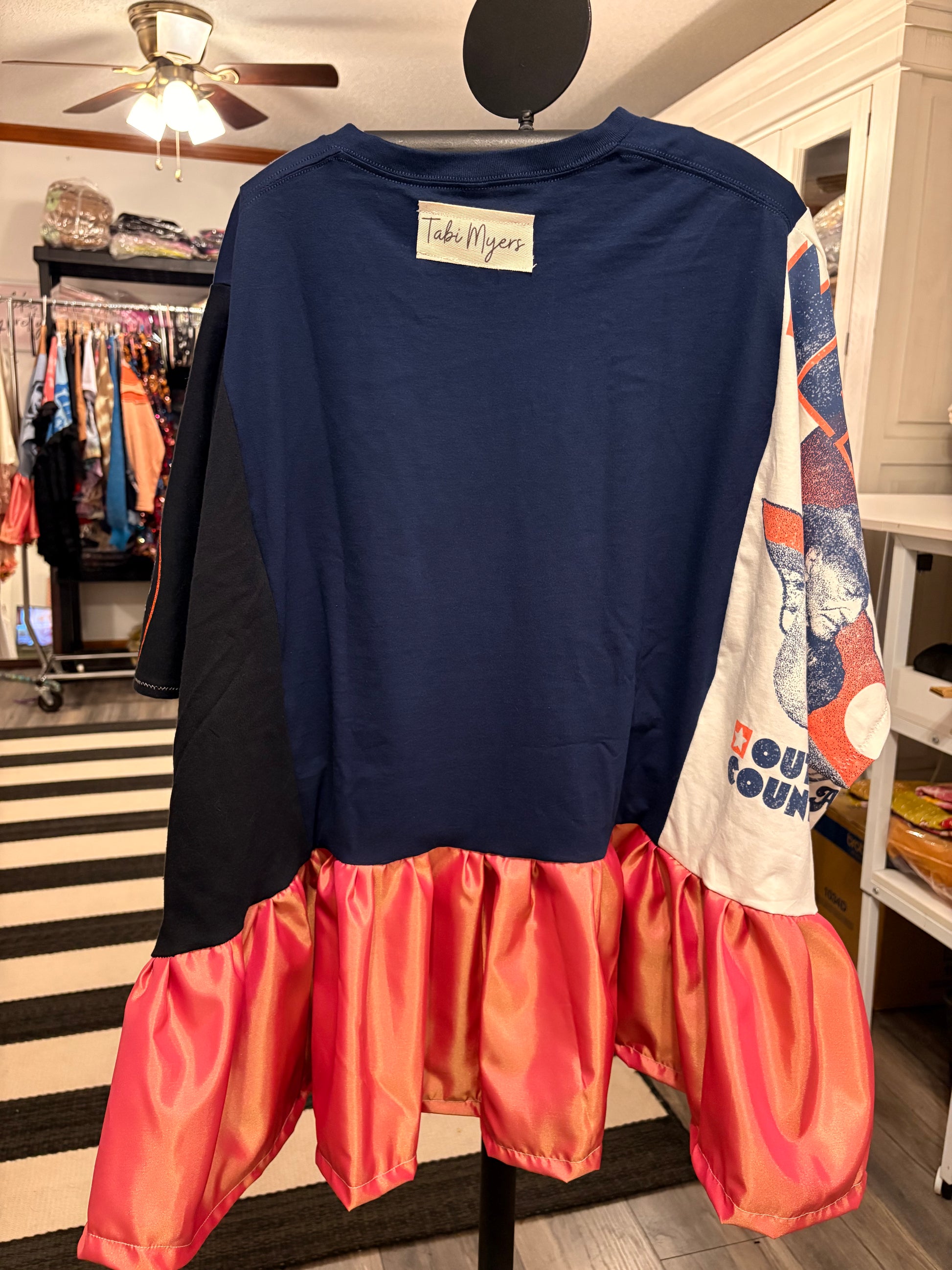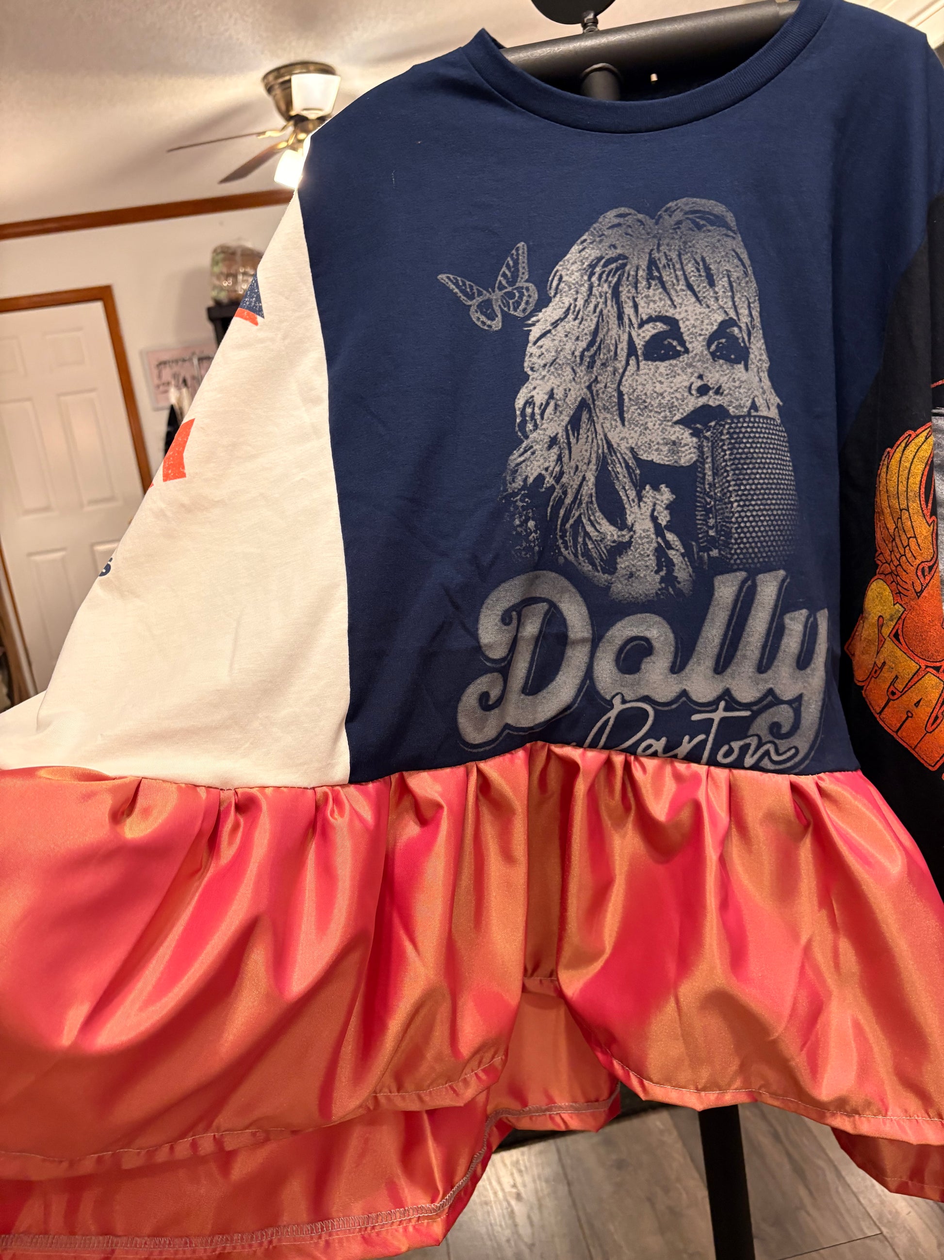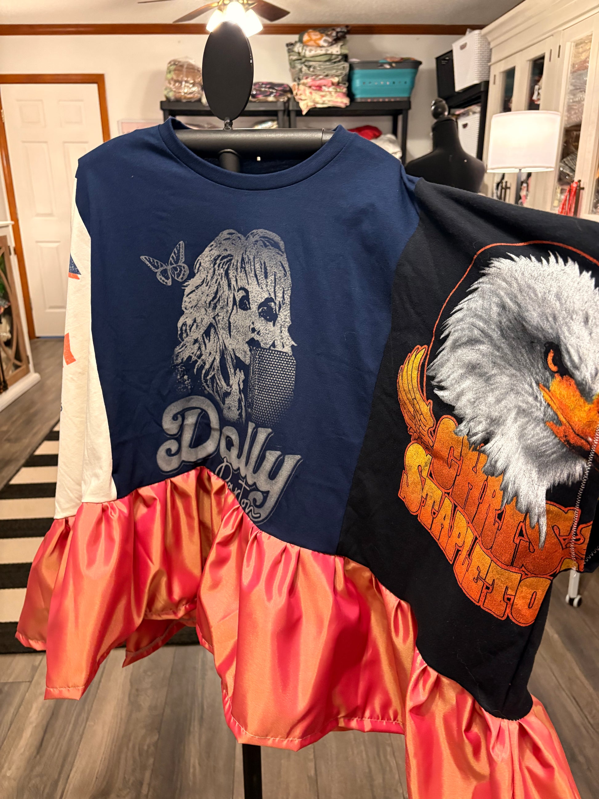 3 Upcycled graphic tees and 4 yards of silk tafetta used to make this FABULOUS ROCKSTAR top. Looks great with absolutely everything! You will ROCK this!!!❤️