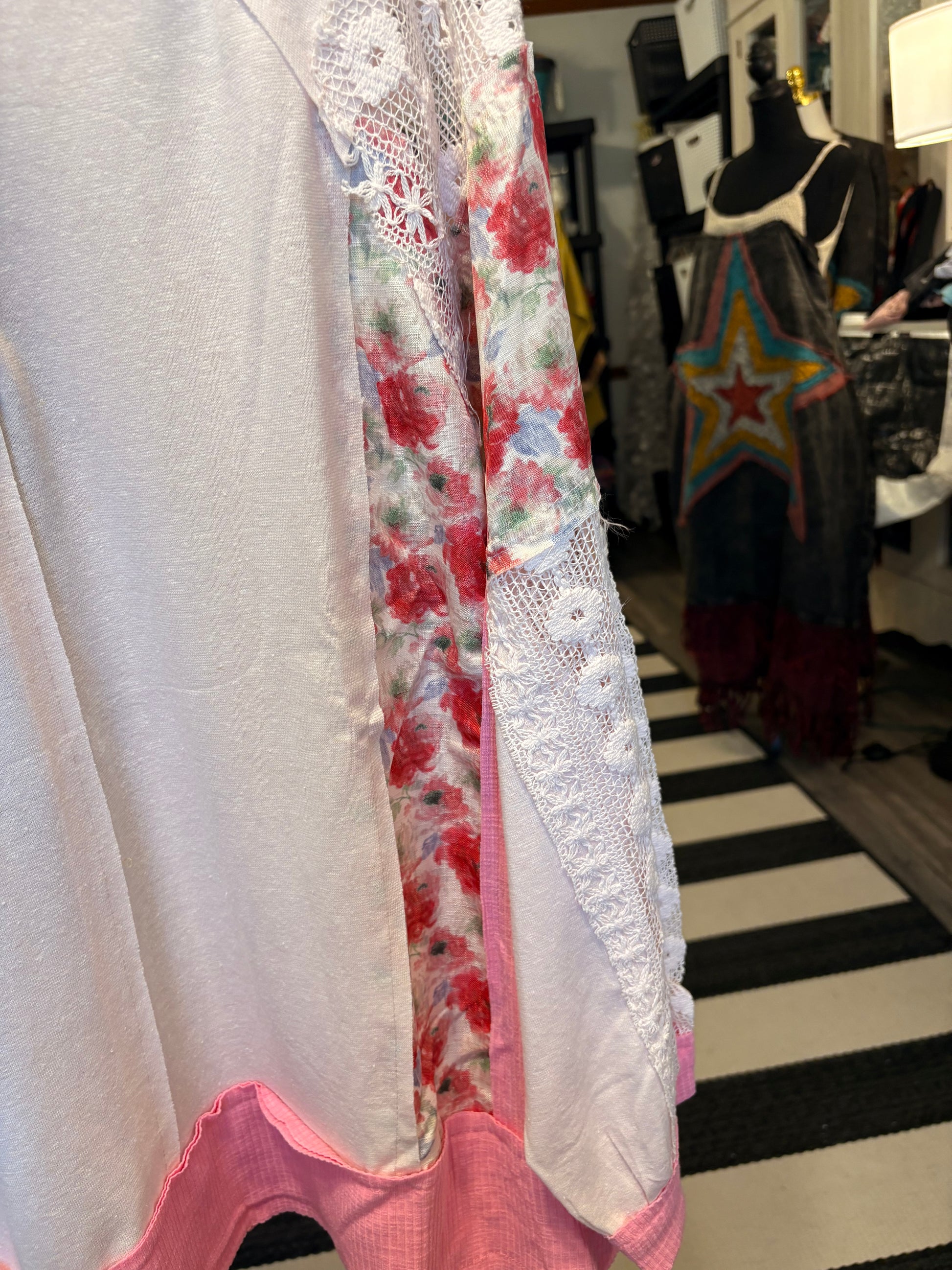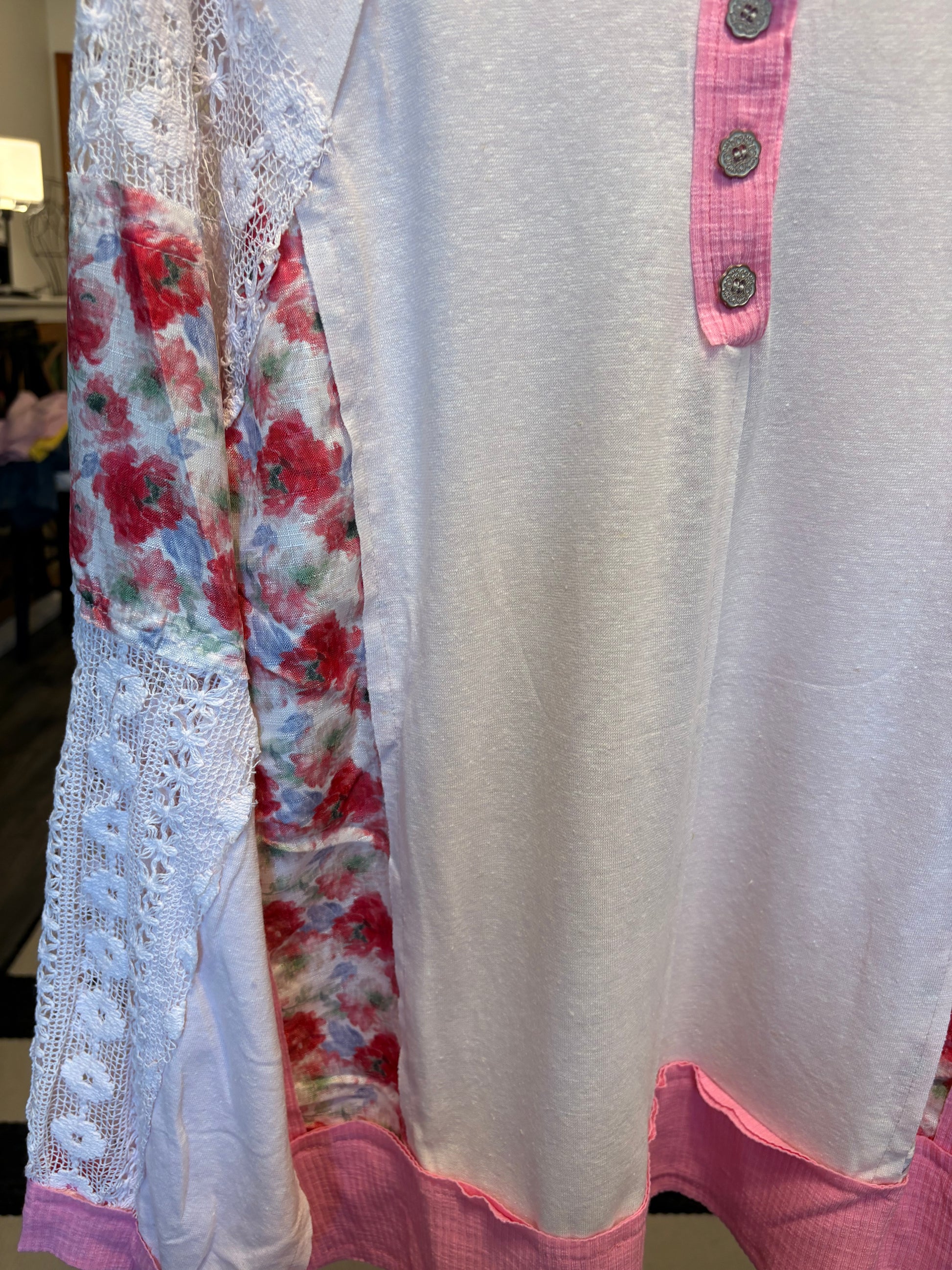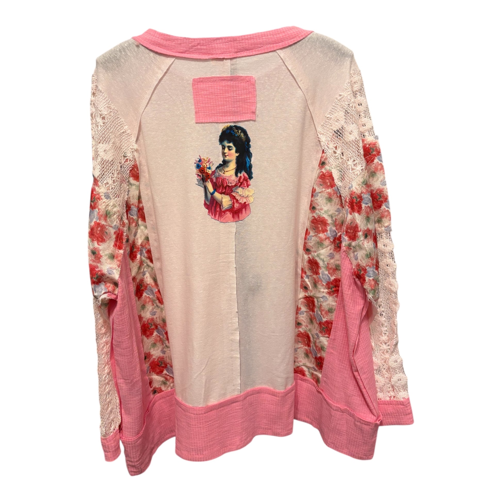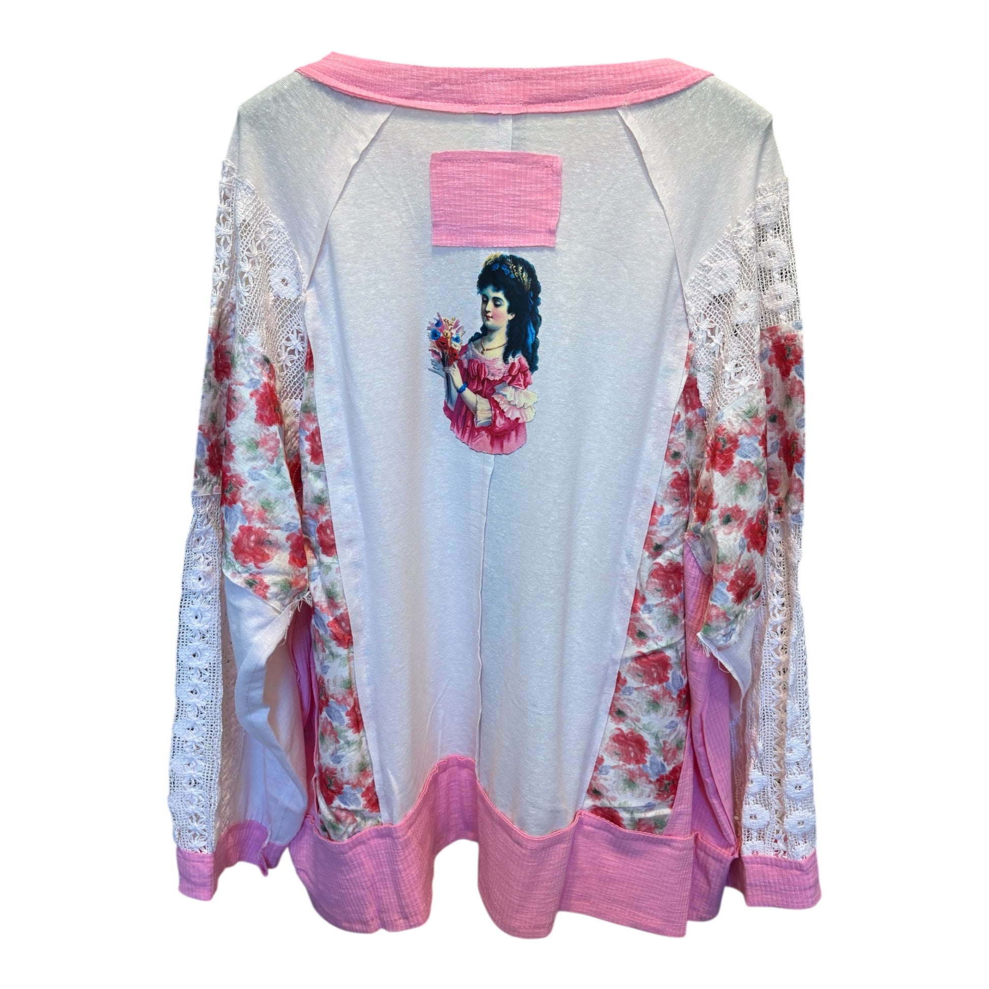 Inspired by Junk Journals. These tees are a collection of favorite things! Upcycled knit top is patchworked, frayed with beautiful lace trim and vintage image on back. SEW many beautiful details ❤️