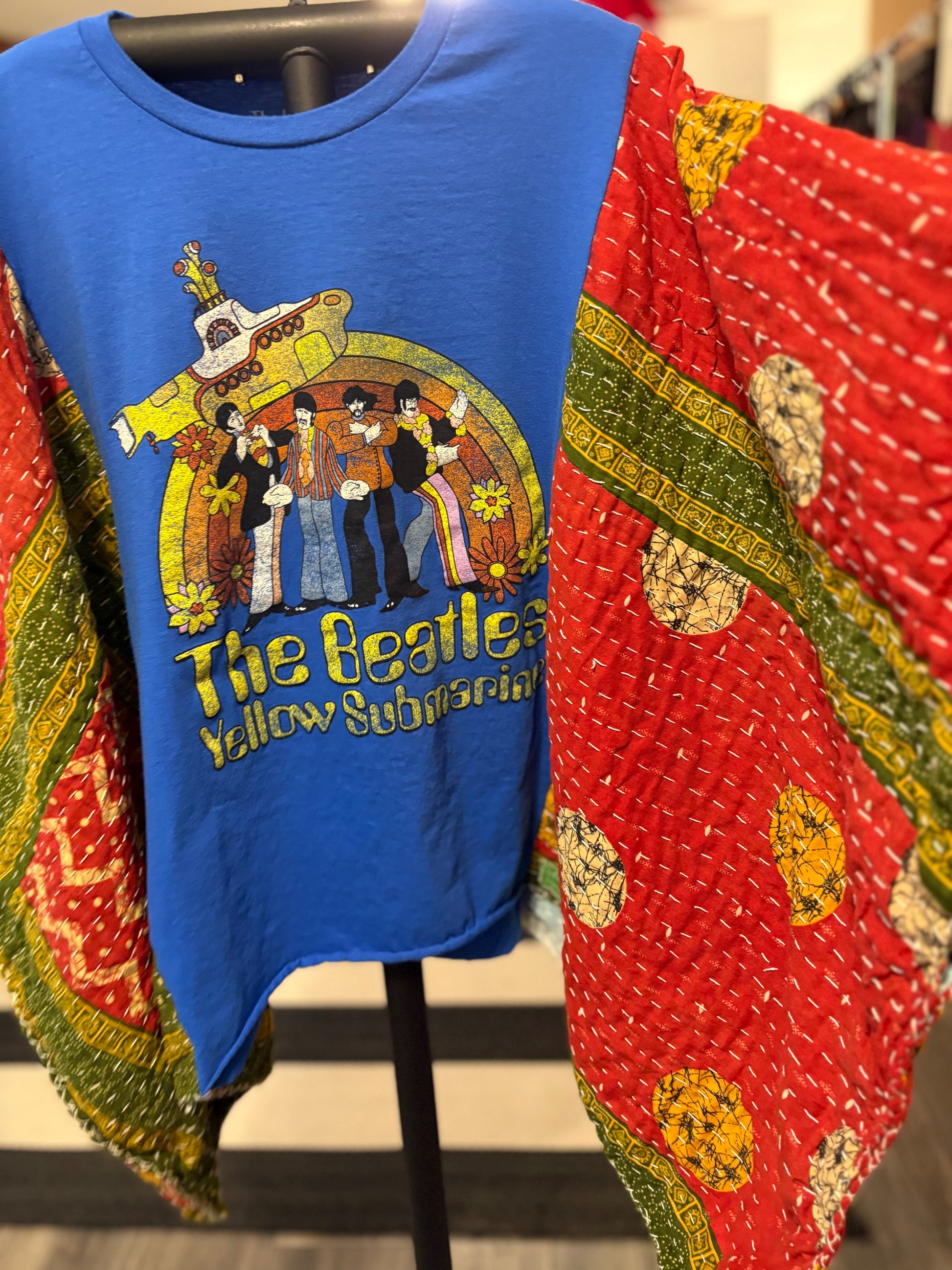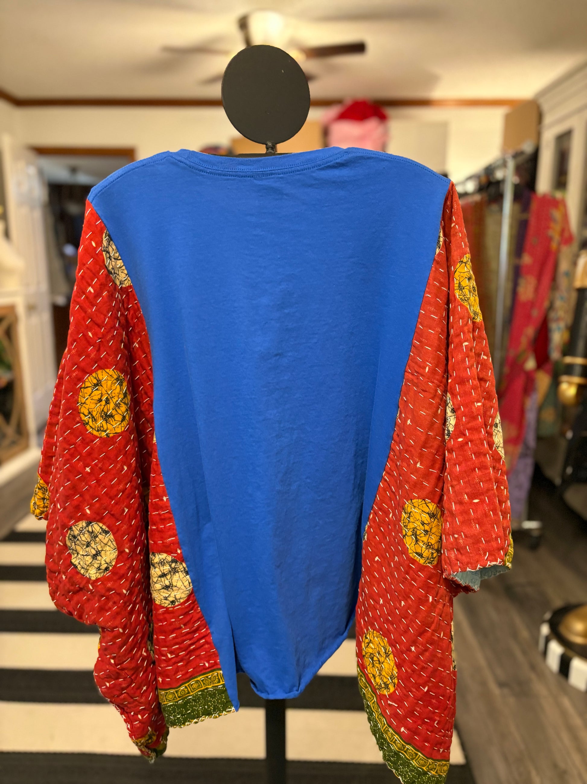 Beautiful vintage Kantha quilt and graphic tee paired to make this FABULOUS Upcycled tee. Vintage Kantha quilts have been well loved. They may have white strings (which can be cut) , slight holes, small stains,and may be weathered, rustic and tattered which all lends to the vintage beauty of the top. Perfectly imperfect!!