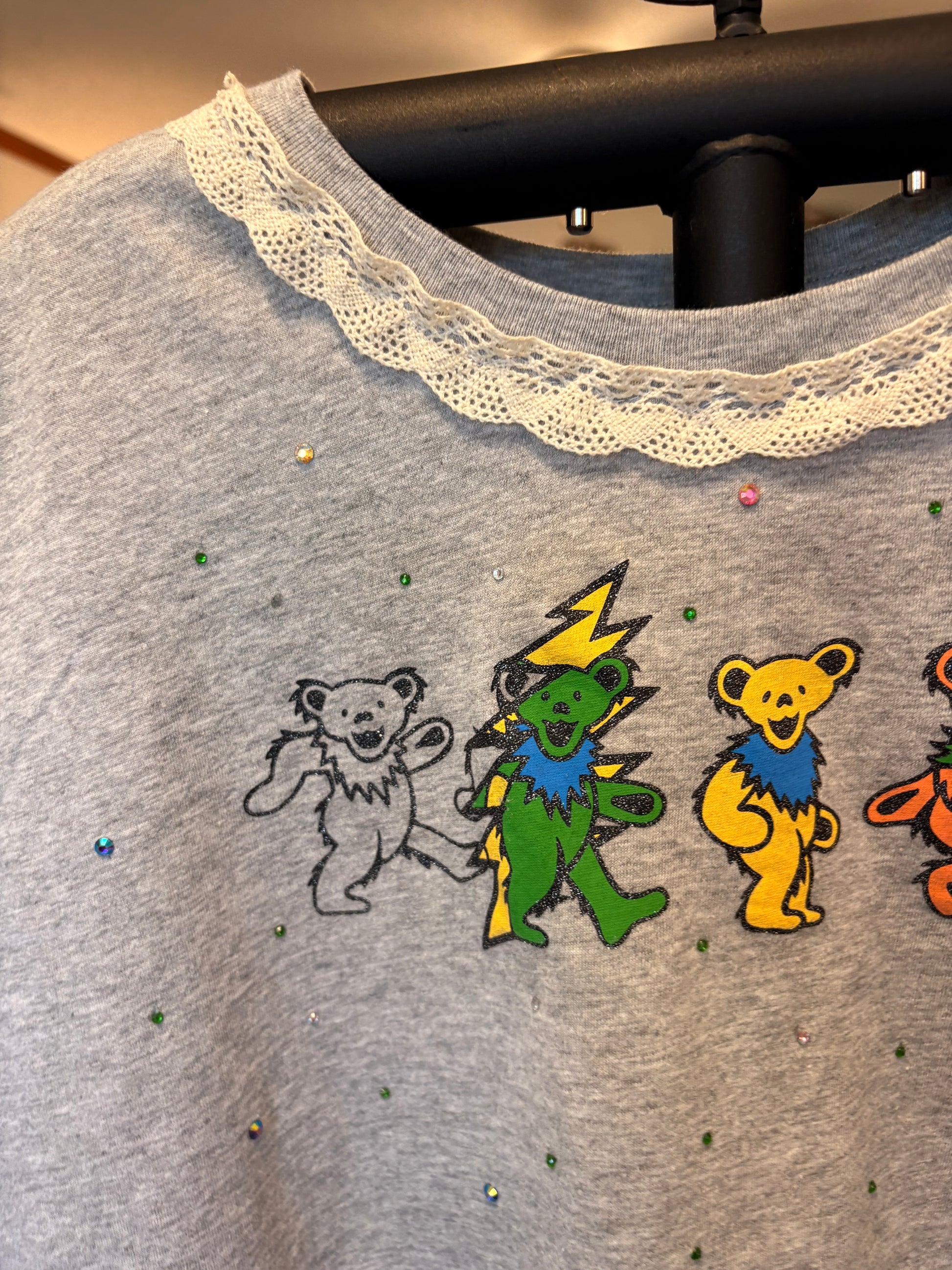 Pretty little tees! Upcycled rock tee adorned with rhinestones and crochet trim. Comfortable and beautiful!! SEW many beautiful details ❤️ Shirt used is an XL