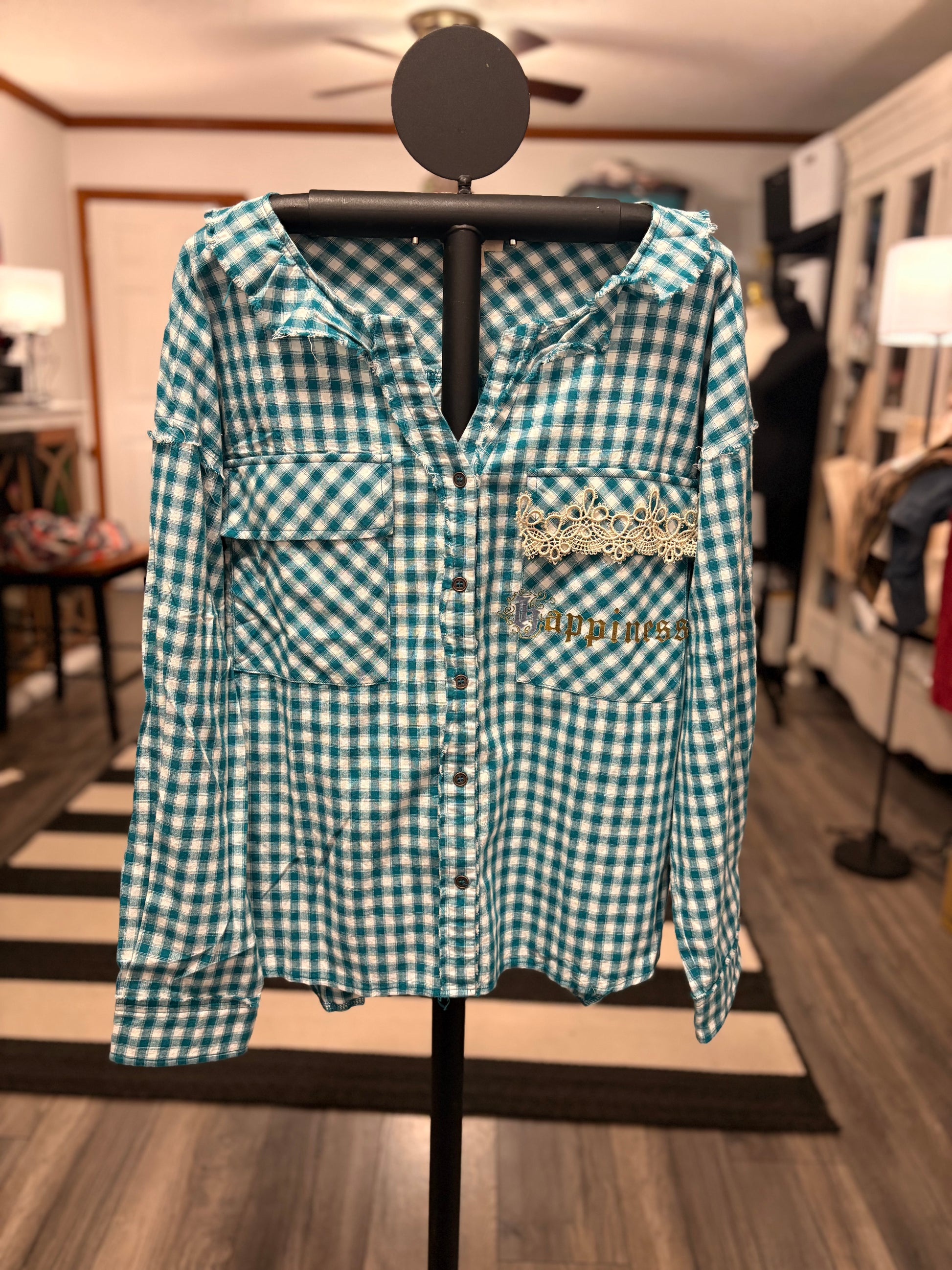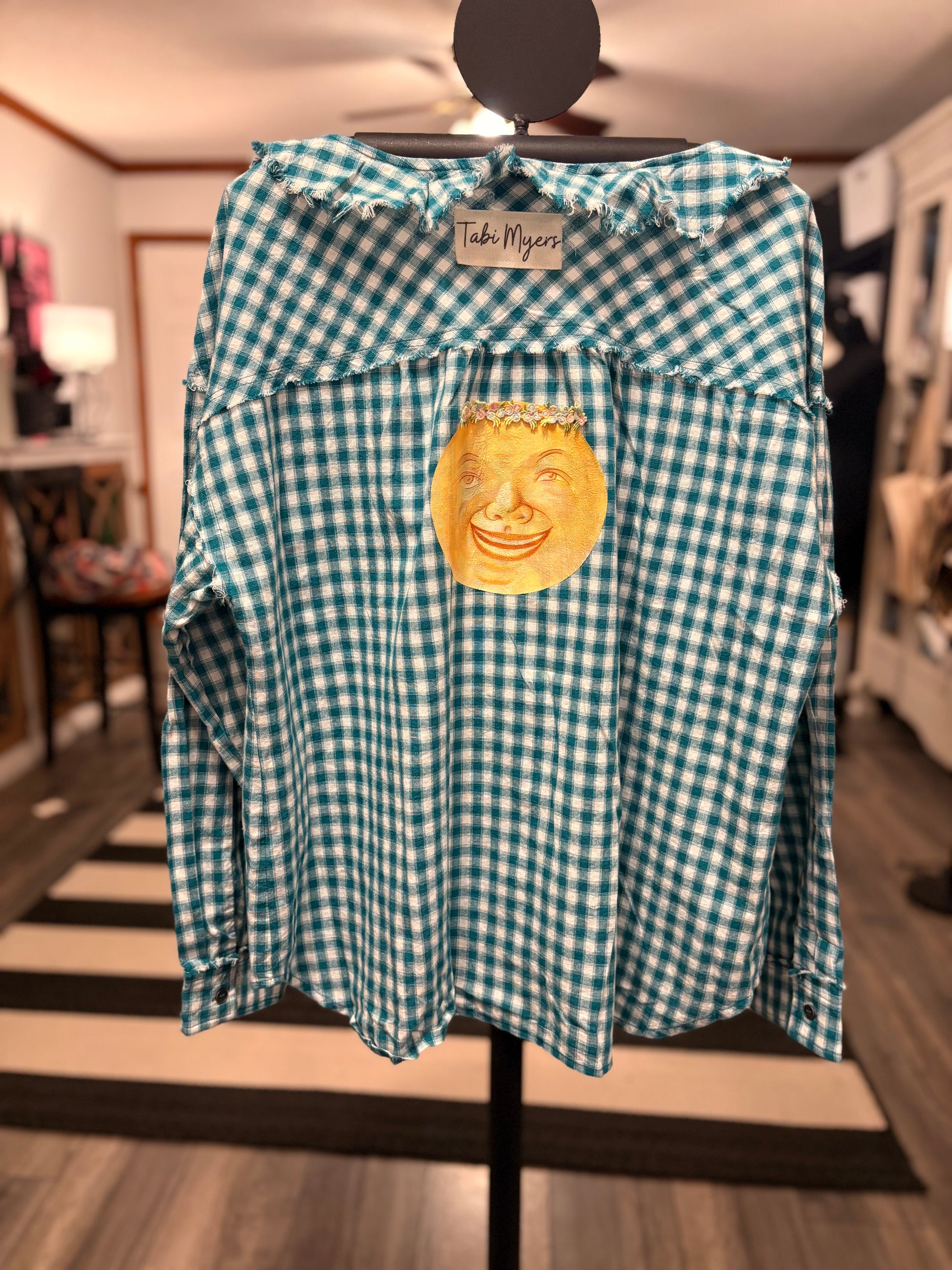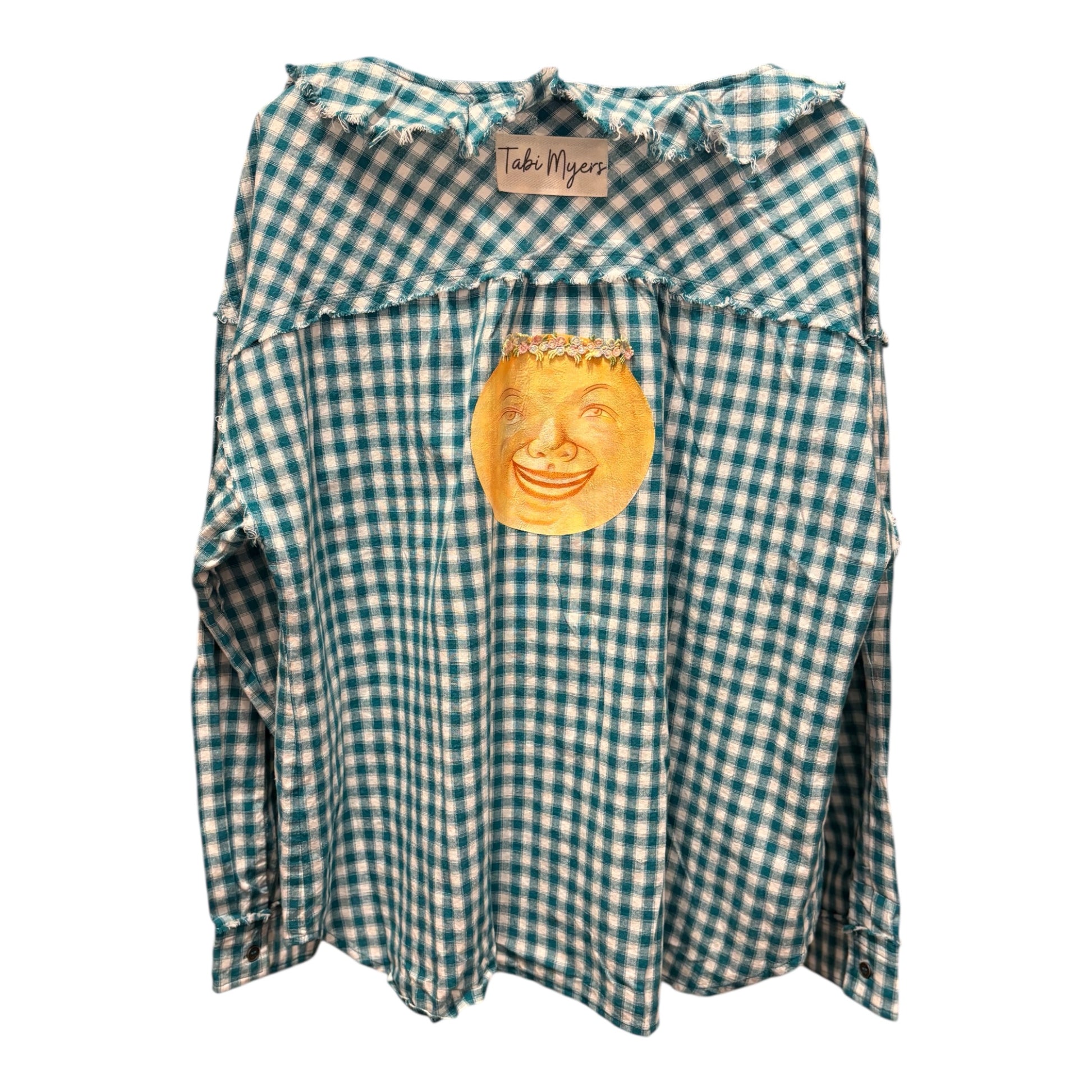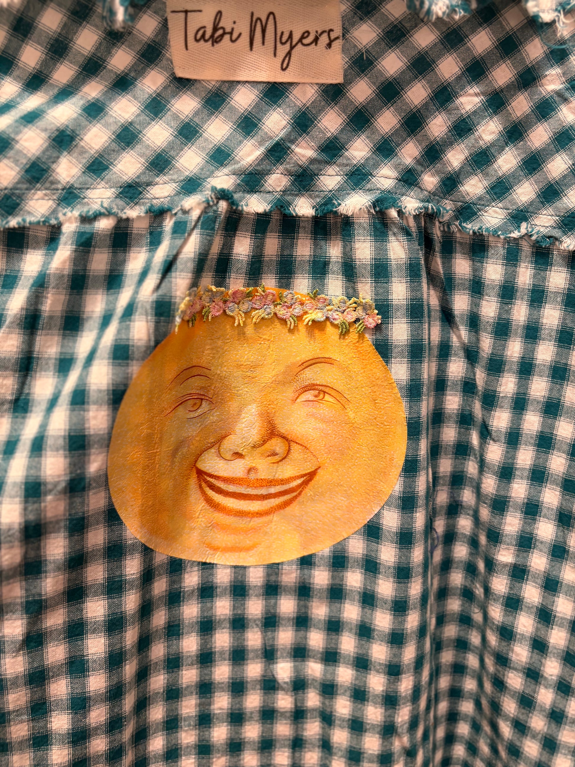 Inspired by Junk Journals. These tops are a collection of favorite things! Upcycled gingham top with vintage graphics design on the back and front, and crochet and embroidery trim detail. SEW many beautiful details ❤️