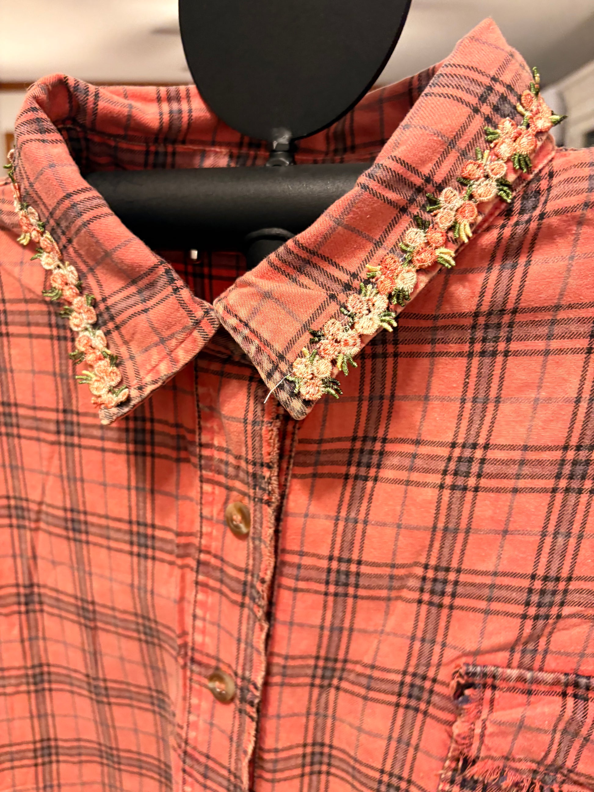 Inspired by Junk Journals.  These tops are a collection of favorite things! Upcycled plaid flannel button down with vintage graphics design on the back and front, and crochet and embroidery trim detail. SEW many beautiful details ❤️
