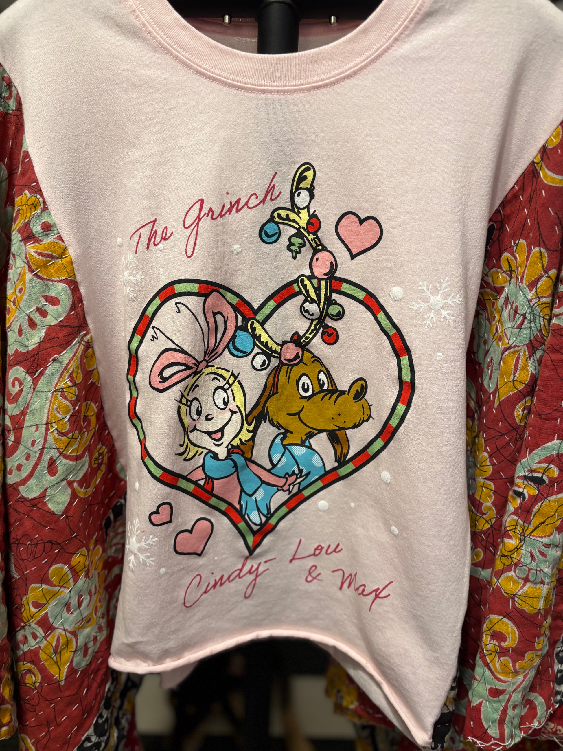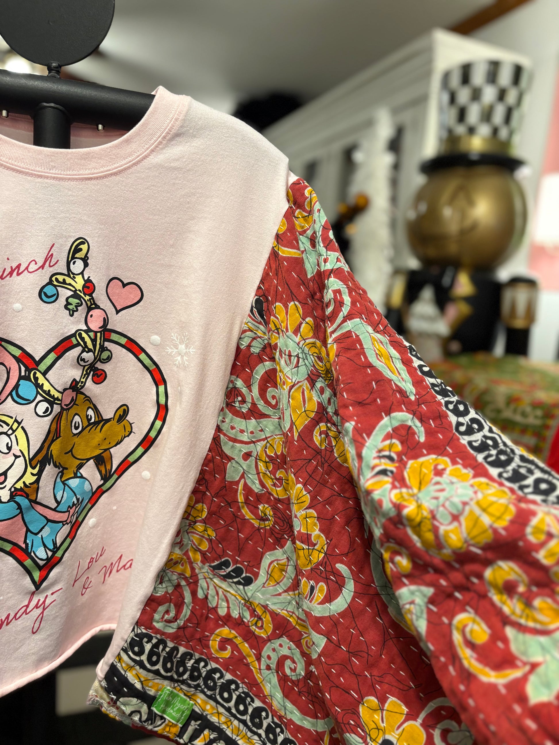 Beautiful vintage Kantha quilt and graphic tee paired to make this FABULOUS Upcycled tee. Vintage Kantha quilts have been well loved. They may have white strings (which can be cut) , slight holes, small stains,and may be weathered, rustic and tattered which all lends to the vintage beauty of the top. Perfectly imperfect!!