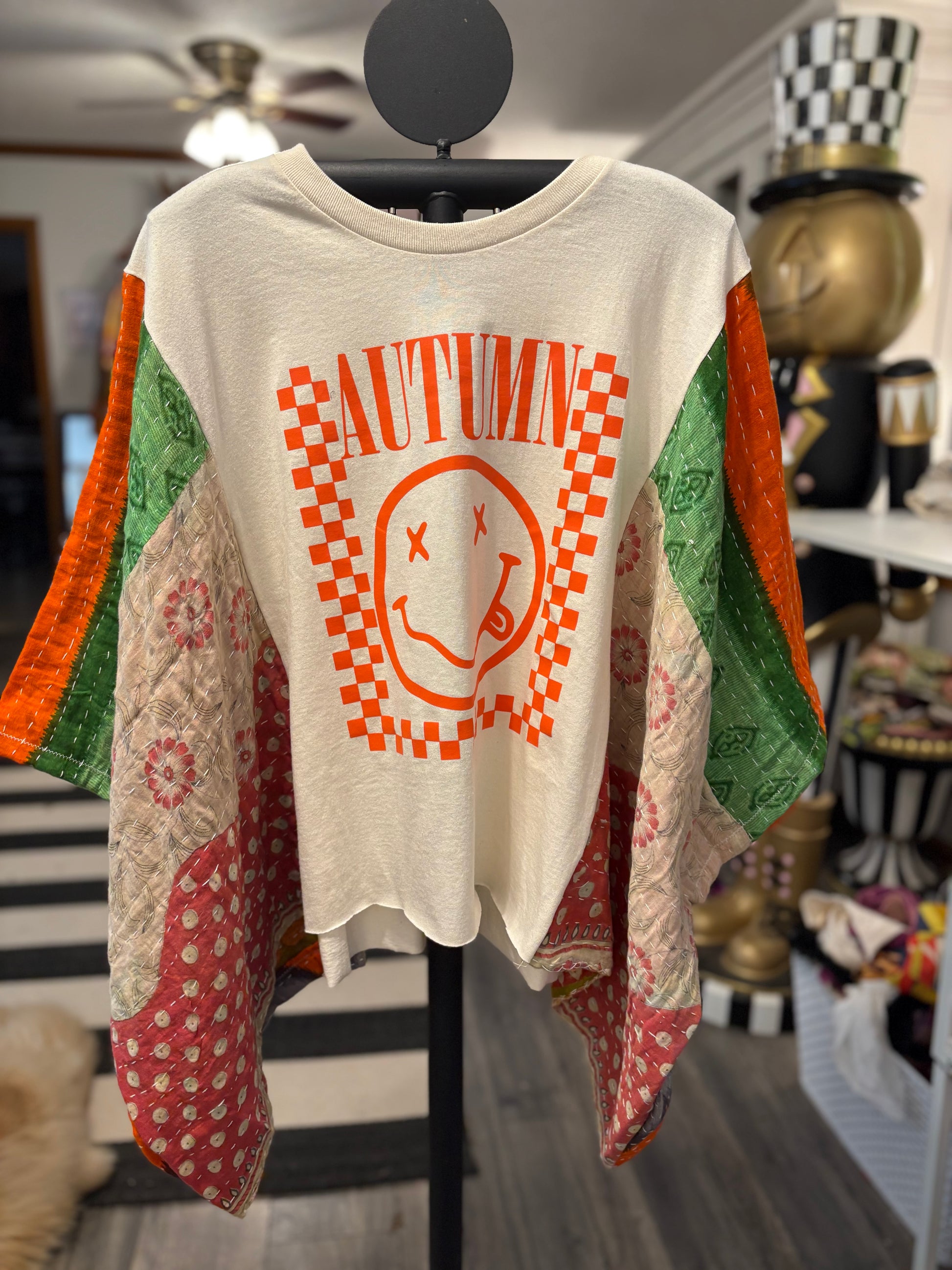 Beautiful vintage Kantha quilt and graphic tee paired to make this FABULOUS Upcycled tee. Vintage Kantha quilts have been well loved. They may have white strings (which can be cut) , slight holes, small stains,and may be weathered, rustic and tattered which all lends to the vintage beauty of the top. Perfectly imperfect!!