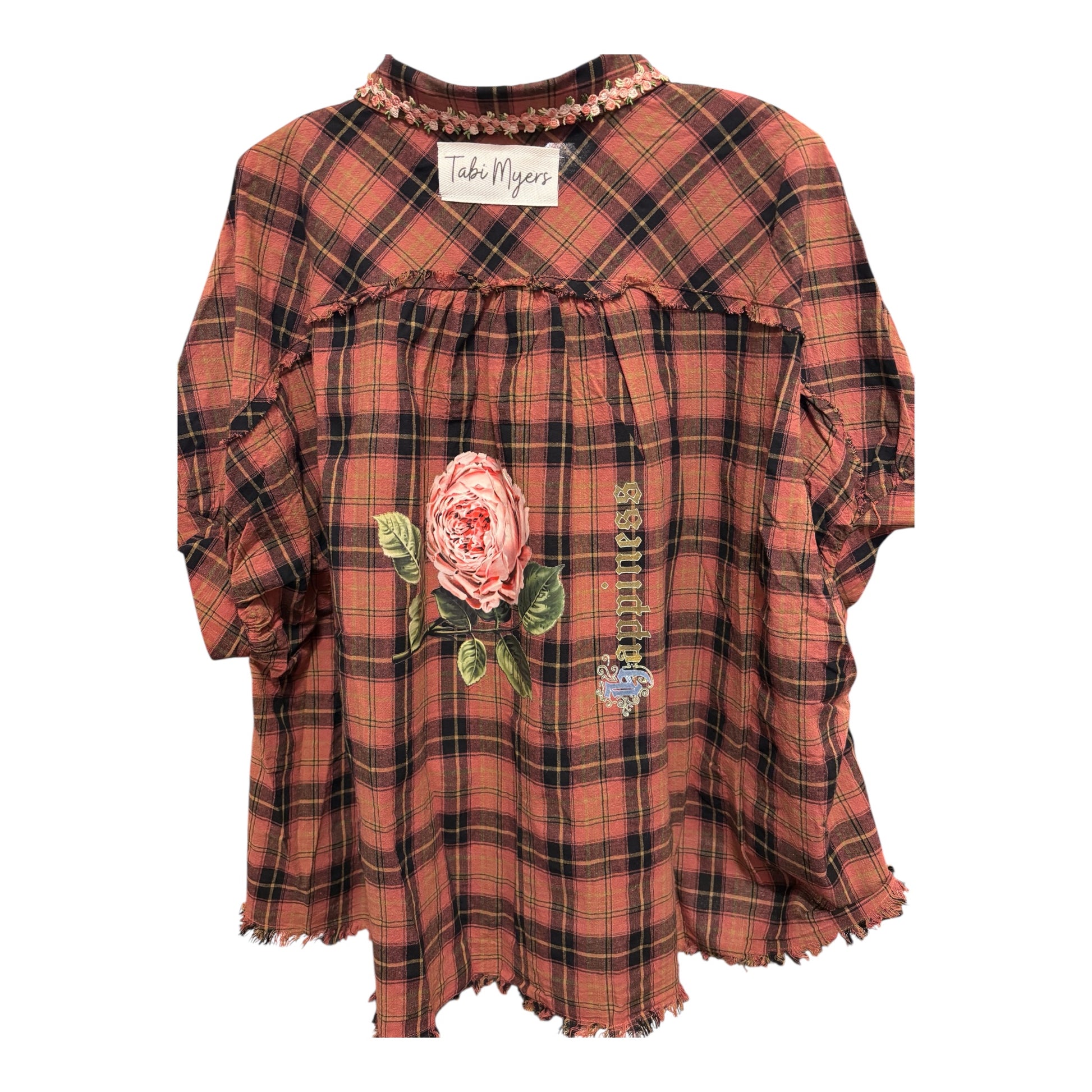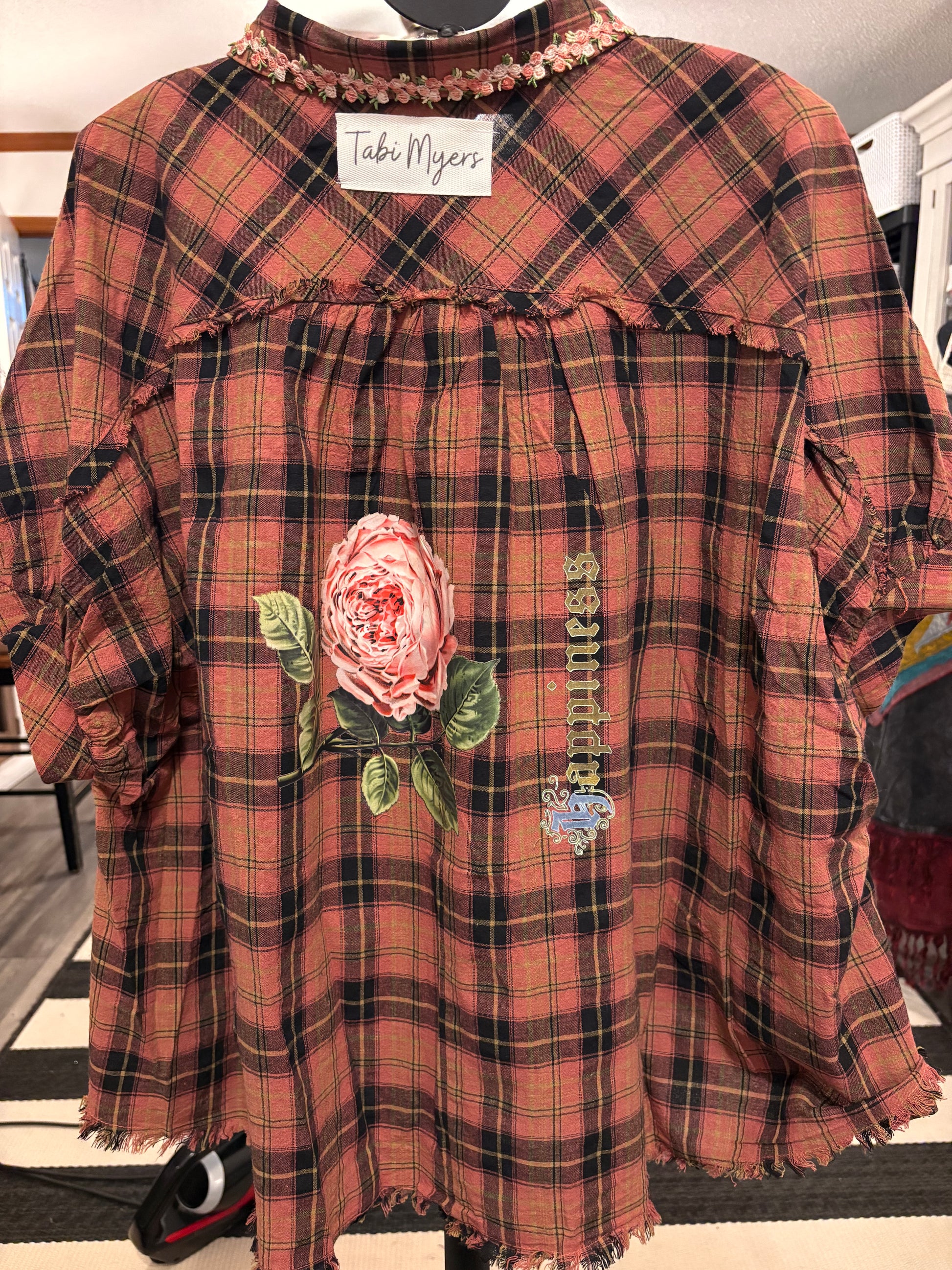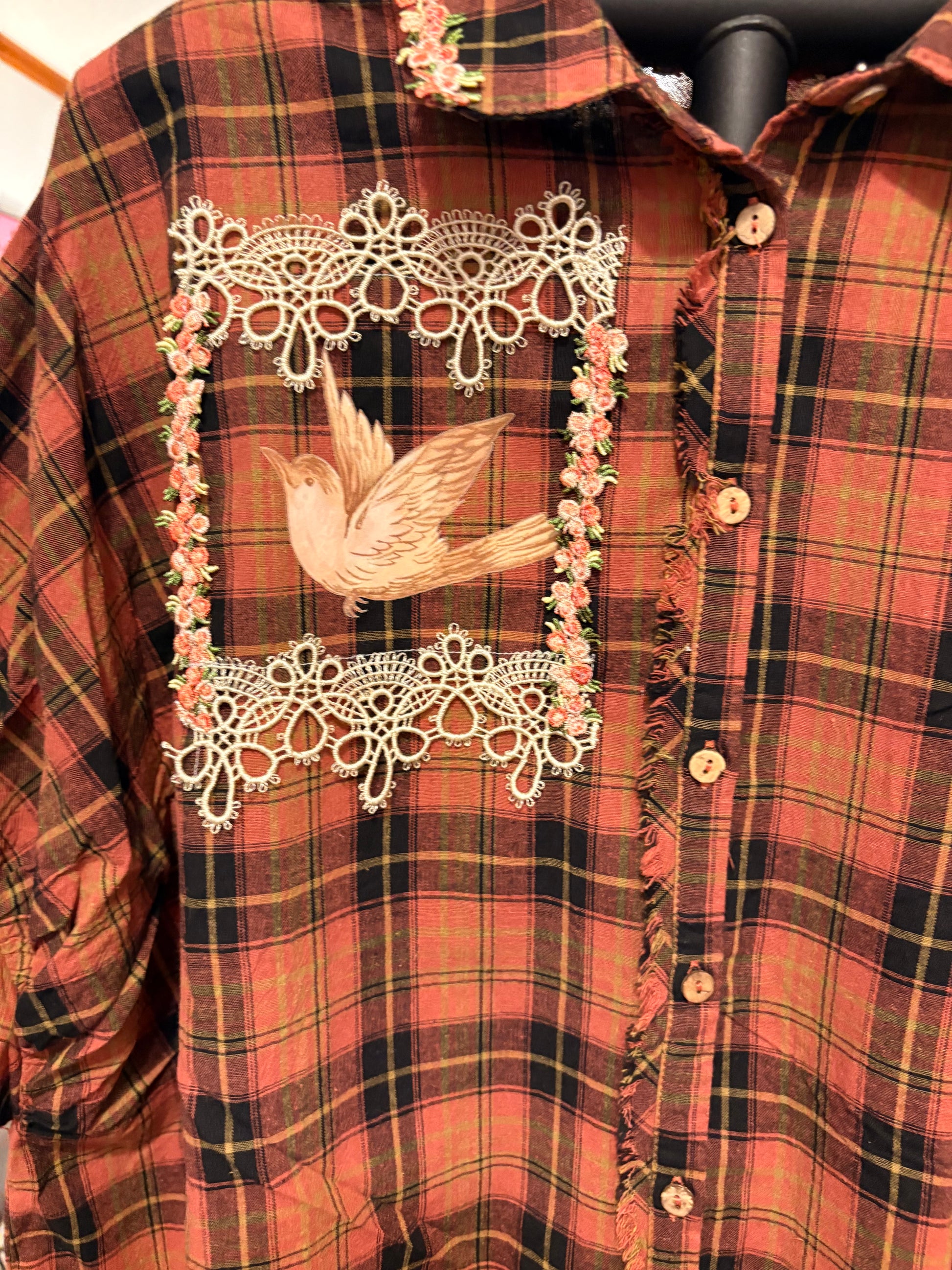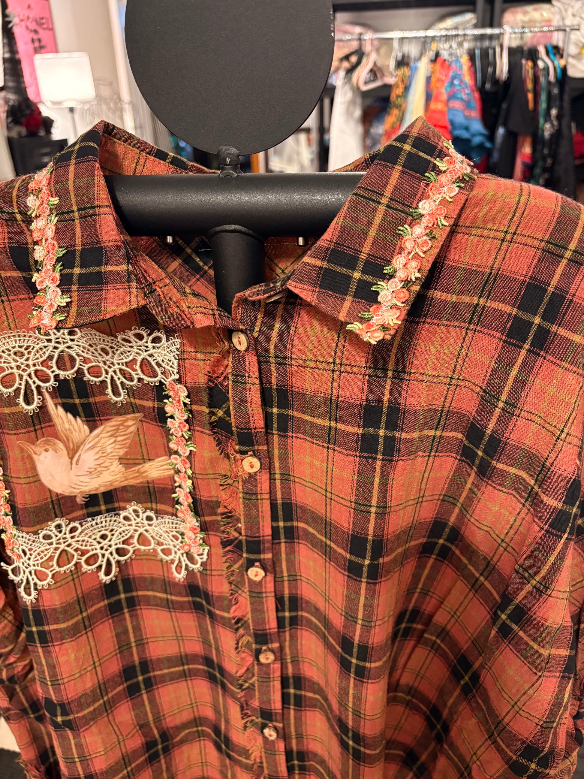Inspired by Junk Journals. These tops are a collection of favorite things! Upcycled plaid button down with vintage graphics design on the back and front, and crochet and embroidery trim detail. SEW many beautiful details ❤️