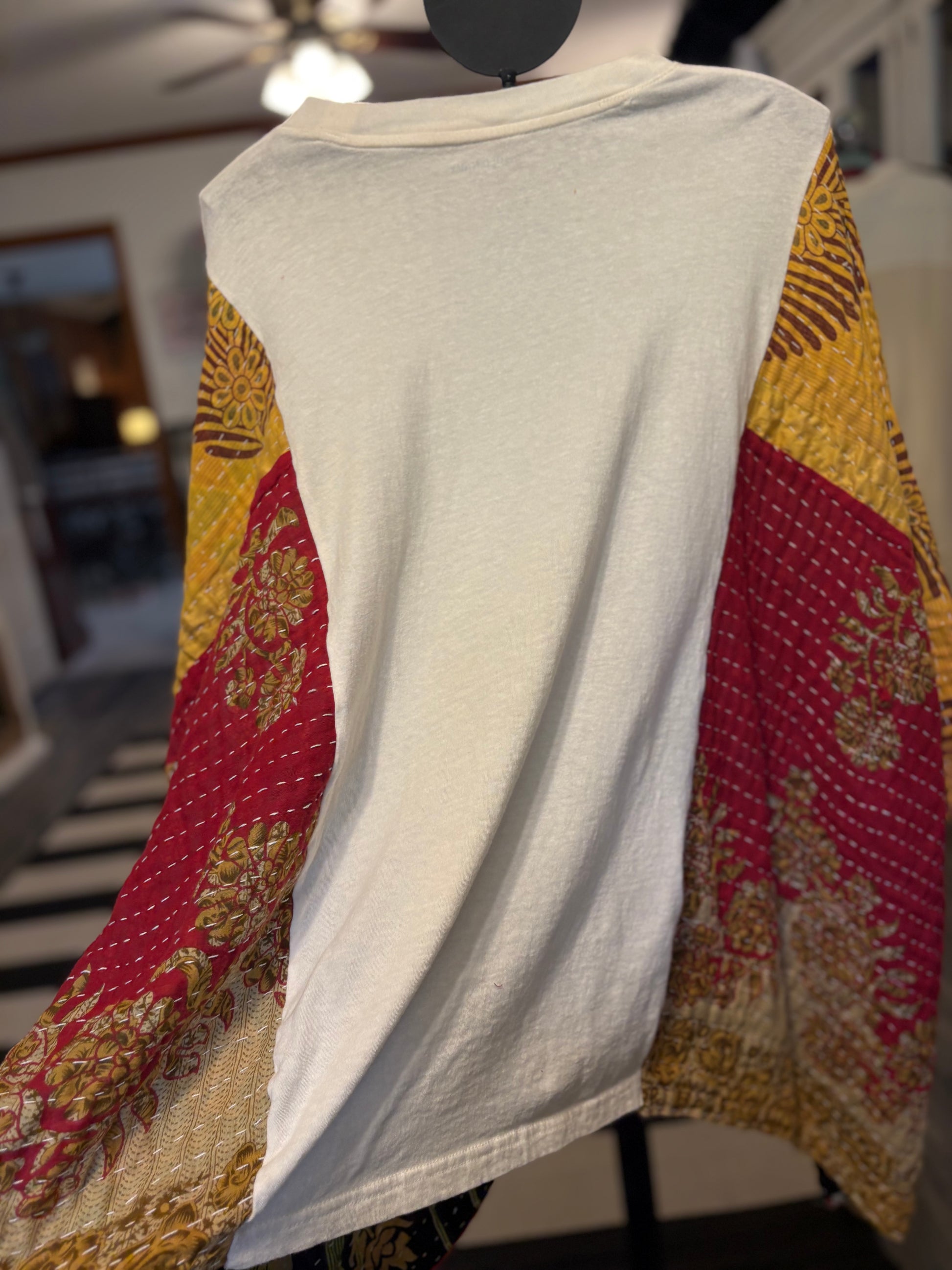 Beautiful vintage Kantha quilt and graphic tee paired to make this FABULOUS Upcycled tee. Vintage Kantha quilts have been well loved. They may have white strings (which can be cut) , slight holes, small stains,and may be weathered, rustic and tattered which all lends to the vintage beauty of the top. Perfectly imperfect!!
