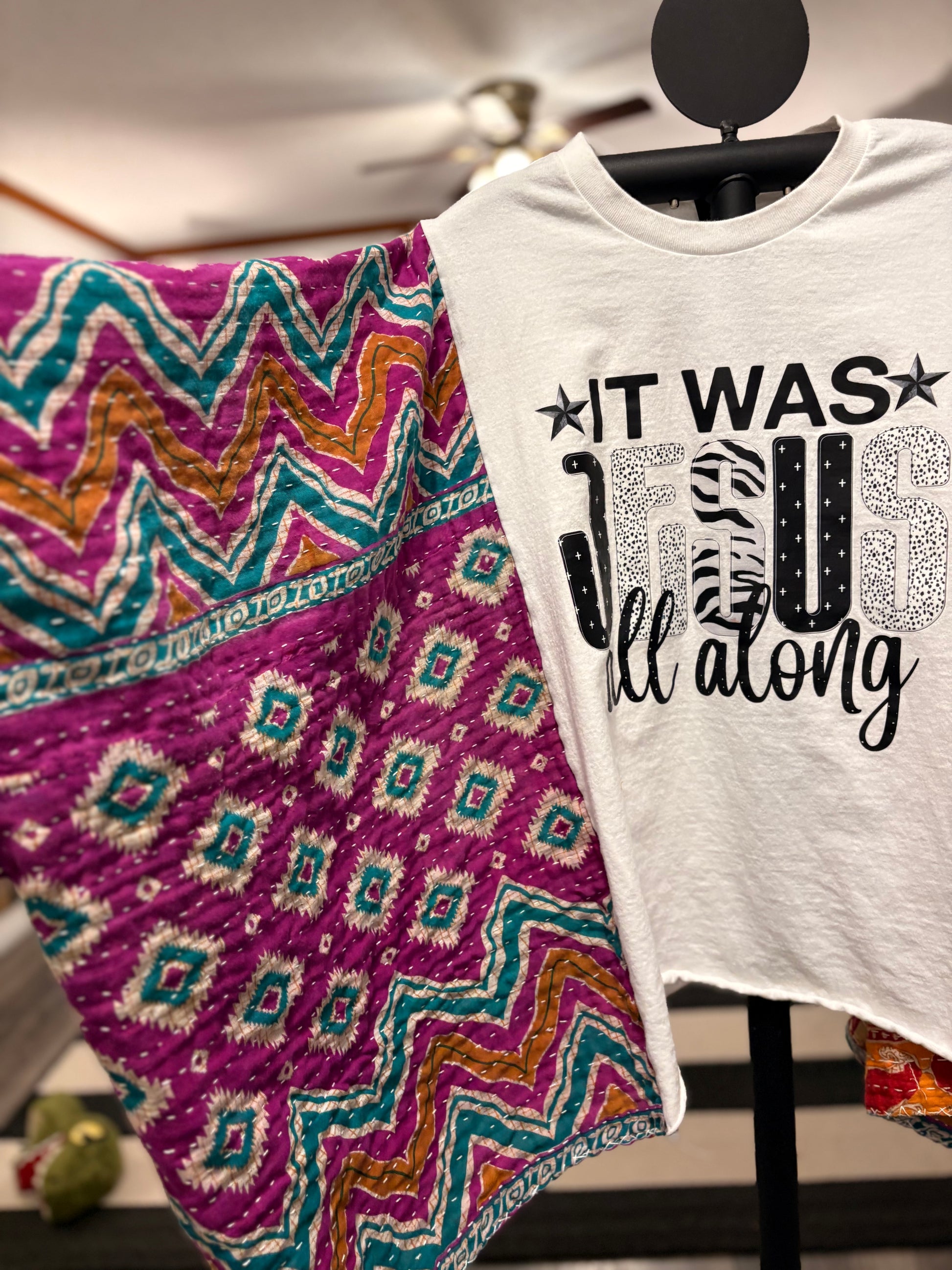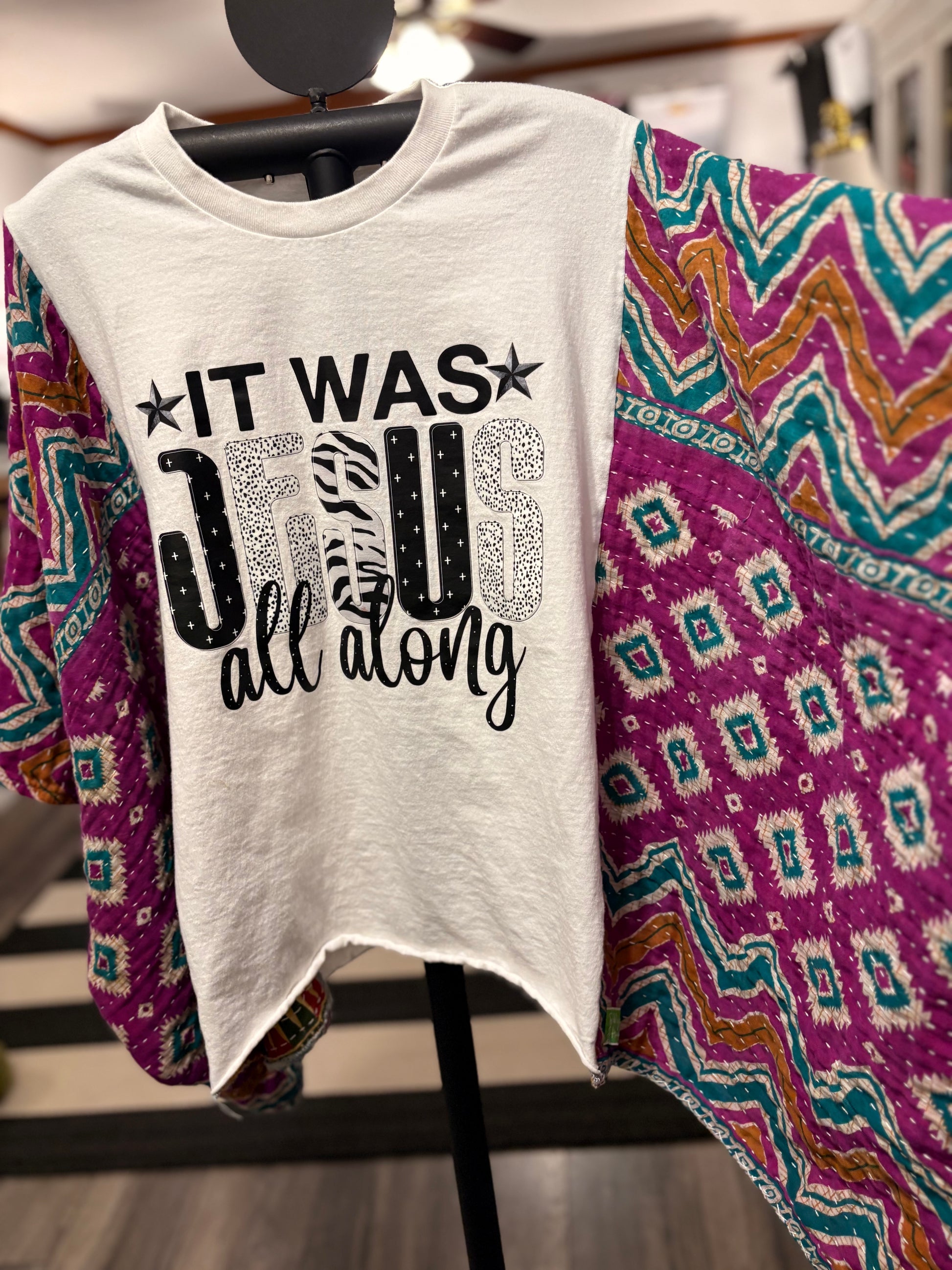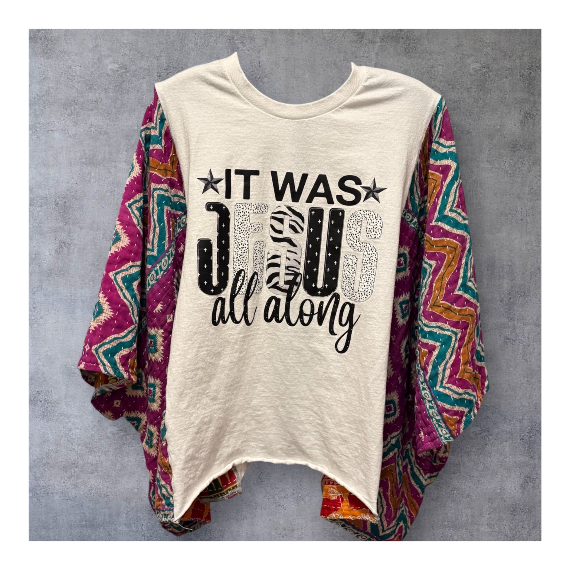 It Was Jesus Upcycled Vintage Kantha Quilt Poncho Tee One Size Fits a Small to XXL