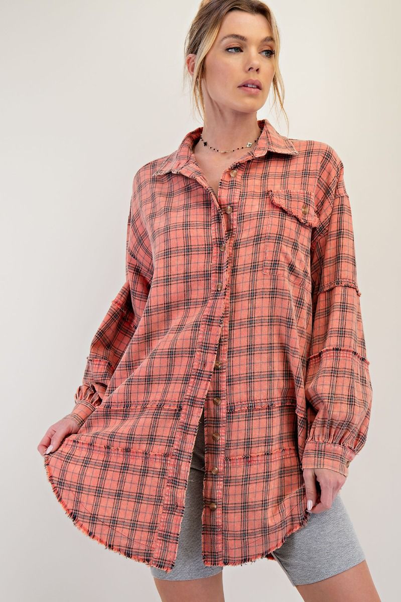 Coral Plaid Frayed Long Flannel