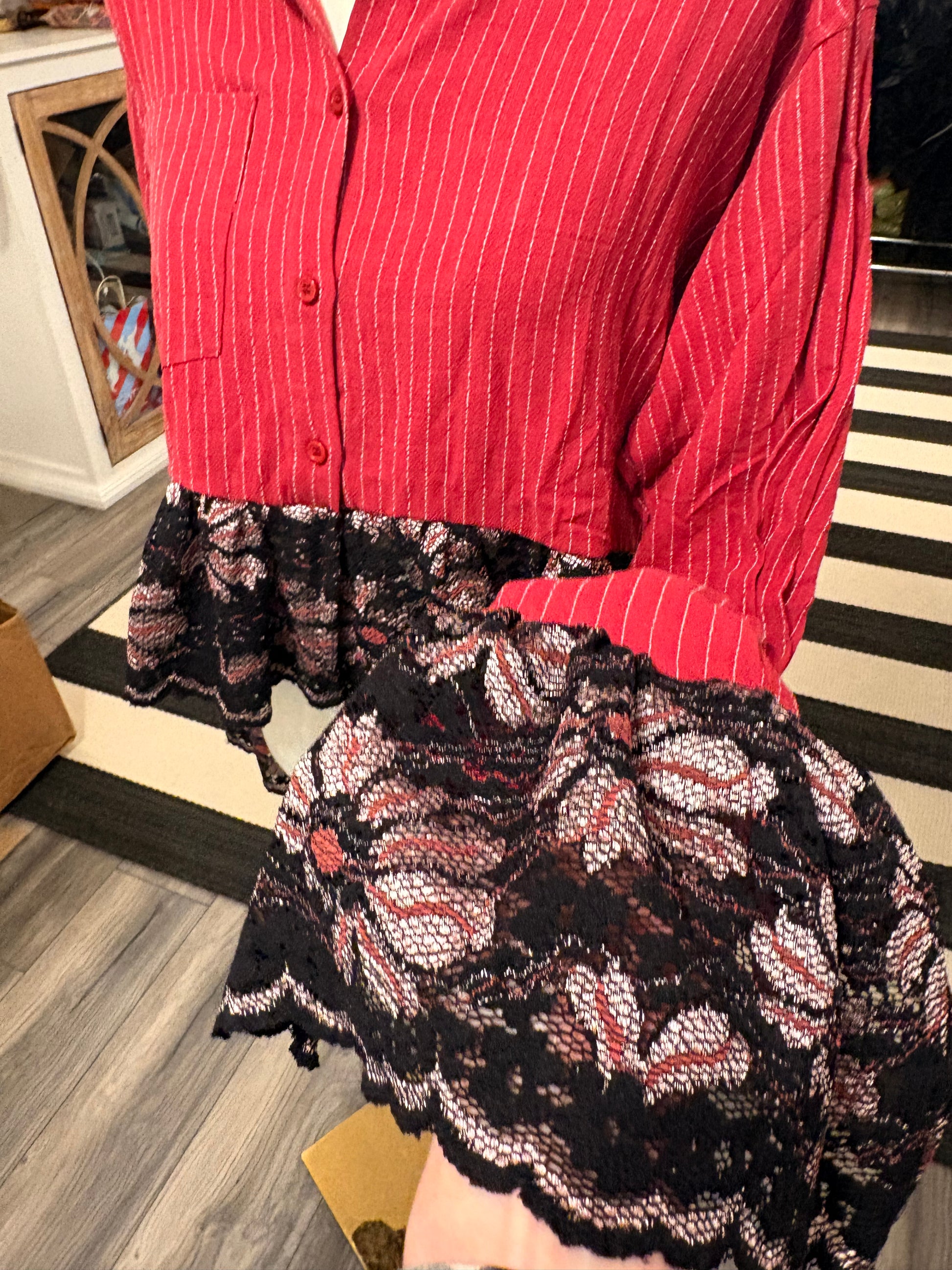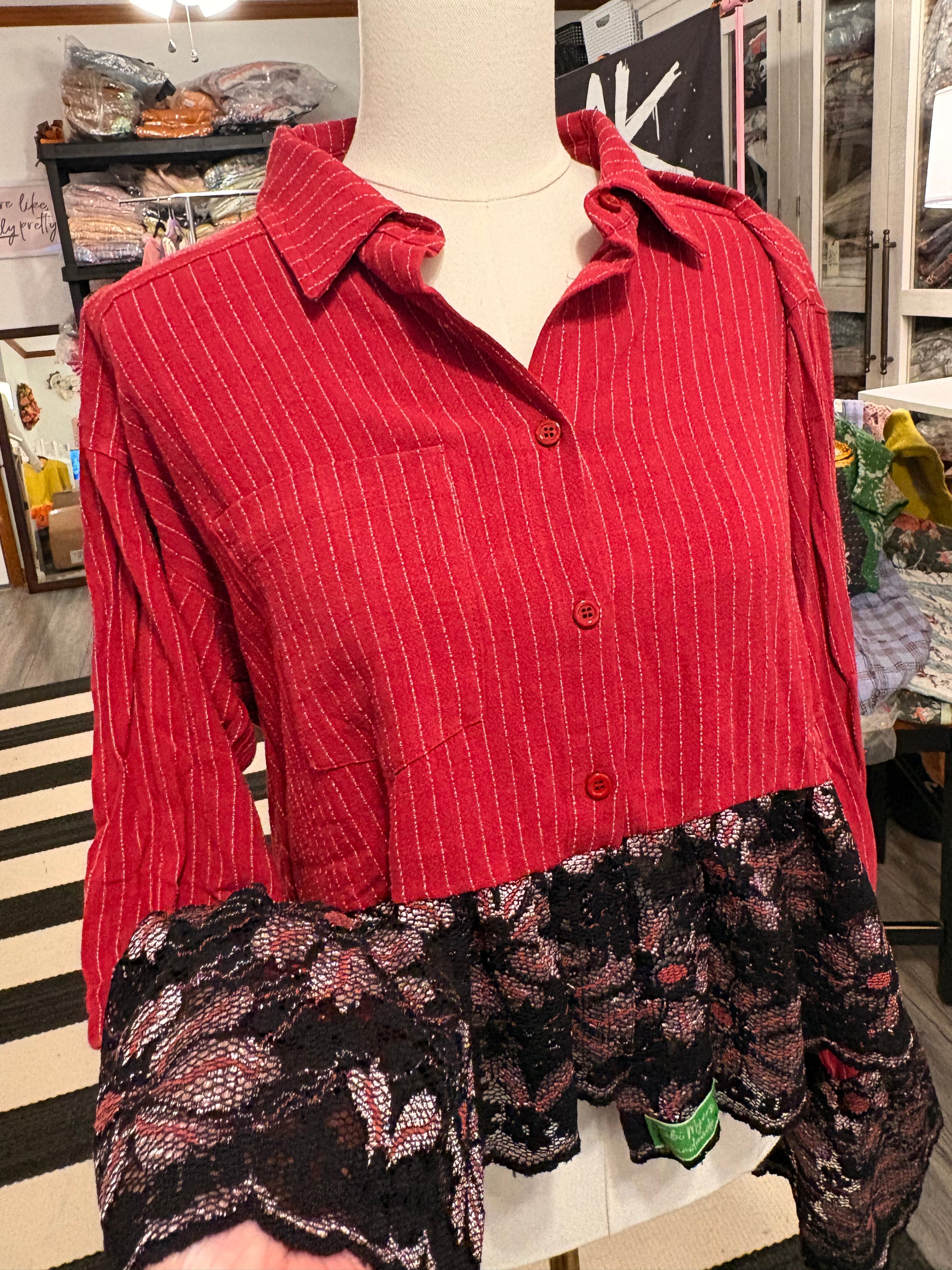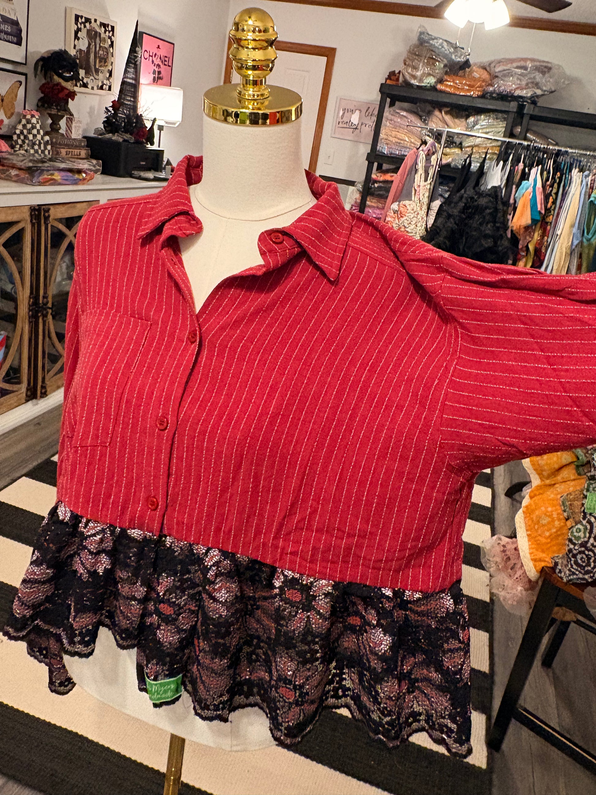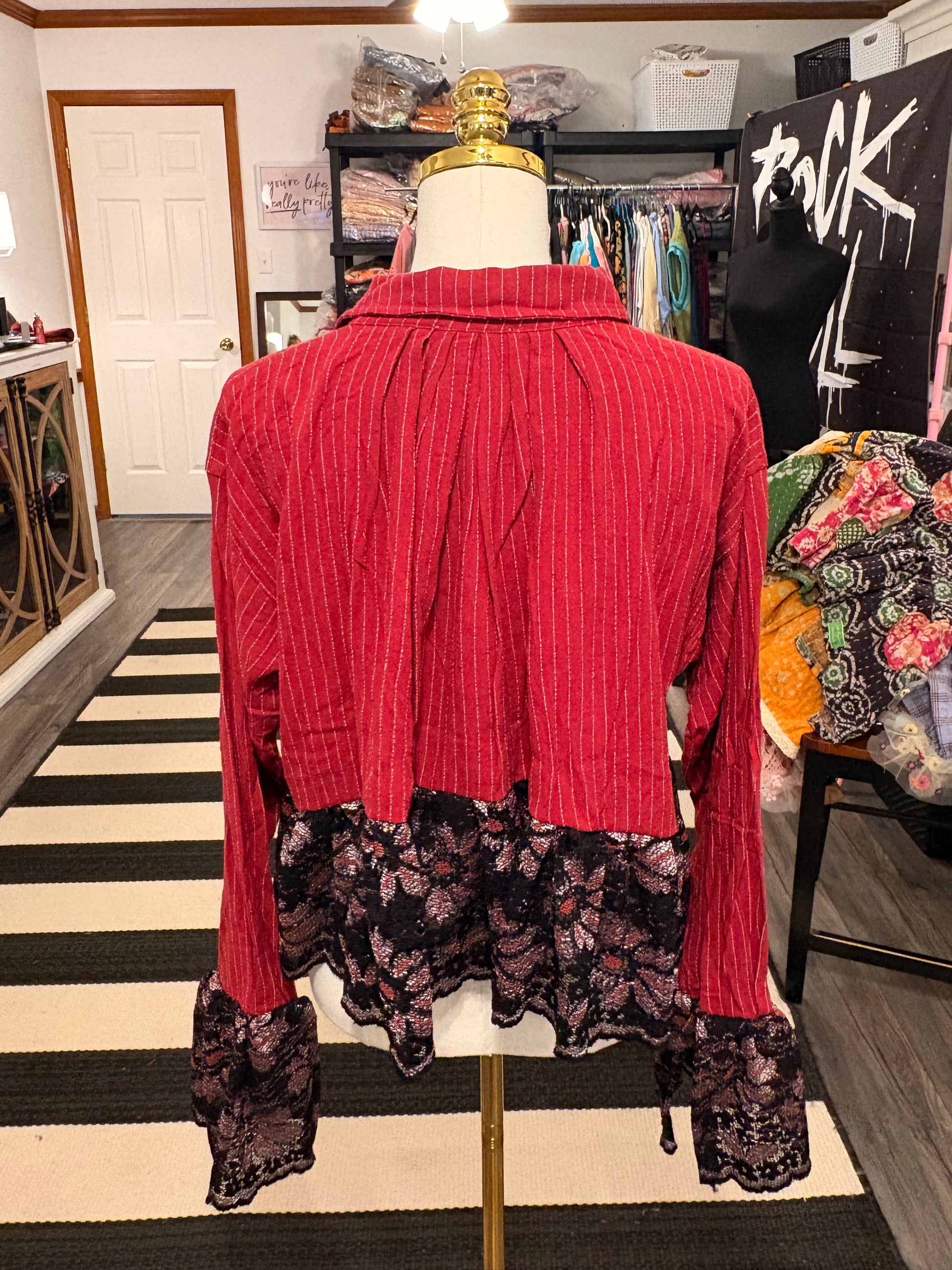 Upcycled boutique button down and lace scalloped mesh fabric used to create this FABULOUS cropped top!! Makes a great layering piece!!