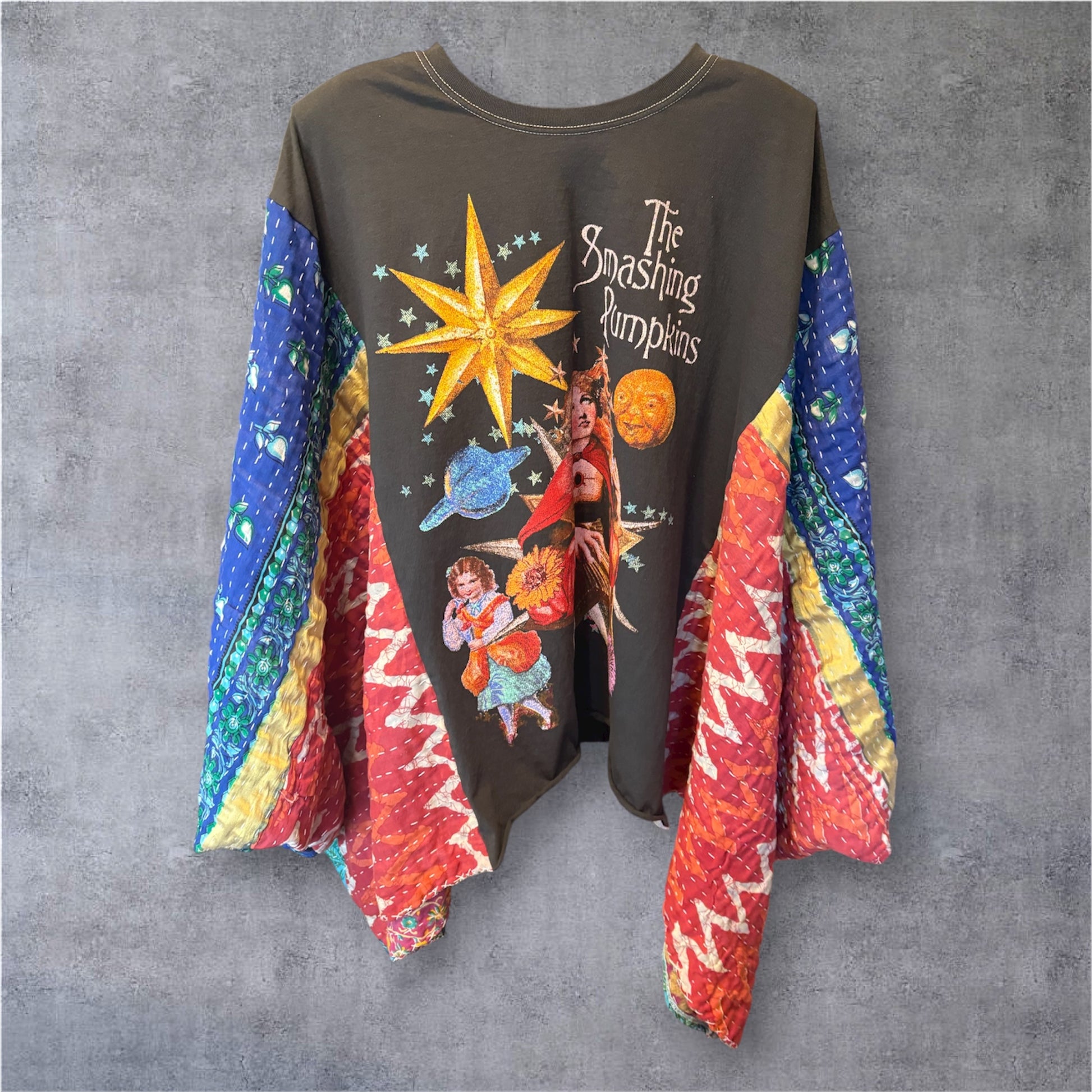 Beautiful vintage Kantha quilt and graphic tee paired to make this FABULOUS Upcycled tee. Vintage Kantha quilts have been well loved. They may have white strings (which can be cut) , slight holes, small stains,and may be weathered, rustic and tattered which all lends to the vintage beauty of the top. Perfectly imperfect!!