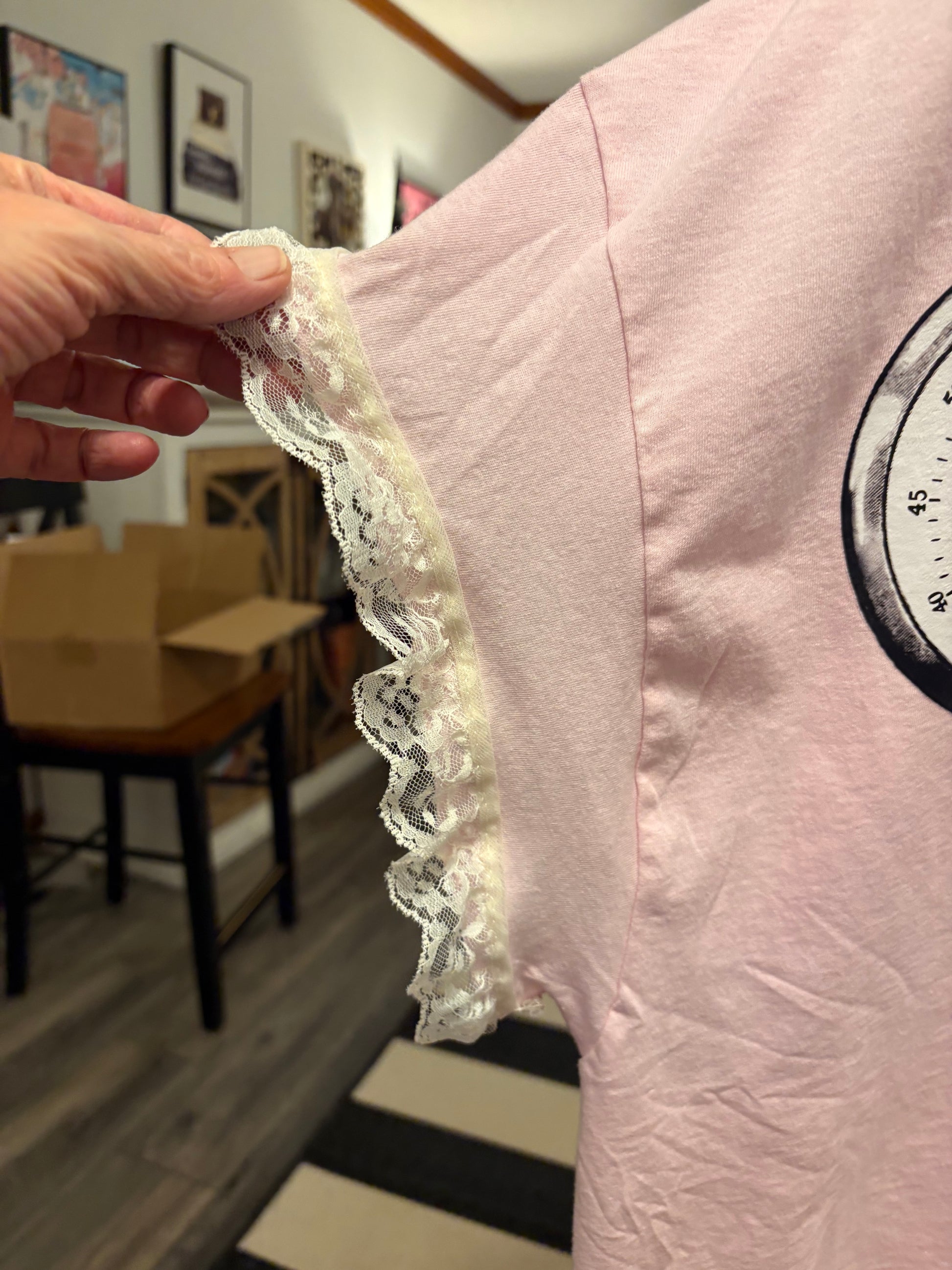 Inspired by Junk Journals. These tees are a collection of favorite things! Cotton tee with vintage graphic images and natural crochet trim. SEW many beautiful details ❤️ Shirt used is a 3X.
