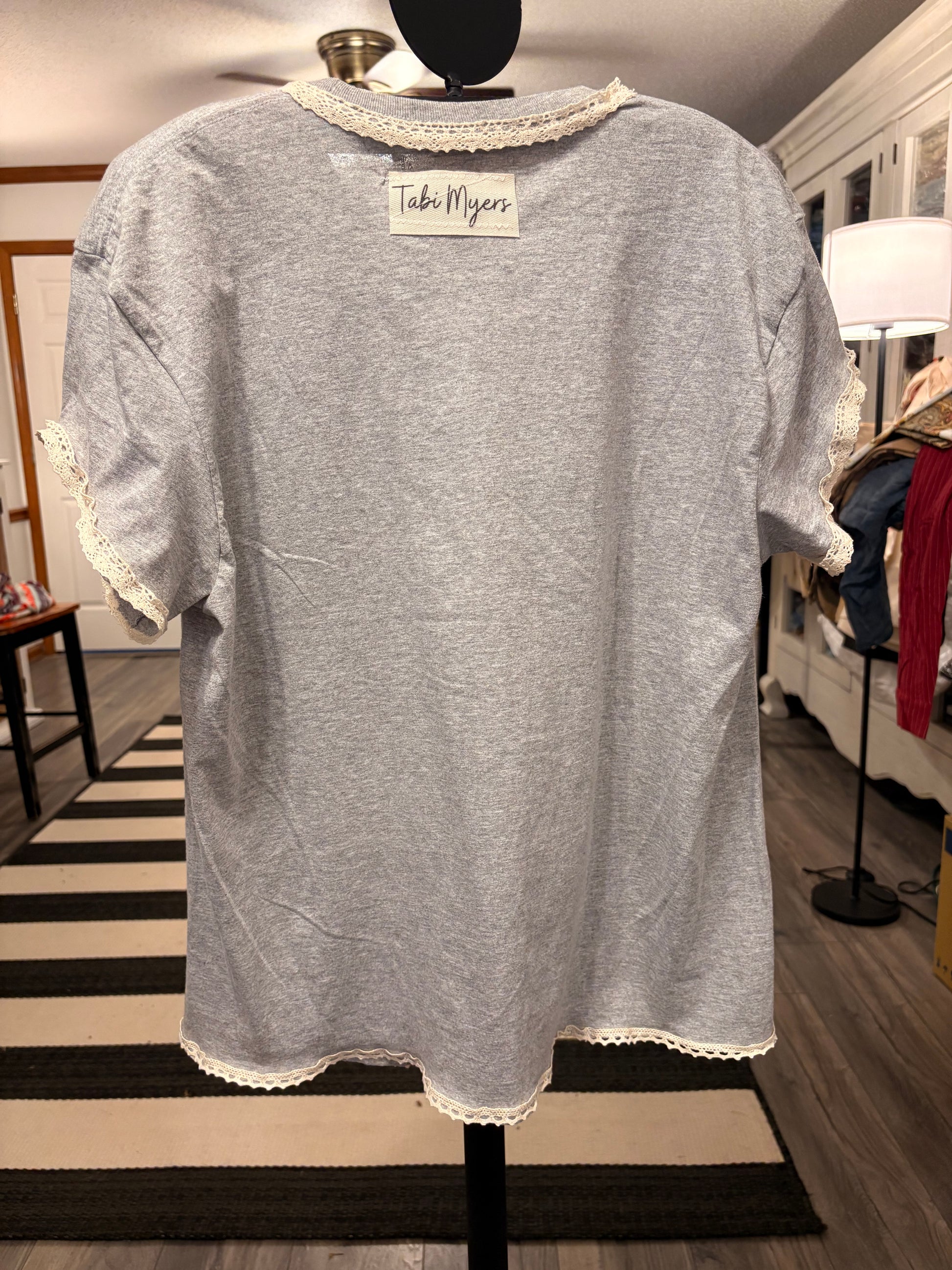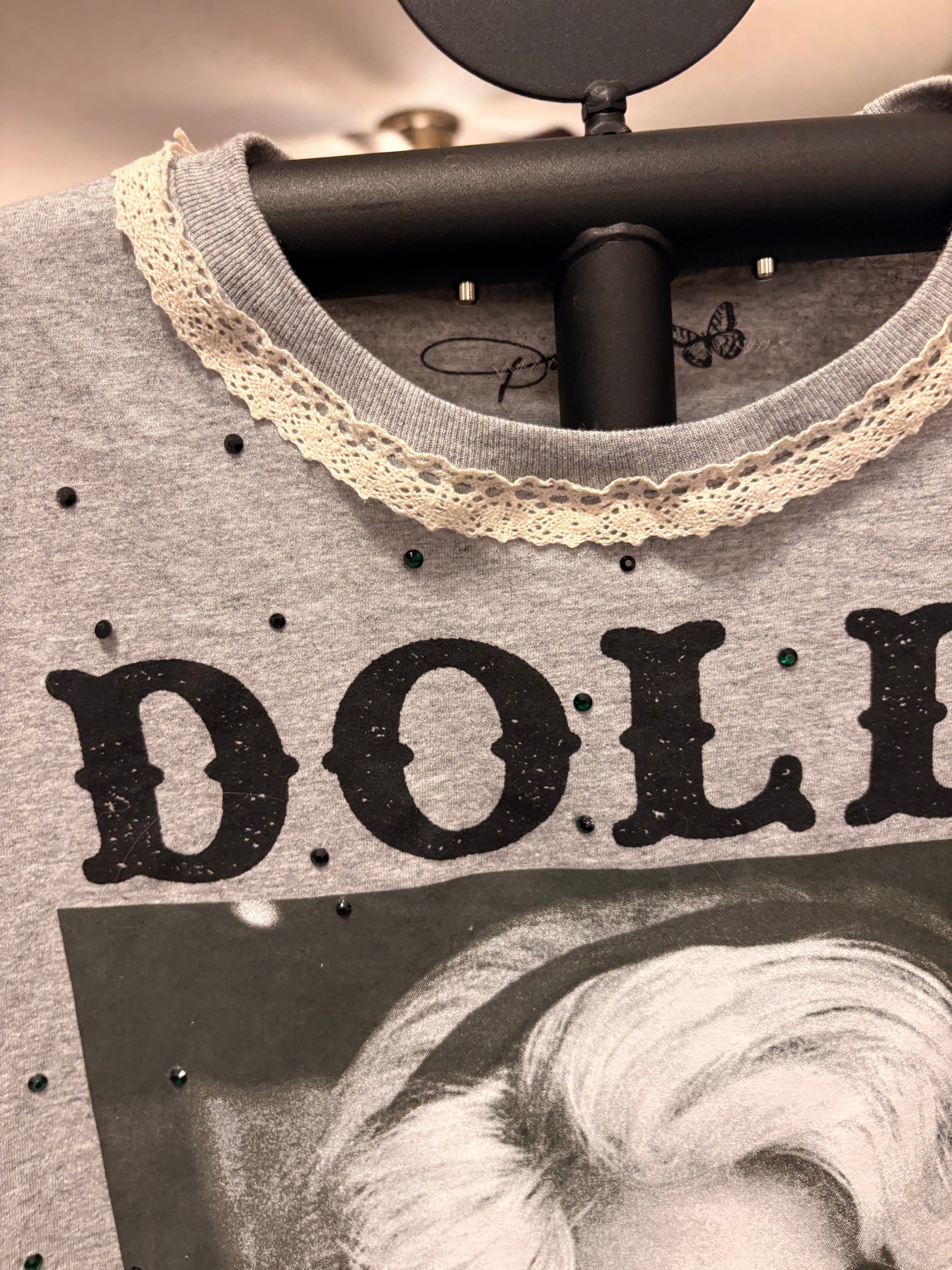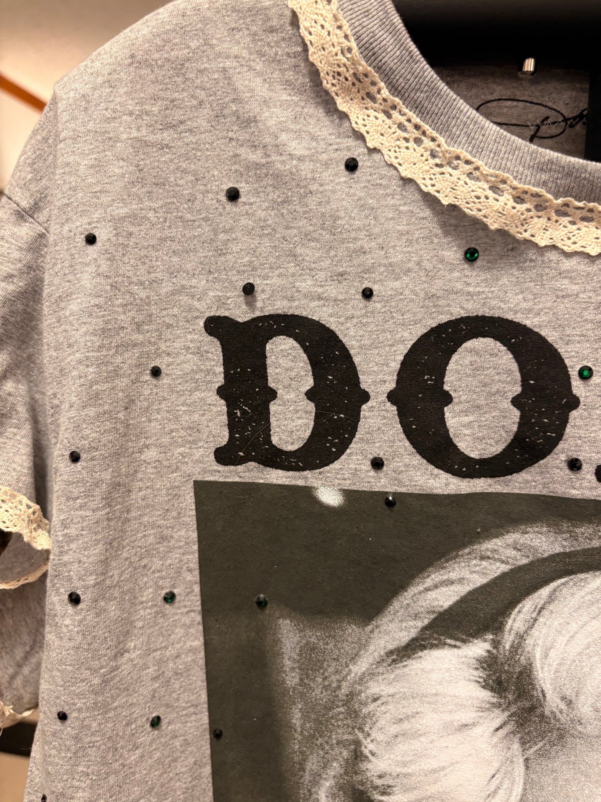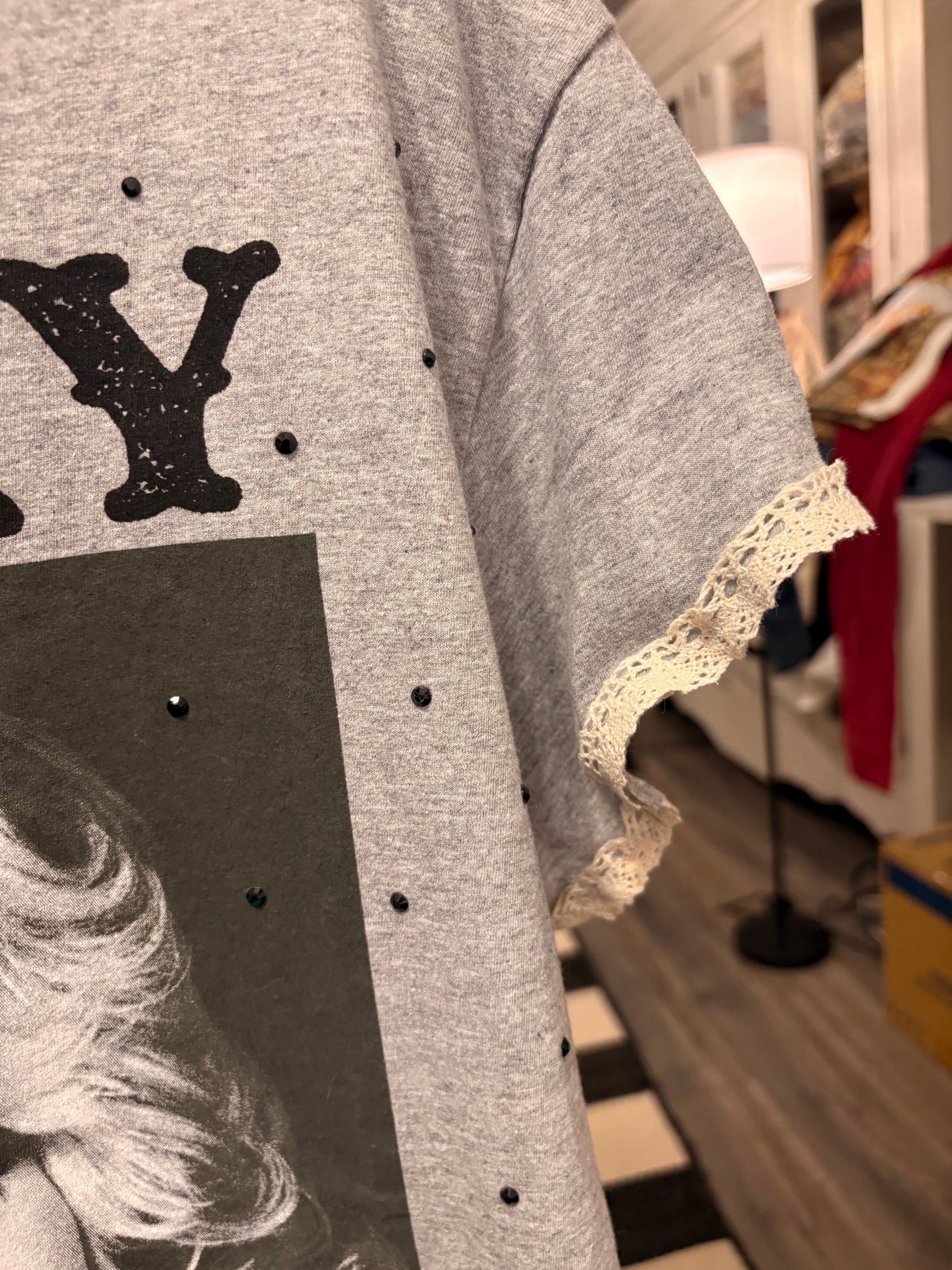 Pretty little tees! Upcycled rock tee adorned with rhinestones and crochet trim. Comfortable and beautiful!! SEW many beautiful details ❤️ Shirt used is a Small
