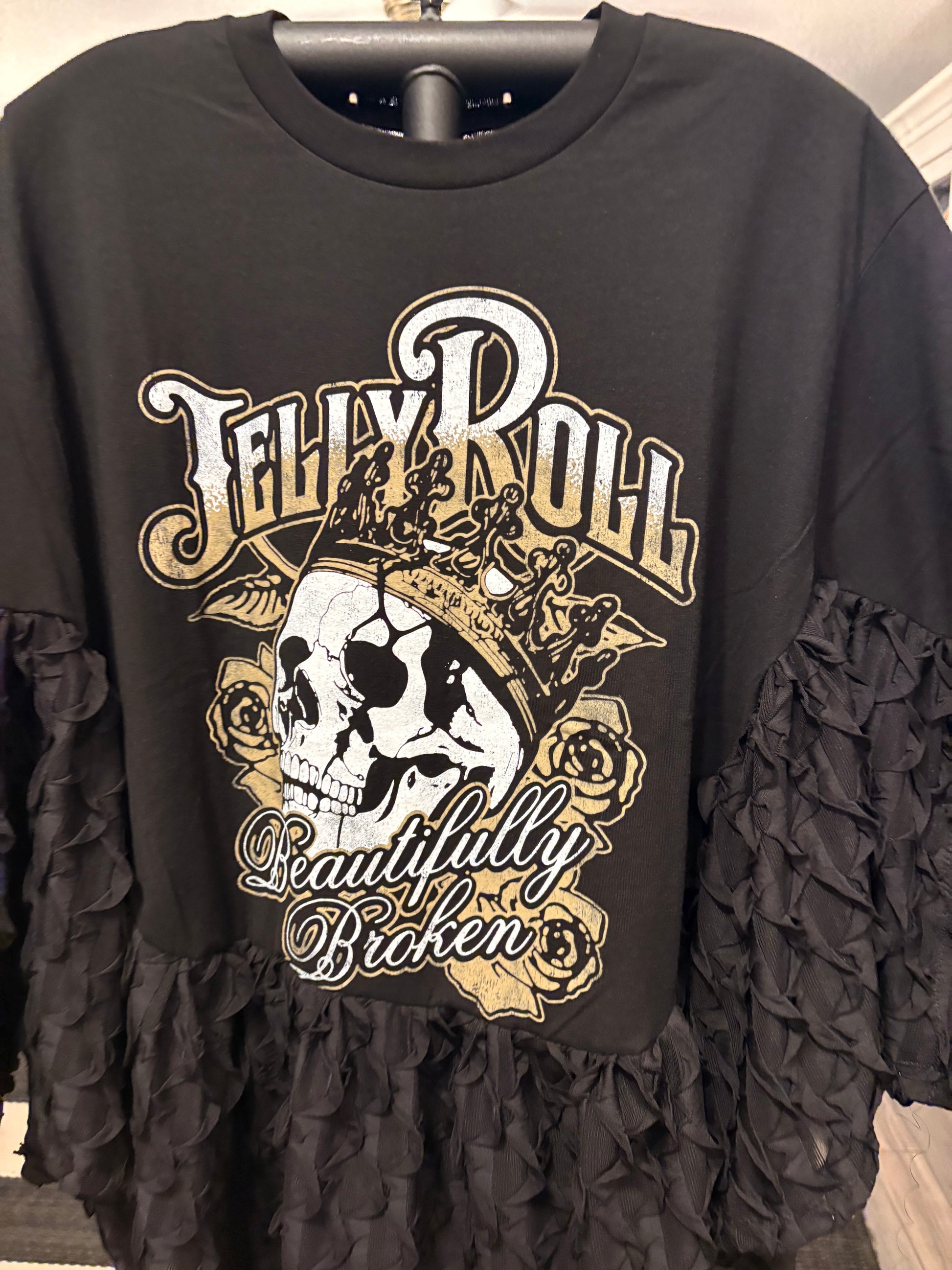 Fabulous black scalloped knit fabric and Upcycled graphic tee used to make this beautiful ruffled poncho. Oversized and GORGEOUS poncho! Super cute and cozy!! Perfect for ALL seasons! Has stitches for arm holes and sides are open..