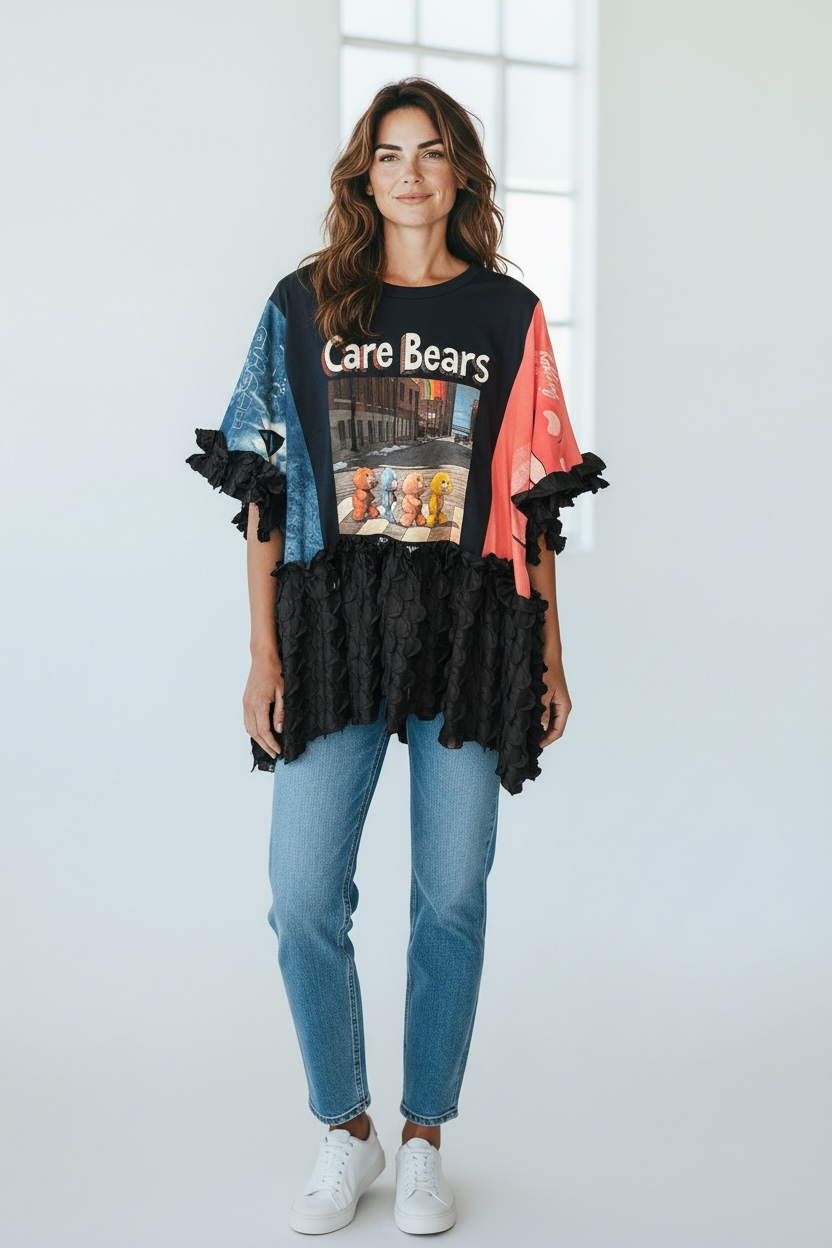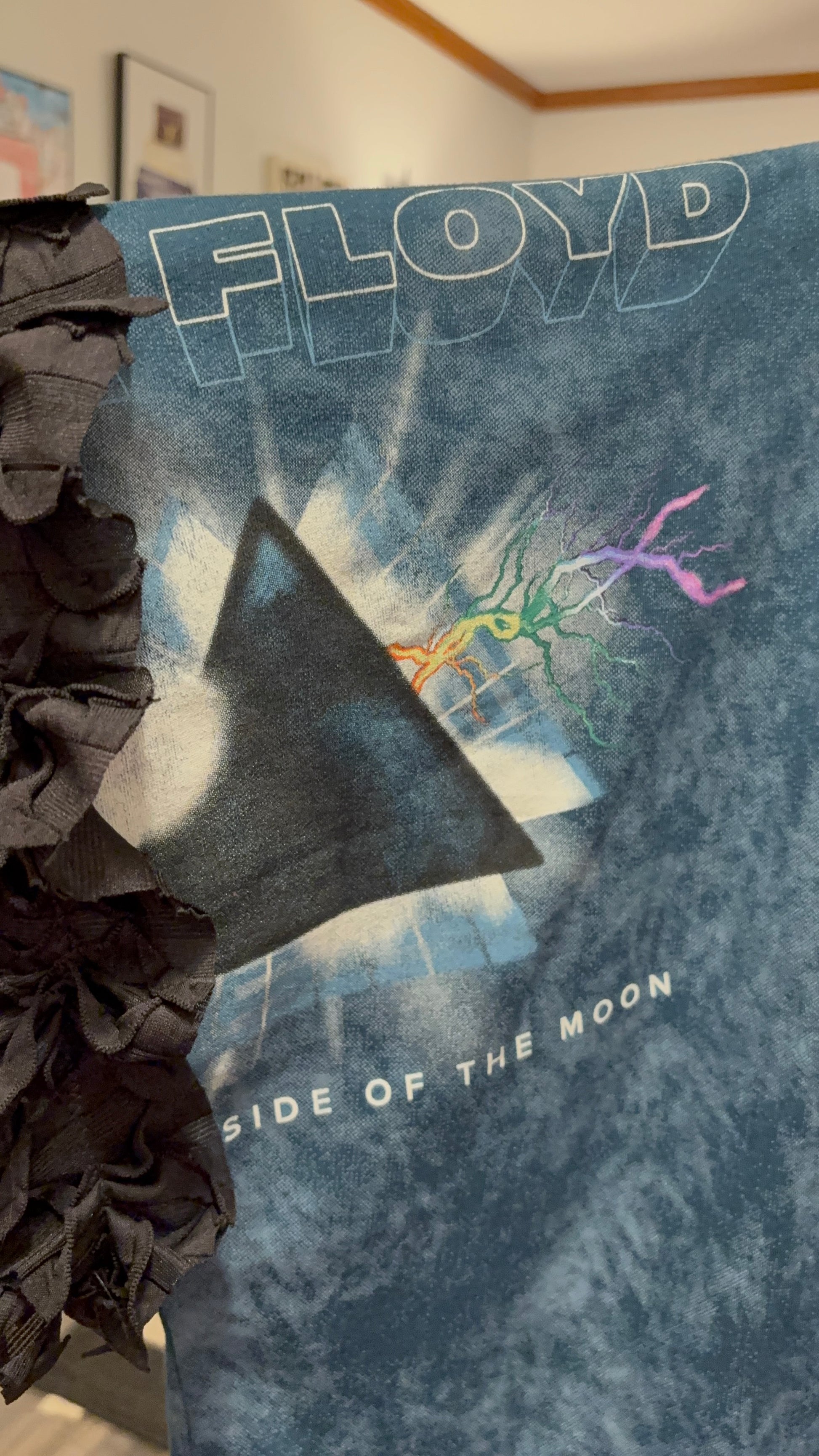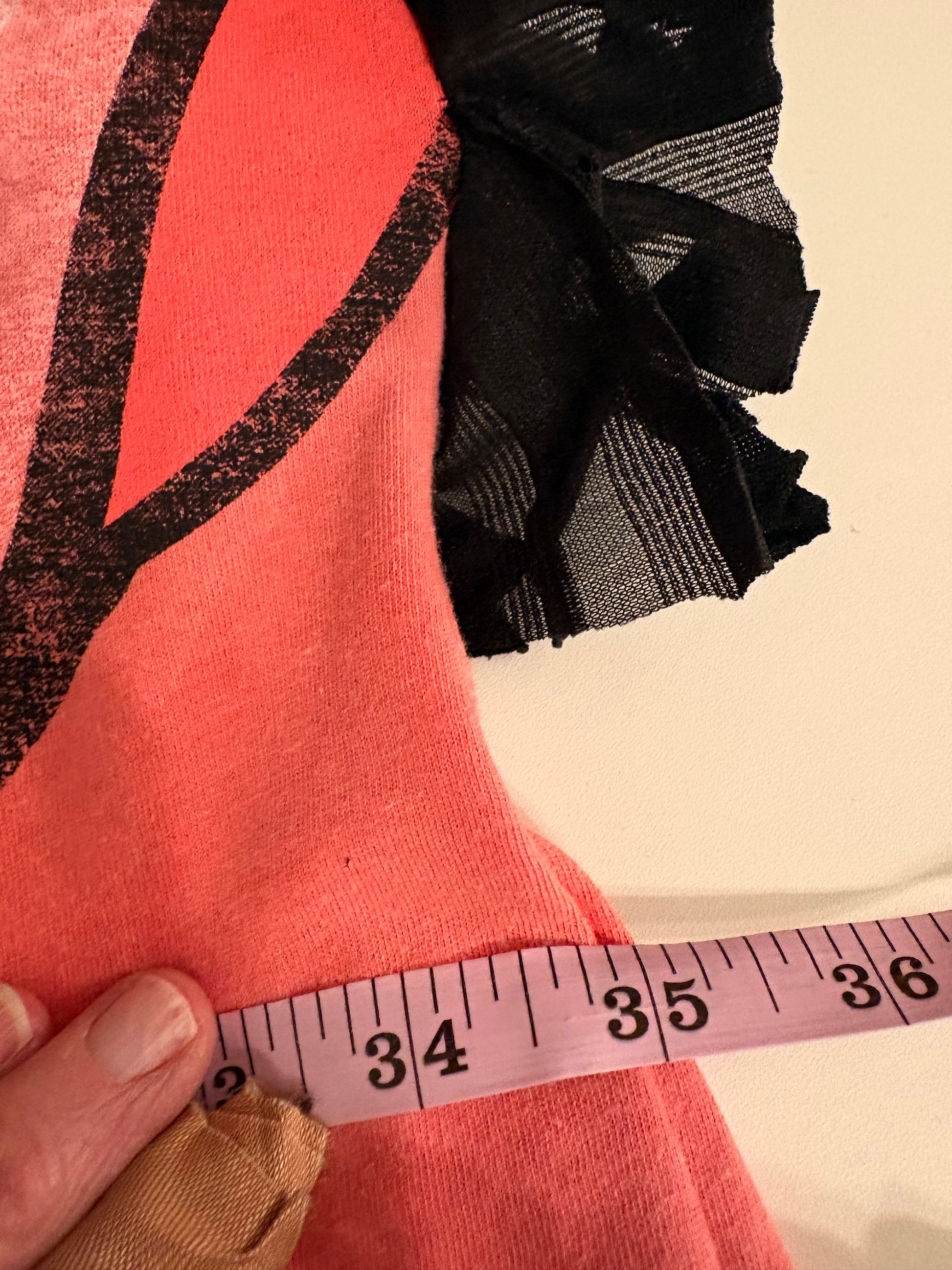 3 Upcycled graphic tees and 4 yards of scalloped knit fabric used to make this FABULOUS ROCKSTAR top. Looks great with absolutely everything! You will ROCK this!!!❤️