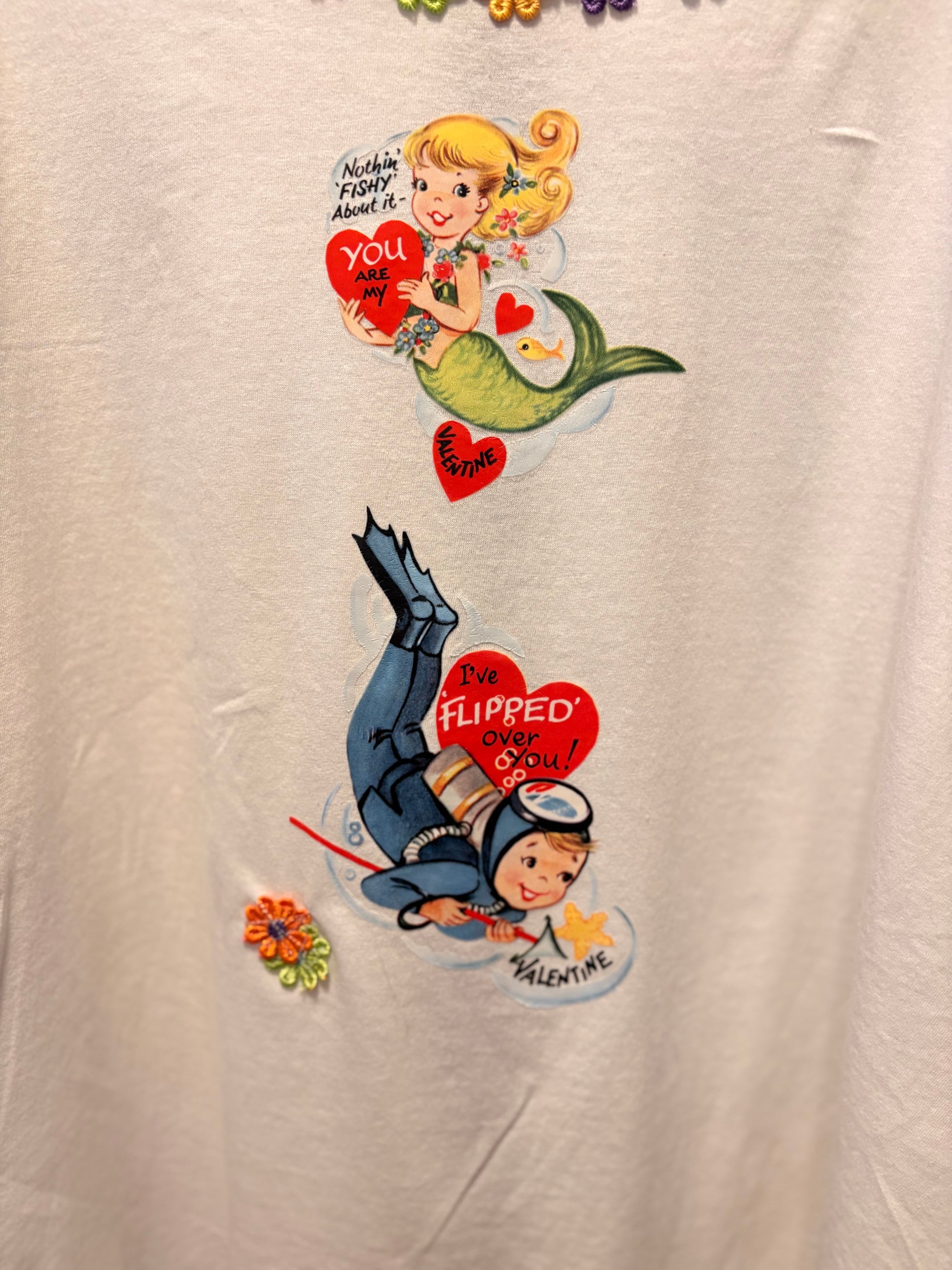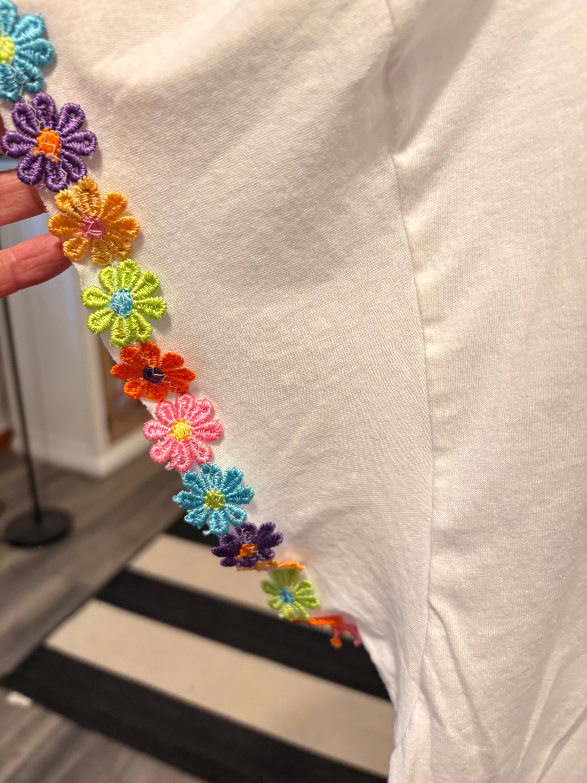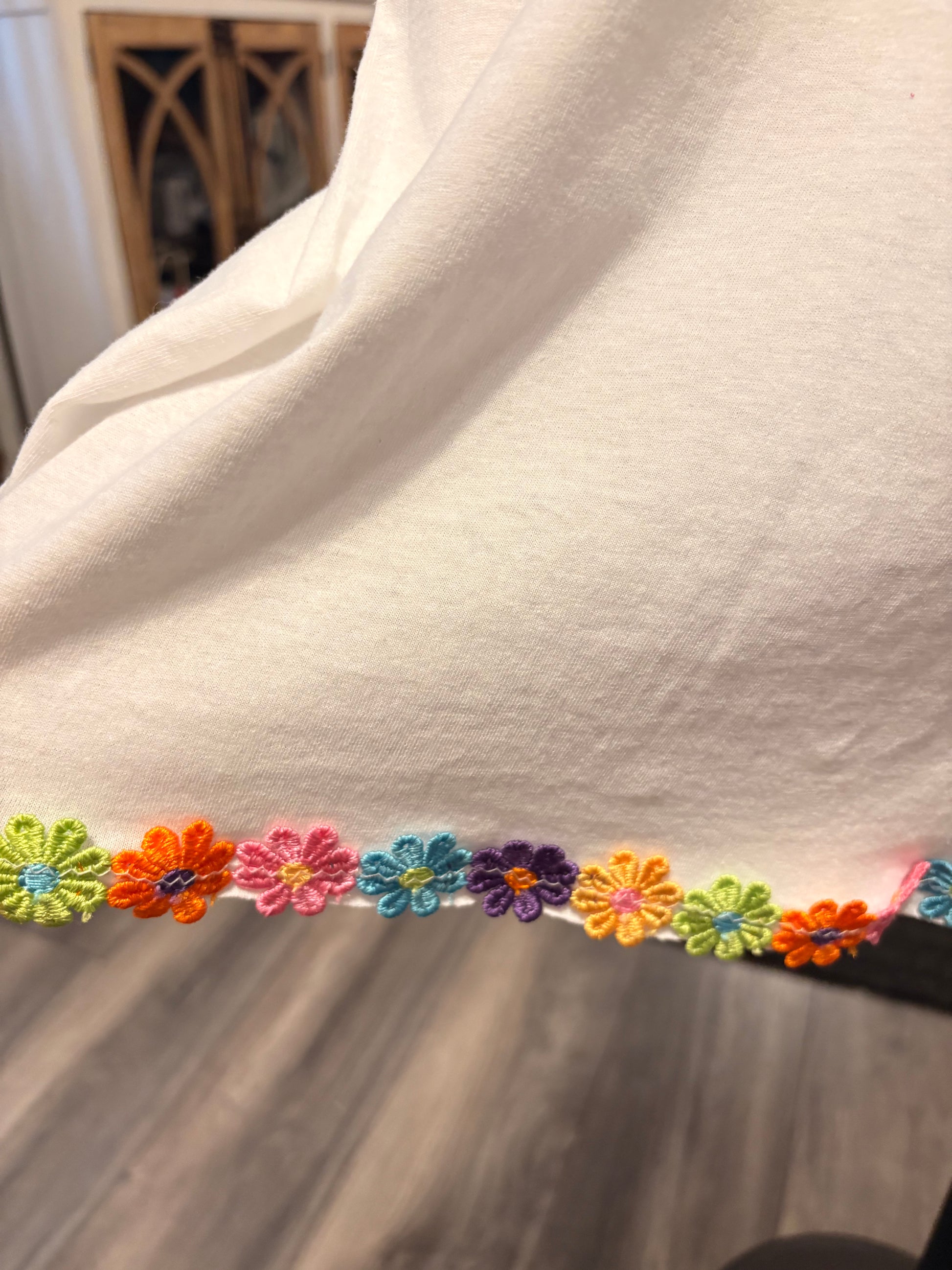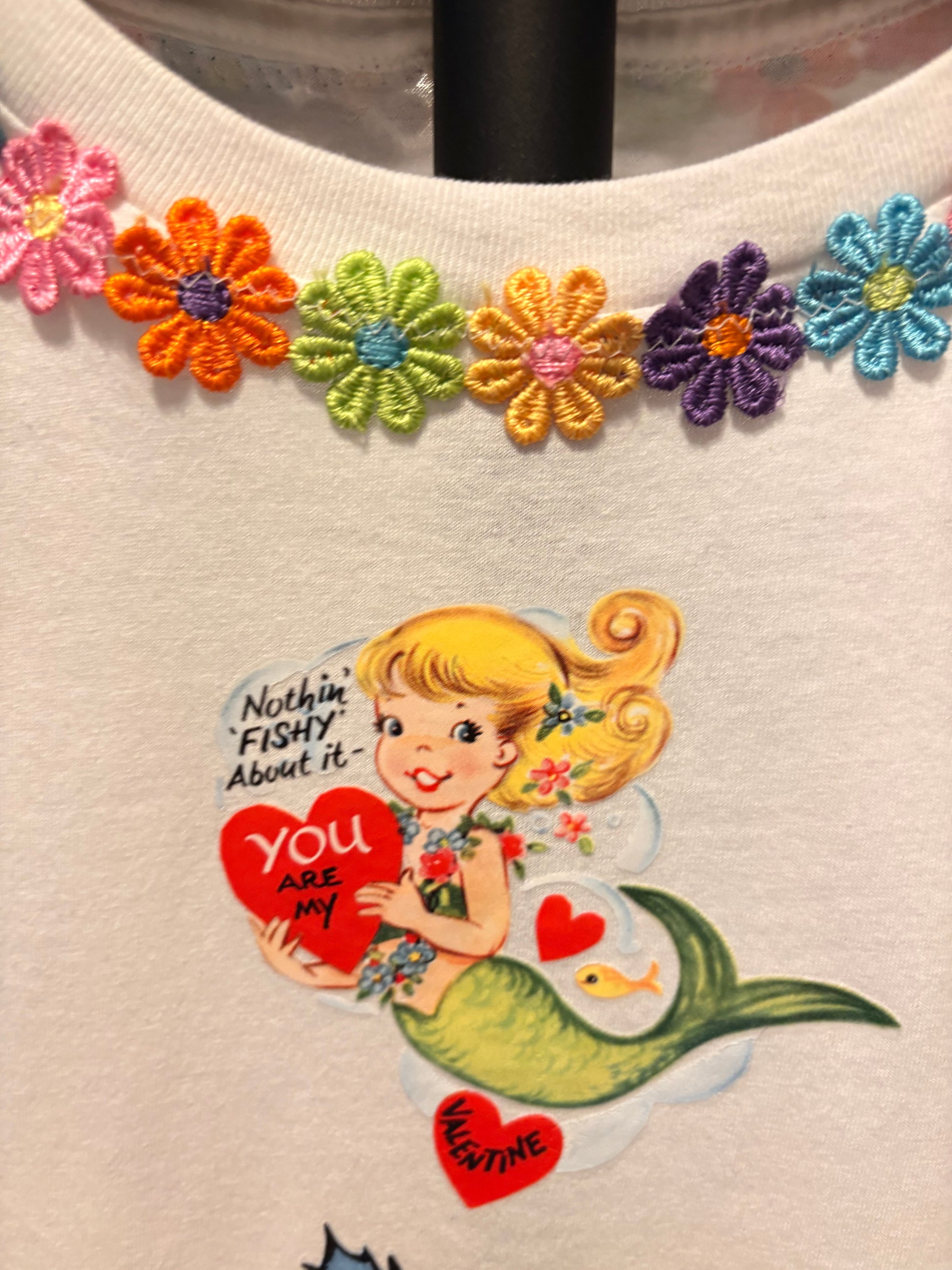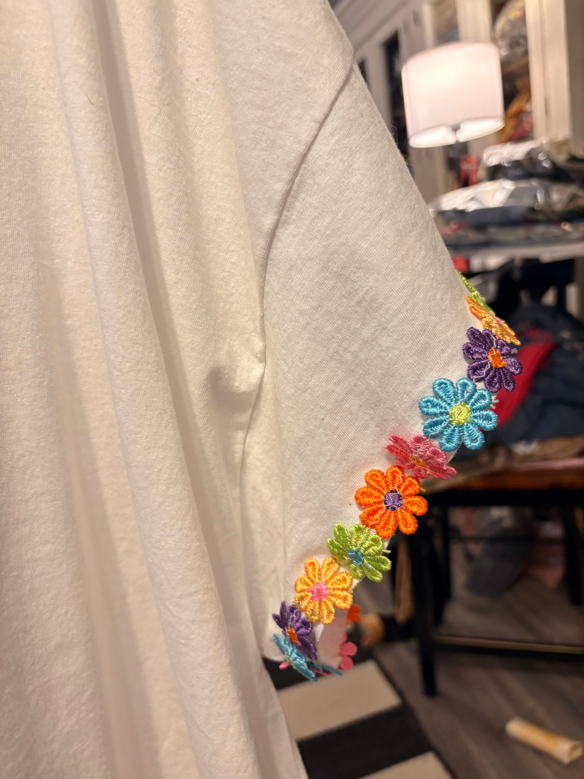 Inspired by Junk Journals. These tees are a collection of favorite things! Upcycled graphic tee and colorful embroidered floral trim. SEW many beautiful details ❤️ Shirt used is a 3X.