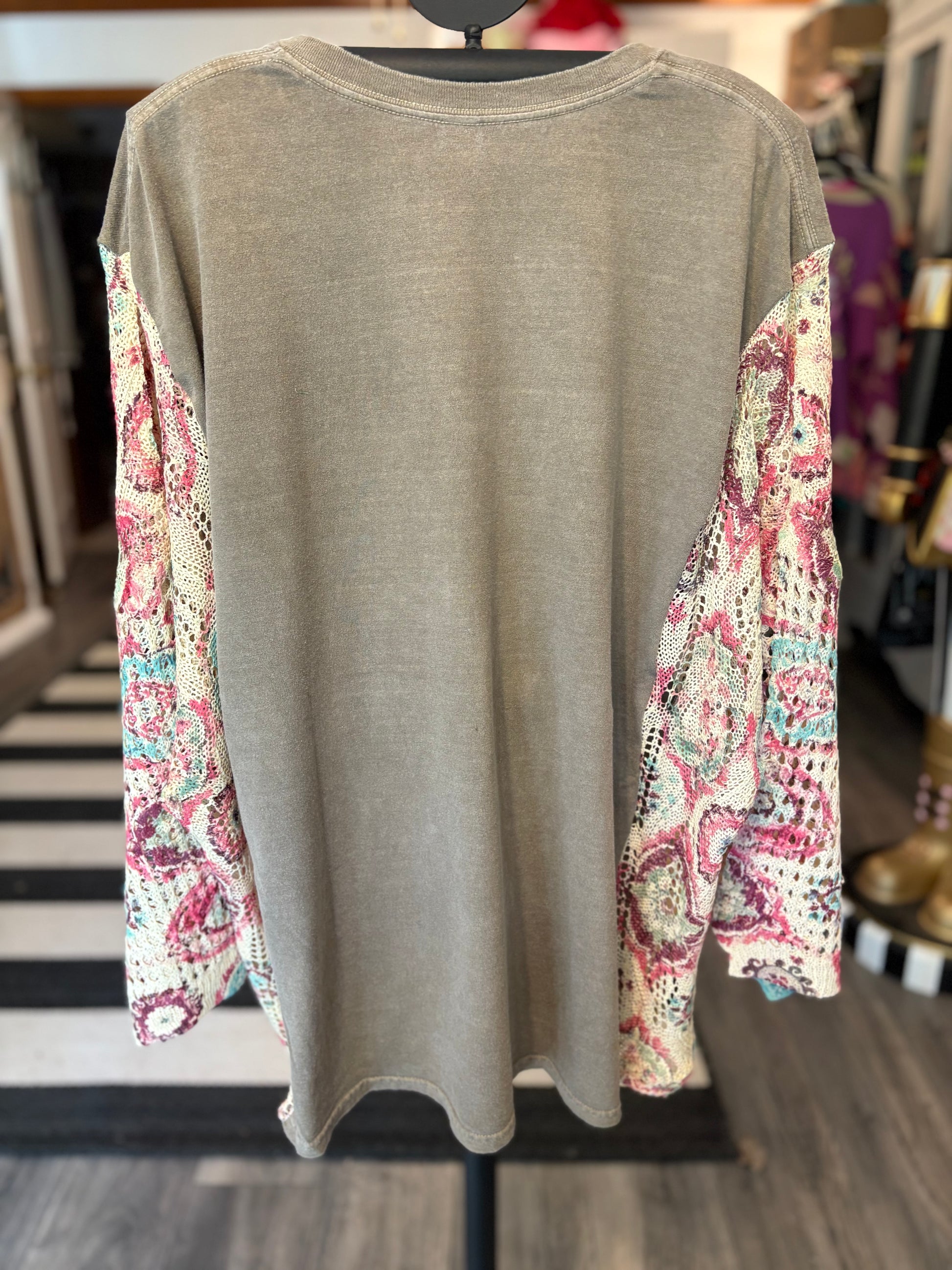 This unique drop sleeve top combines a vintage or upcycled fabric with a graphic tee design to create a sustainable, one-of-a-kind piece. With a relaxed oversized silhouette and long drop sleeves, it’s a comfortable and stylish layering option for casual outfits, streetwear, or cozy lounge looks.