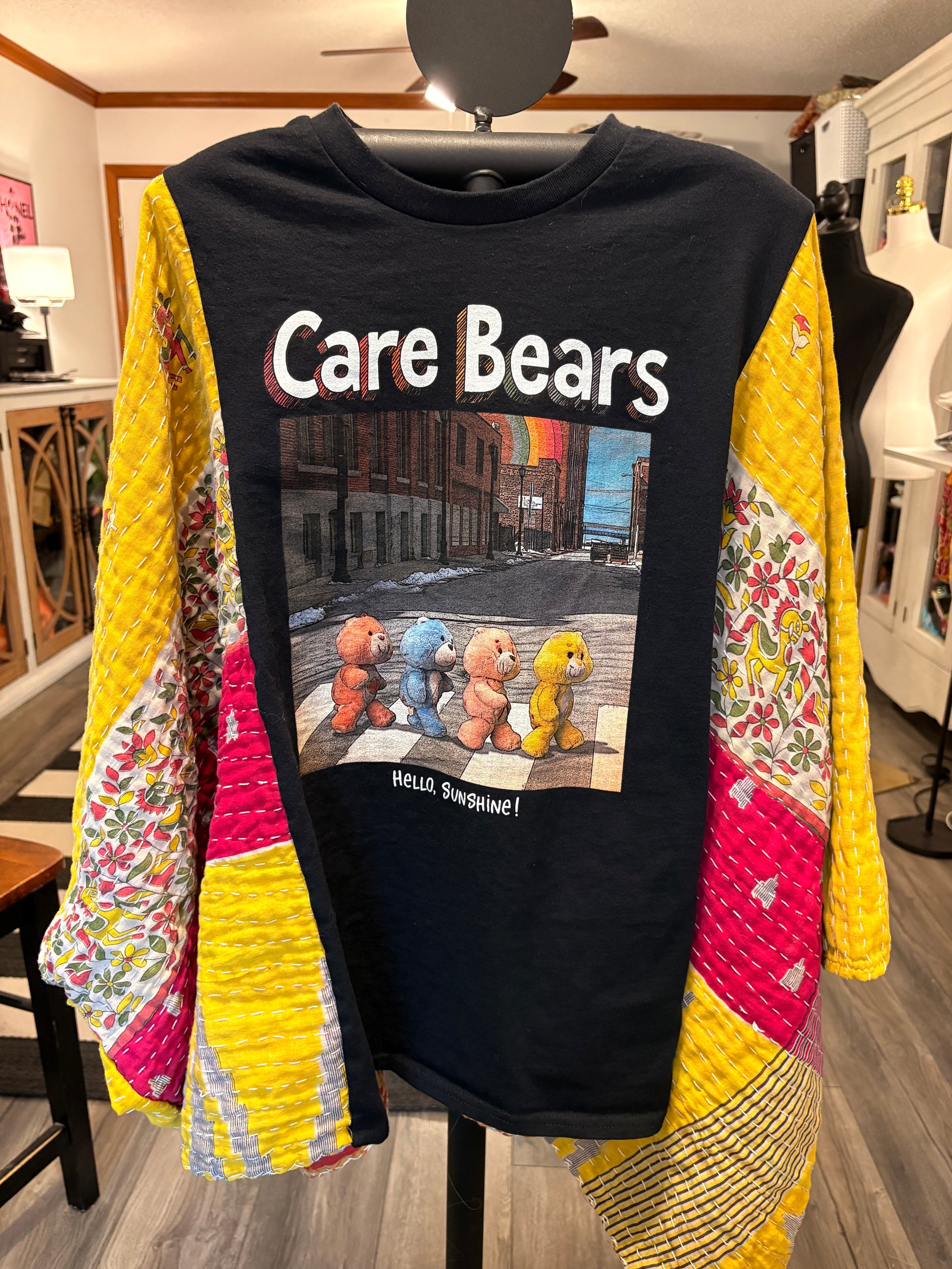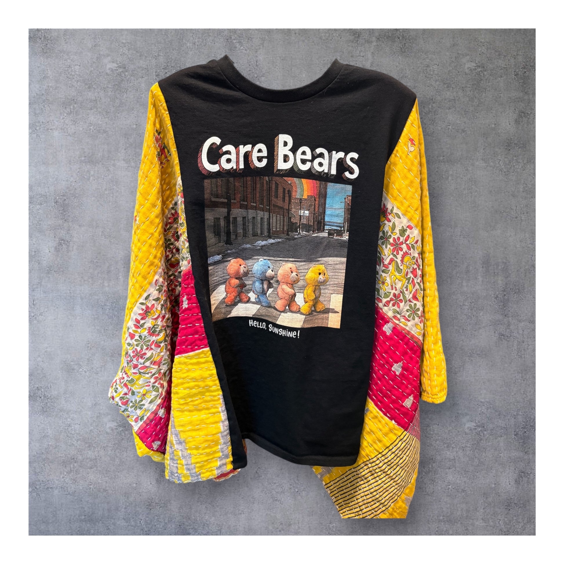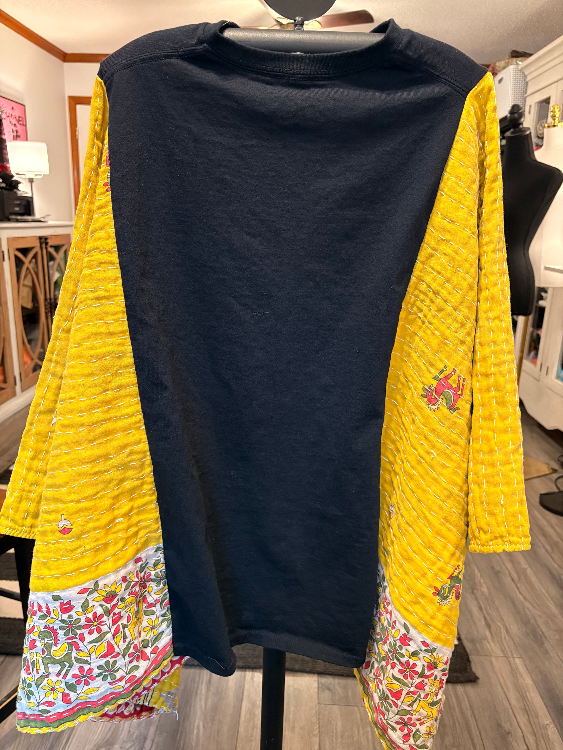 Beautiful vintage Kantha quilt and graphic tee paired to make this FABULOUS Upcycled tee. Vintage Kantha quilts have been well loved. They may have white strings (which can be cut) , slight holes, small stains,and may be weathered, rustic and tattered which all lends to the vintage beauty of the top. Perfectly imperfect!!