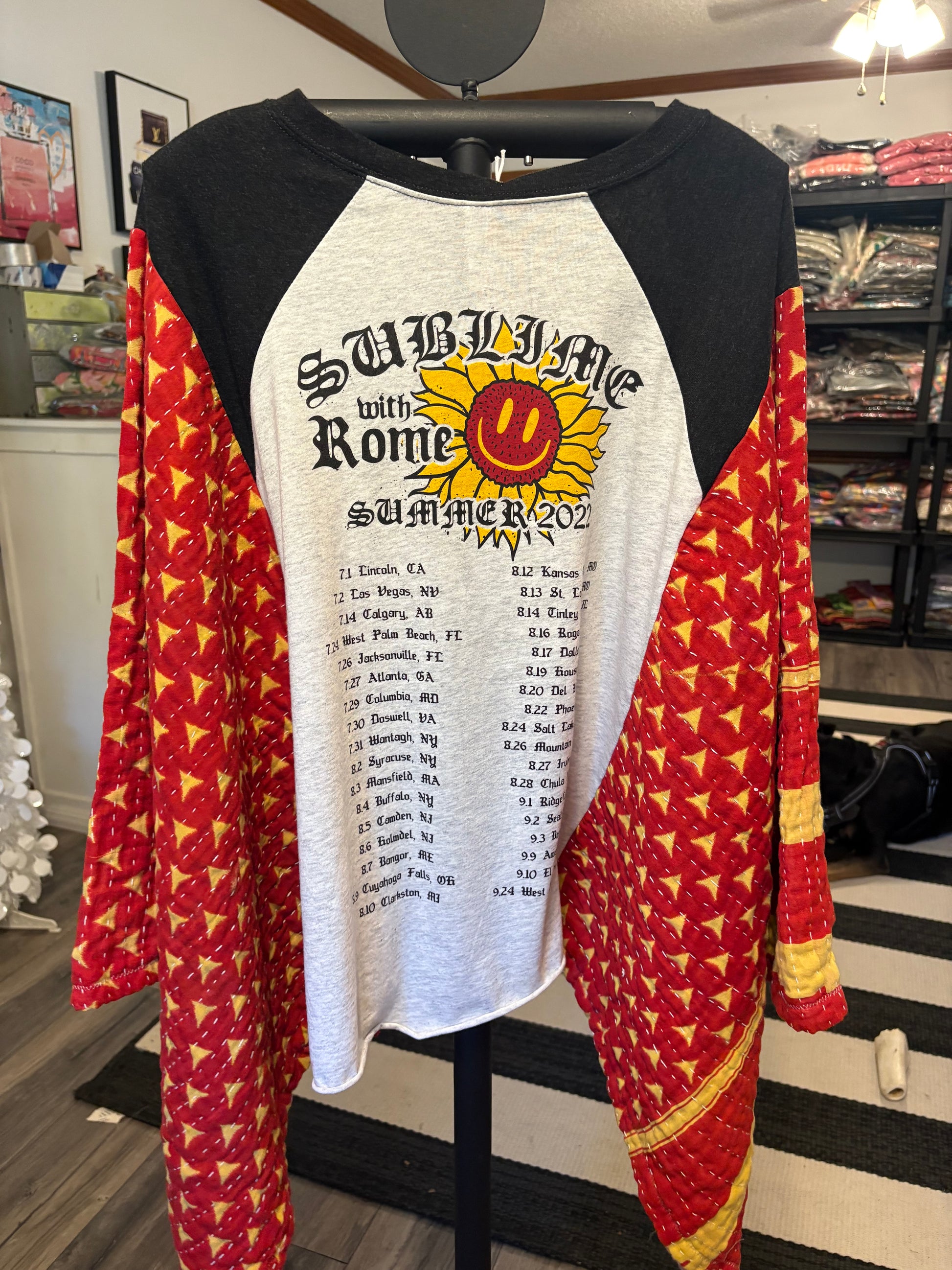 Beautiful vintage Kantha quilt and graphic tee paired to make this FABULOUS Upcycled tee. Vintage Kantha quilts have been well loved. They may have white strings (which can be cut) , slight holes, small stains,and may be weathered, rustic and tattered which all lends to the vintage beauty of the top. Perfectly imperfect!!