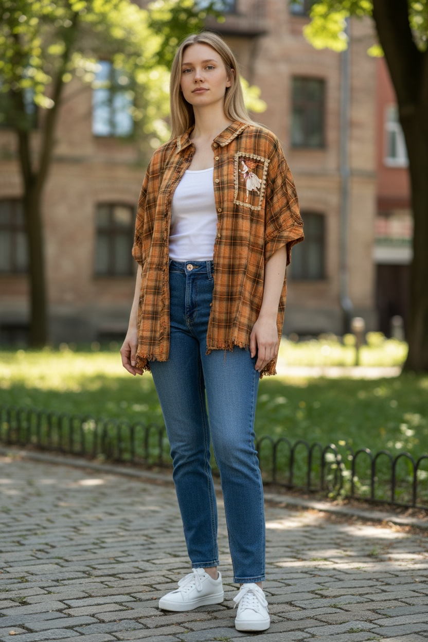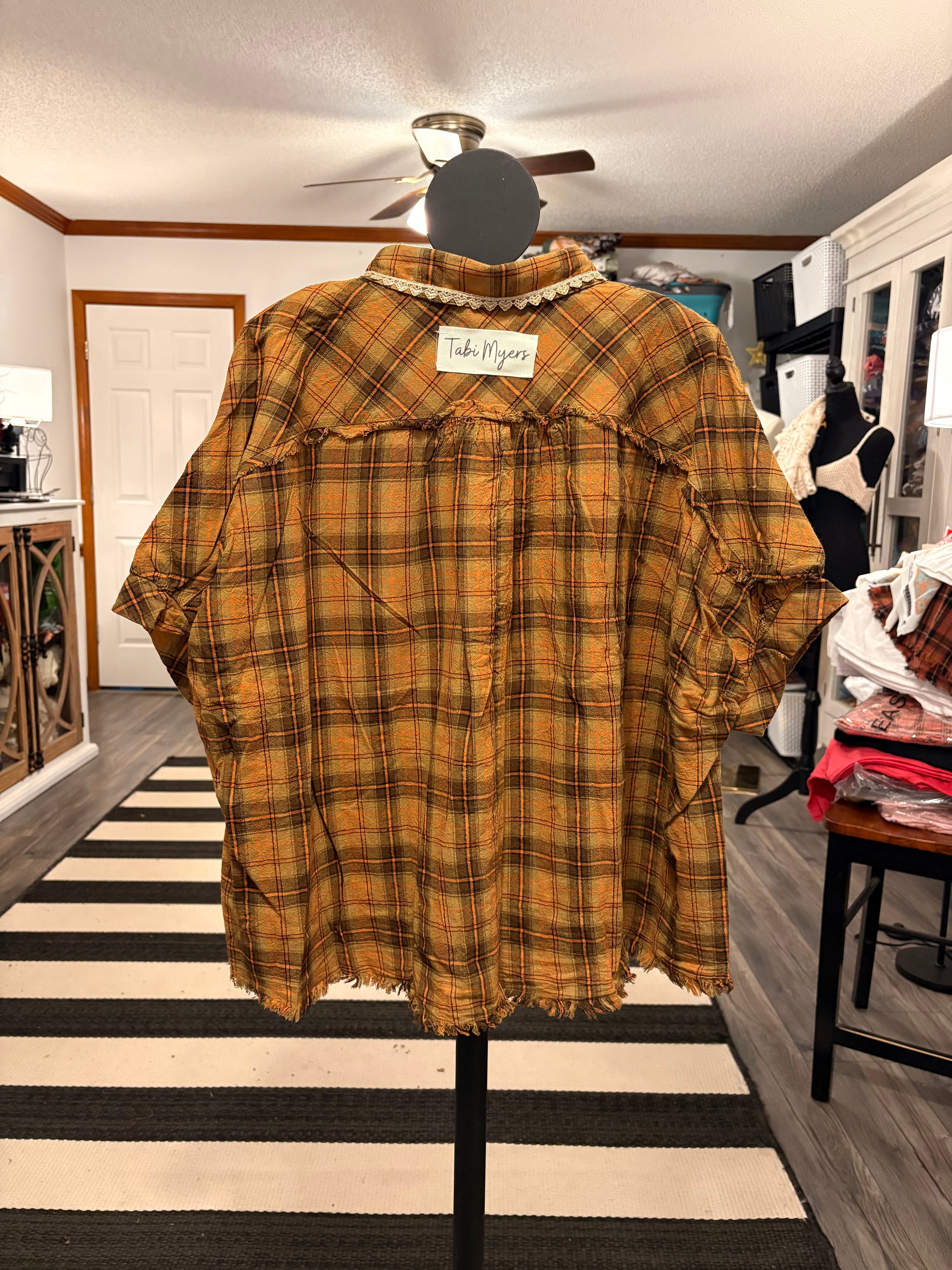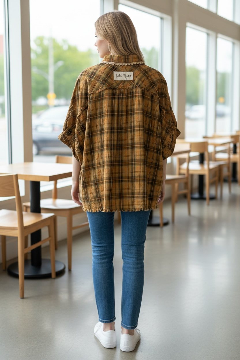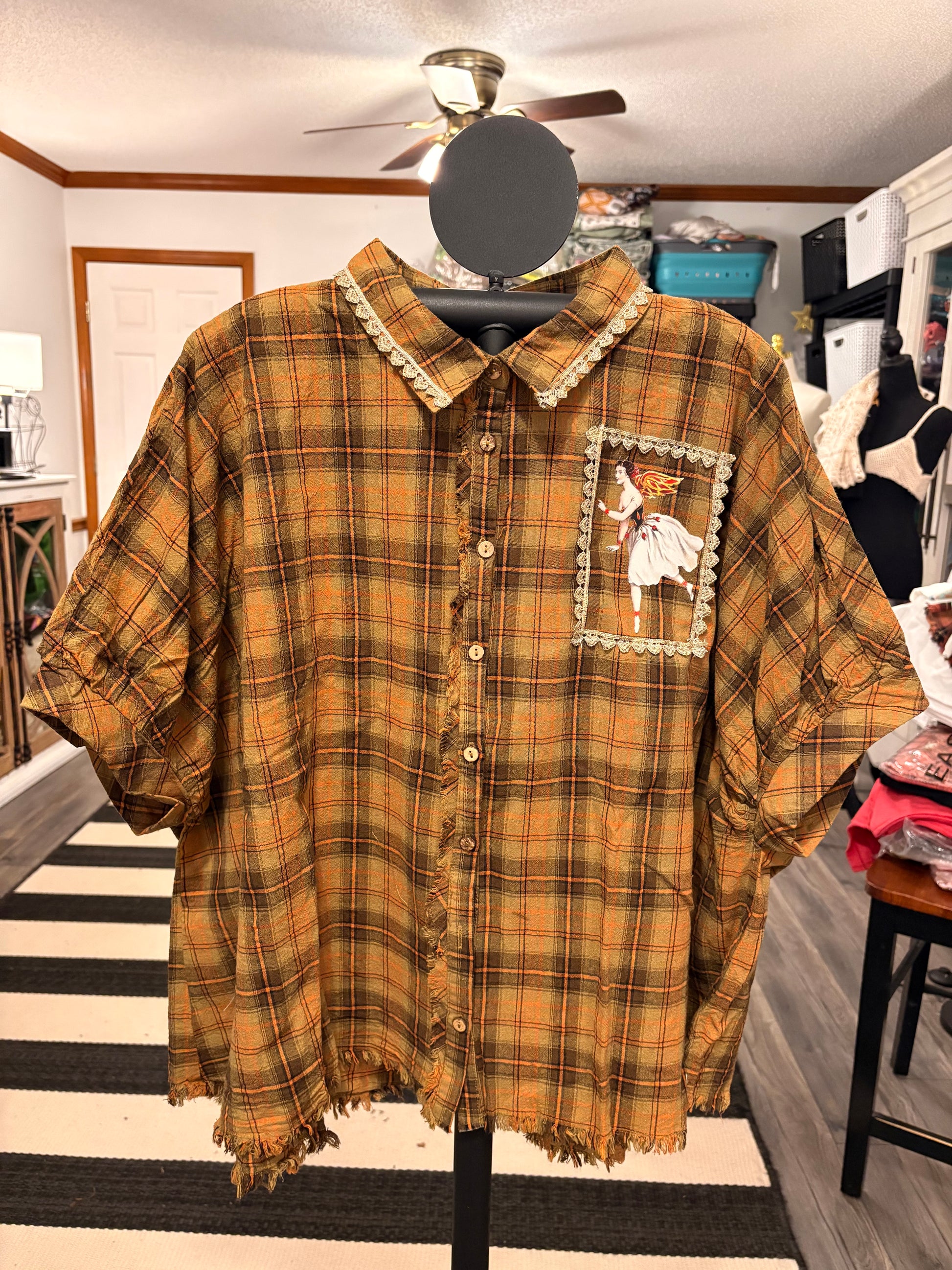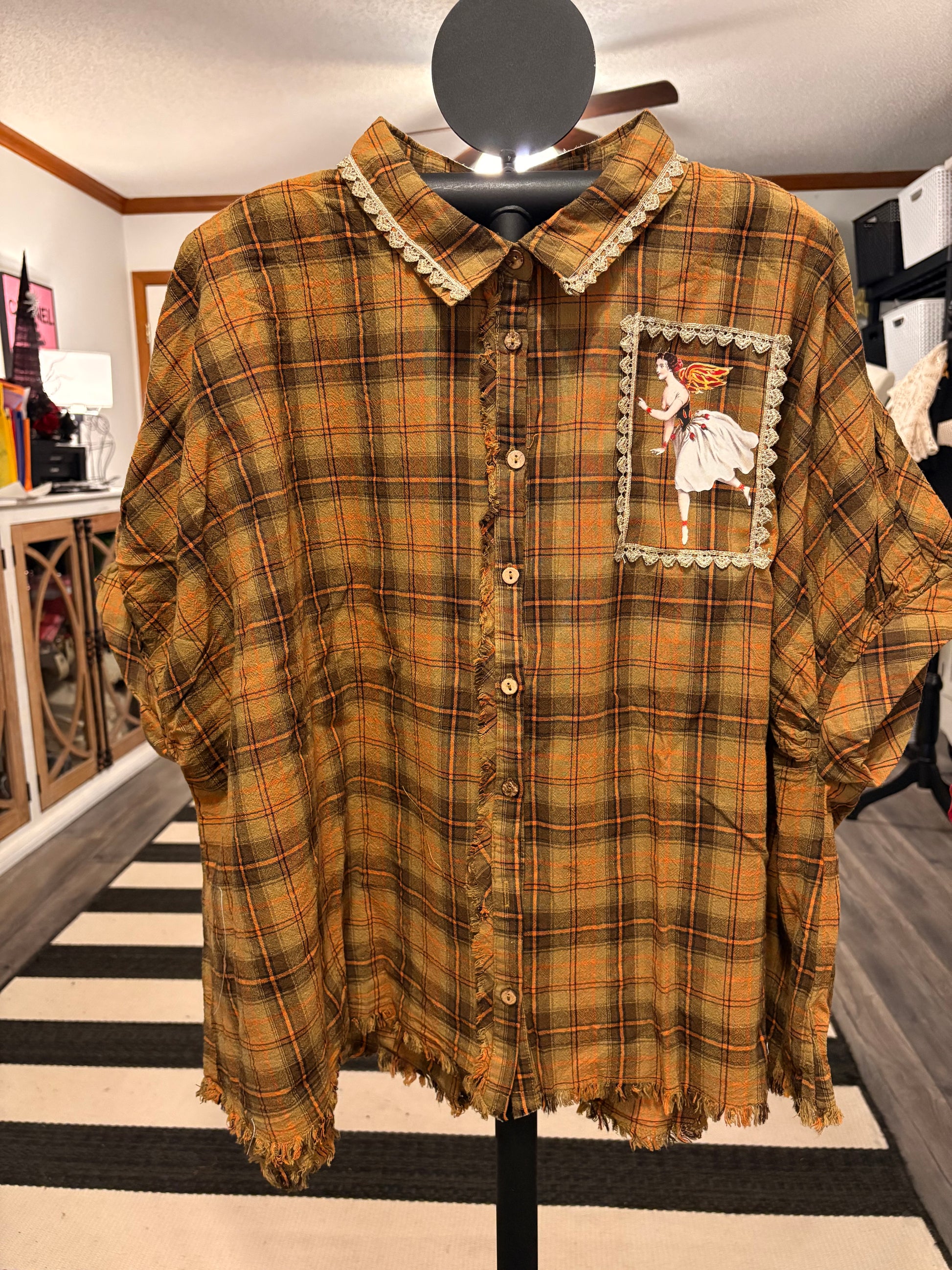 Inspired by Junk Journals.  These tops are a collection of favorite things! Upcycled plaid top with vintage graphics design on the back and front, and crochet and embroidery trim detail. SEW many beautiful details ❤️