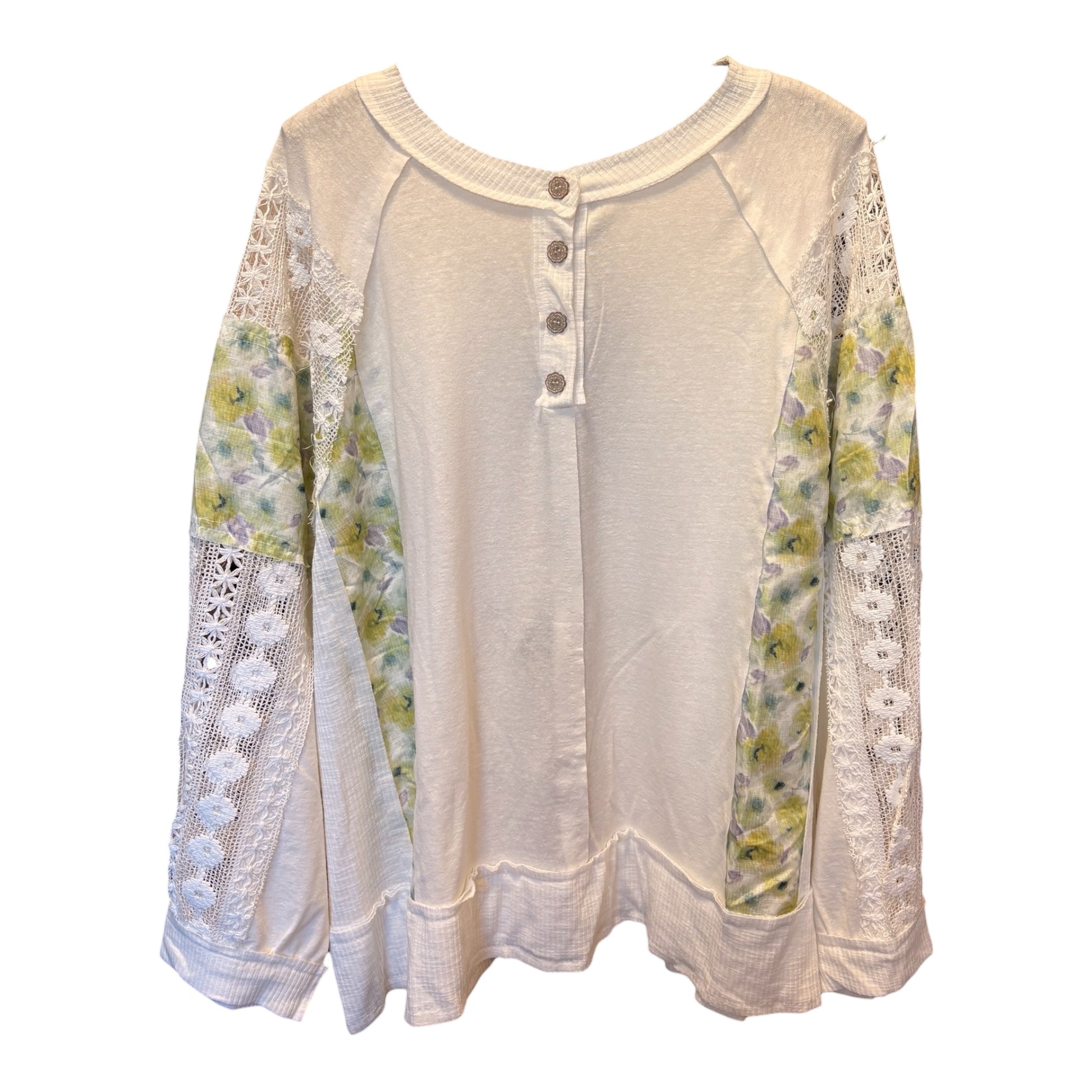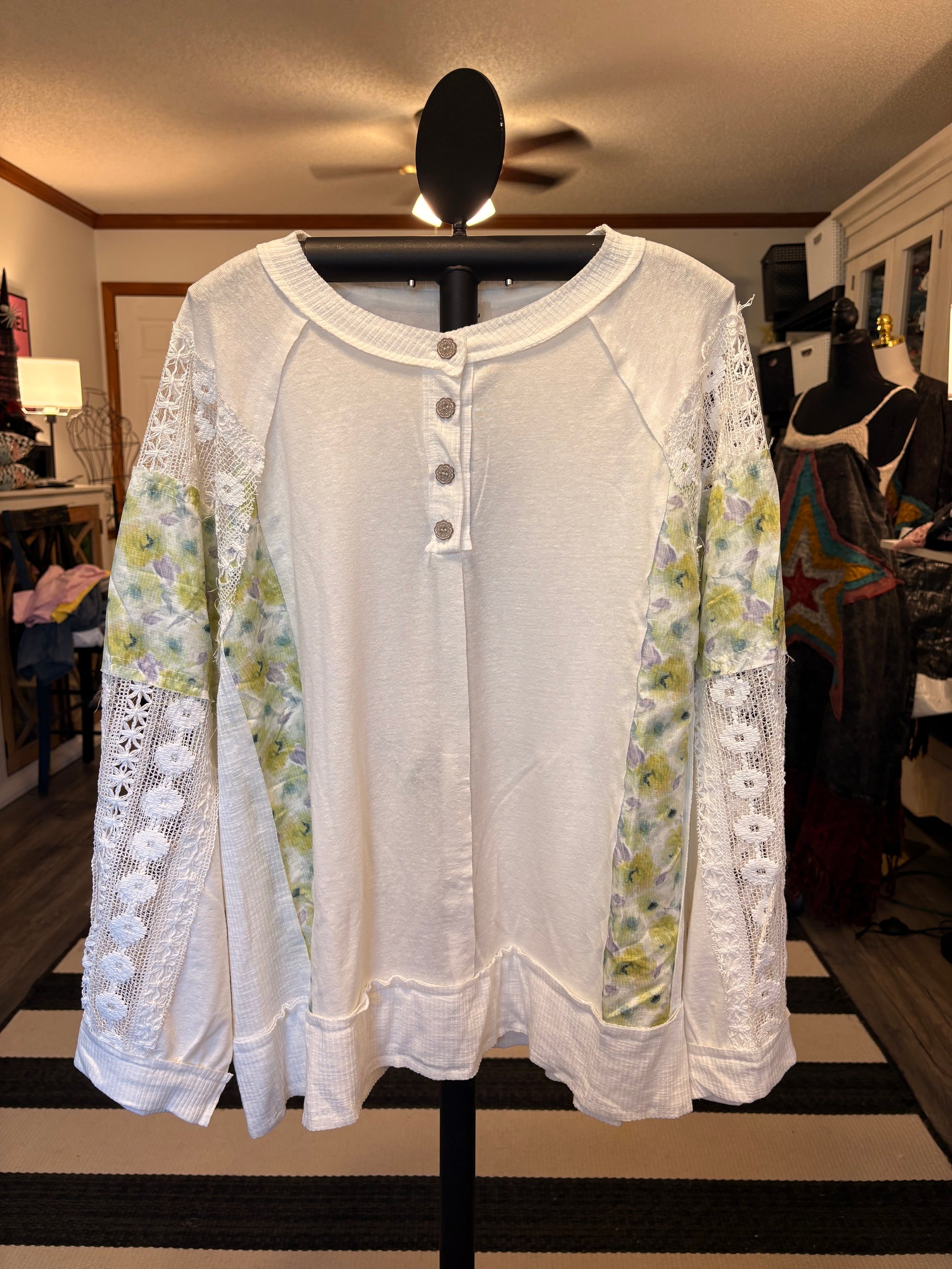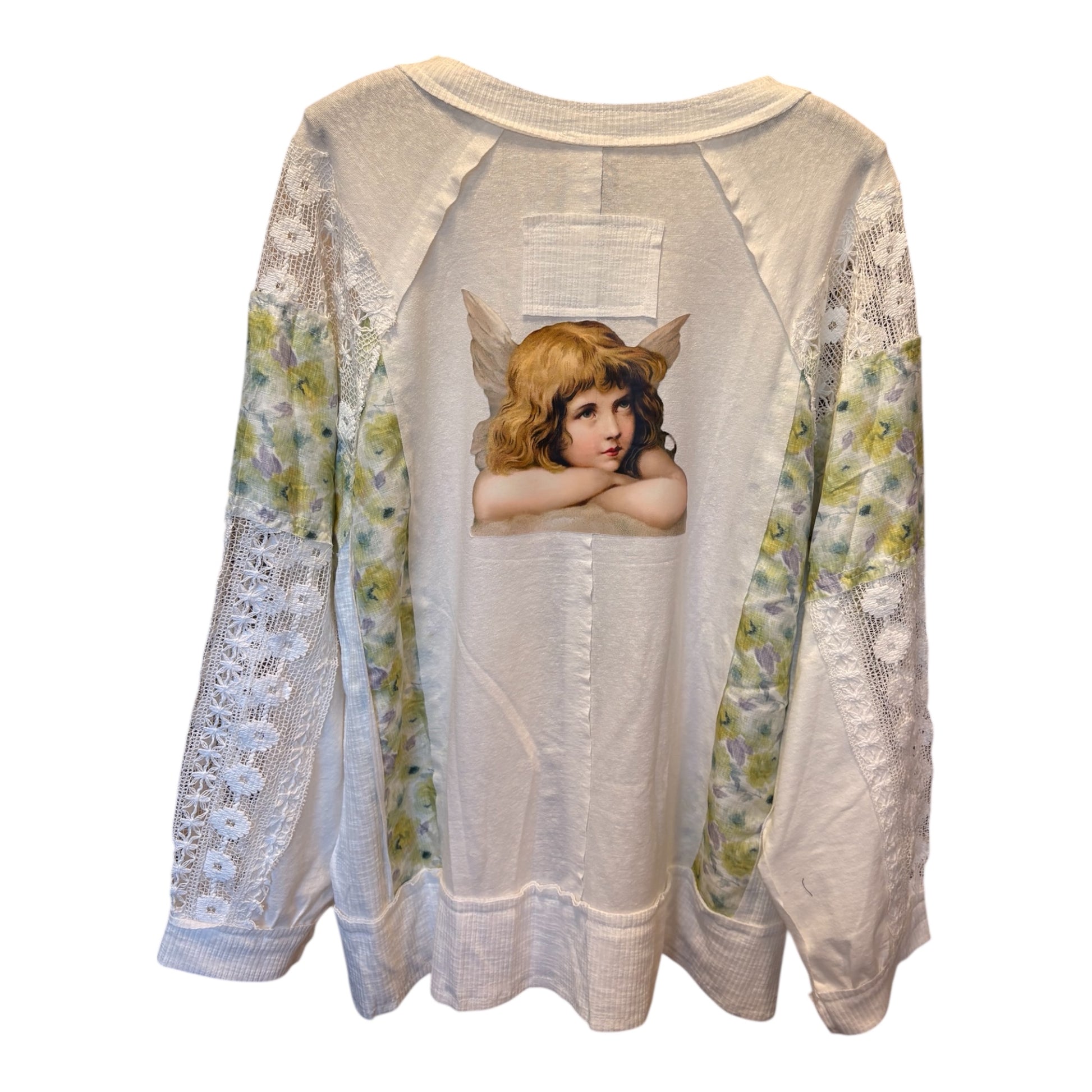 Inspired by Junk Journals. These tees are a collection of favorite things. Upcycled knit top is patchworked, frayed with beautiful lace trim and vintage image on back. SEW many beautiful details ❤️