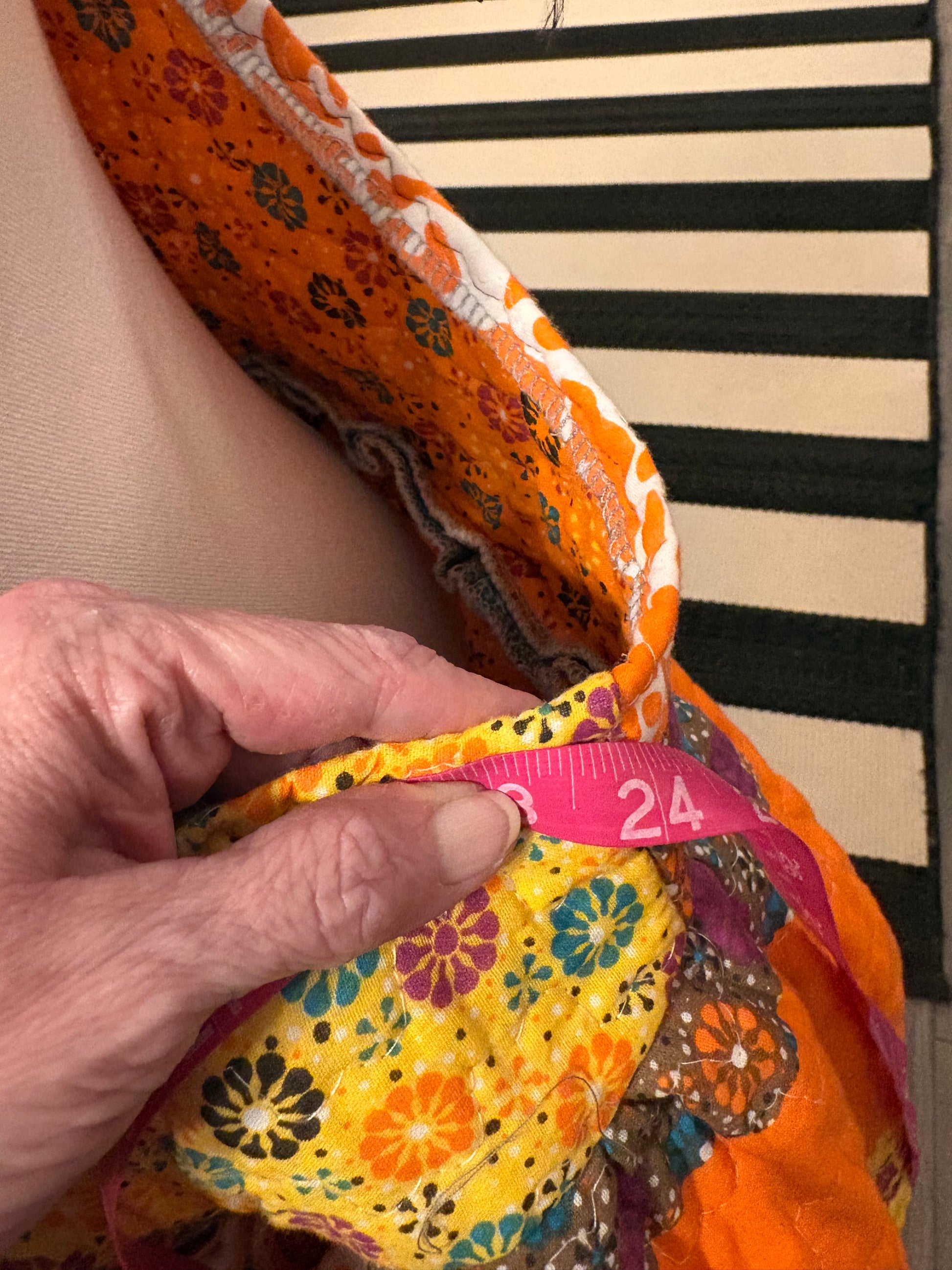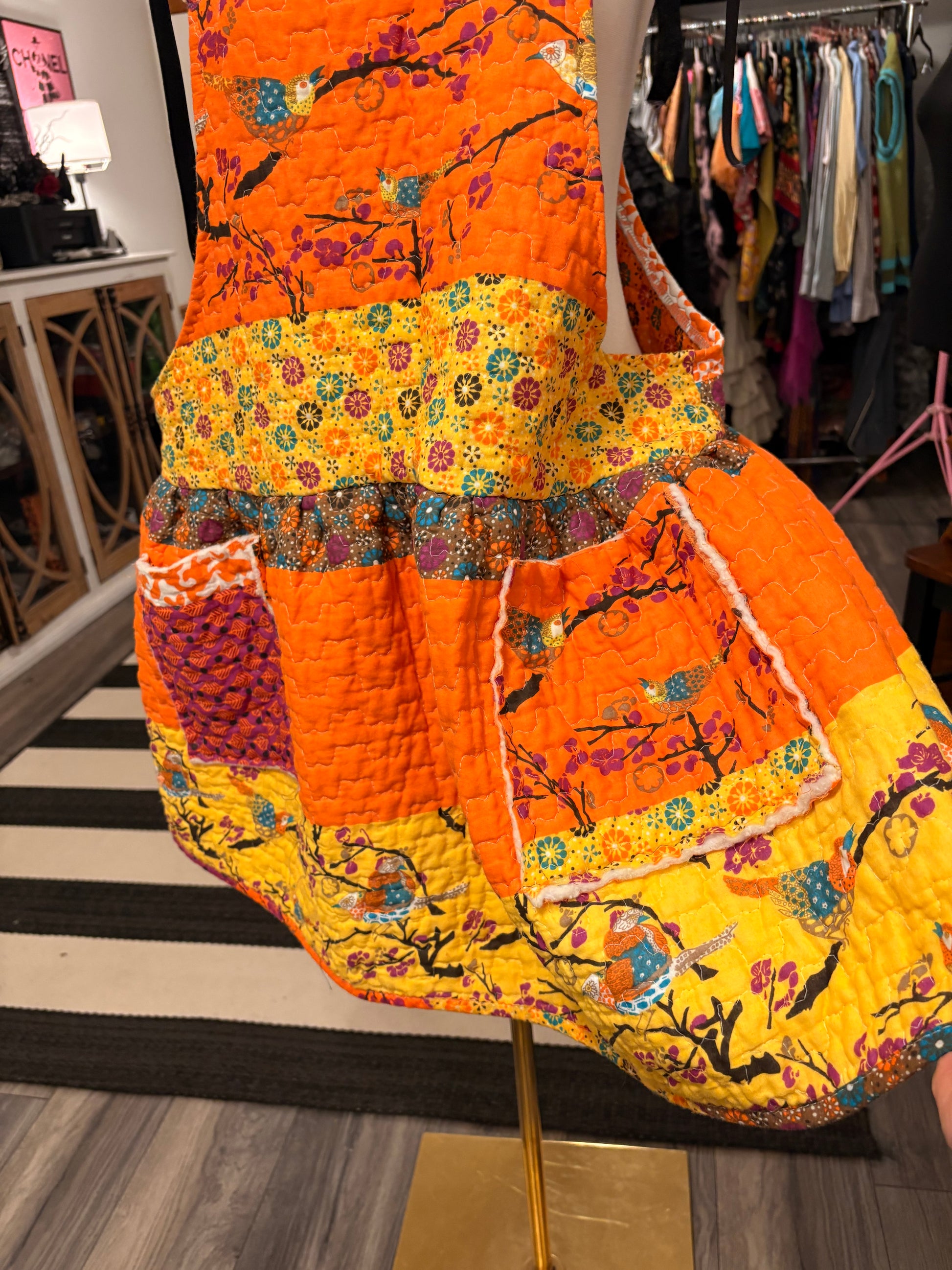 Upcycled quilt to make this super cute art smock!! Velvet ribbon, adjustable neckline, gathered waist, and pockets!! Looks so cute over a tee and paired with jeans, leggings or a skirt!!