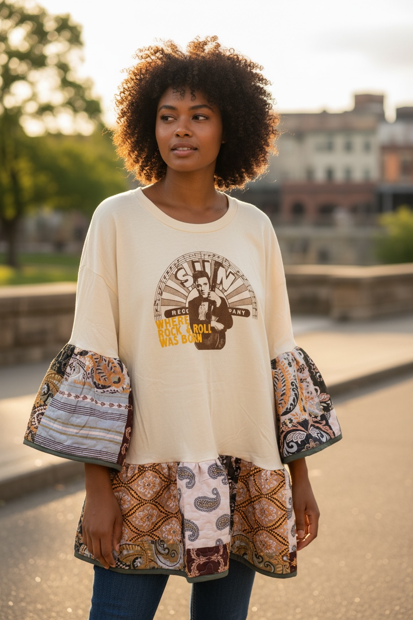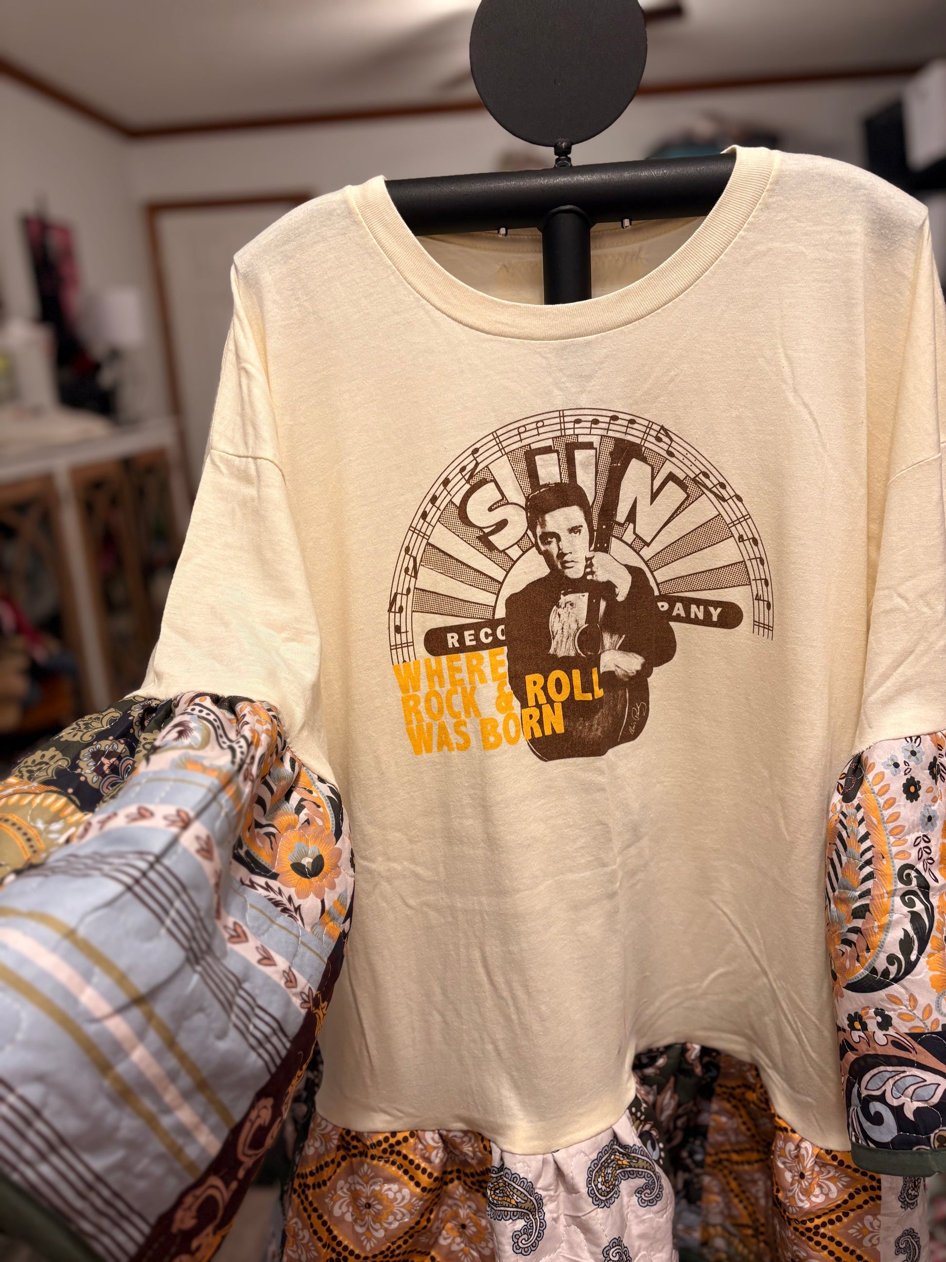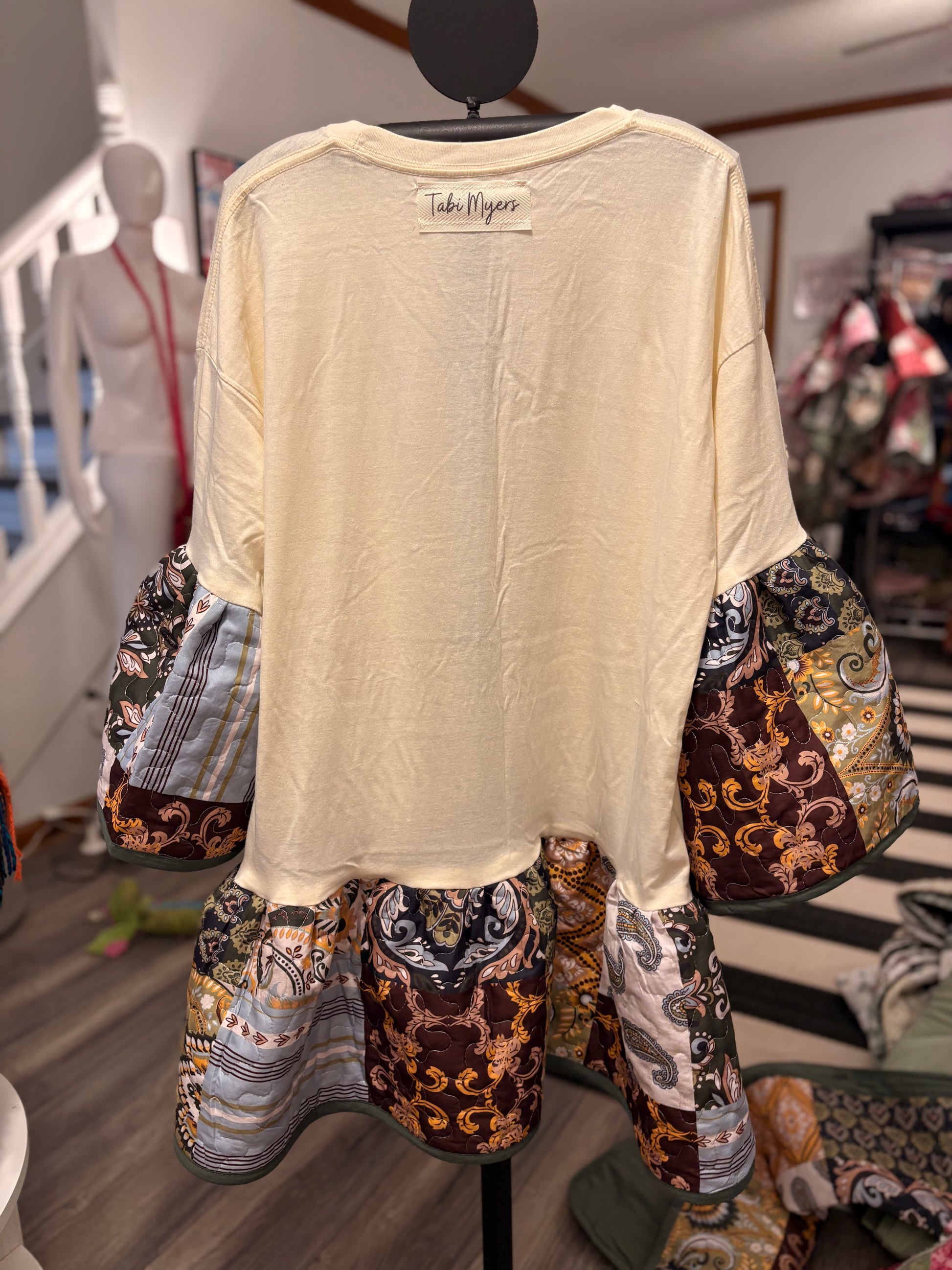 Upcycled graphic tee and quilt used to make this FABULOUS jumper. So cozy and CUTE!! Looks so cute over with tights and boots! Tee used is a 2X