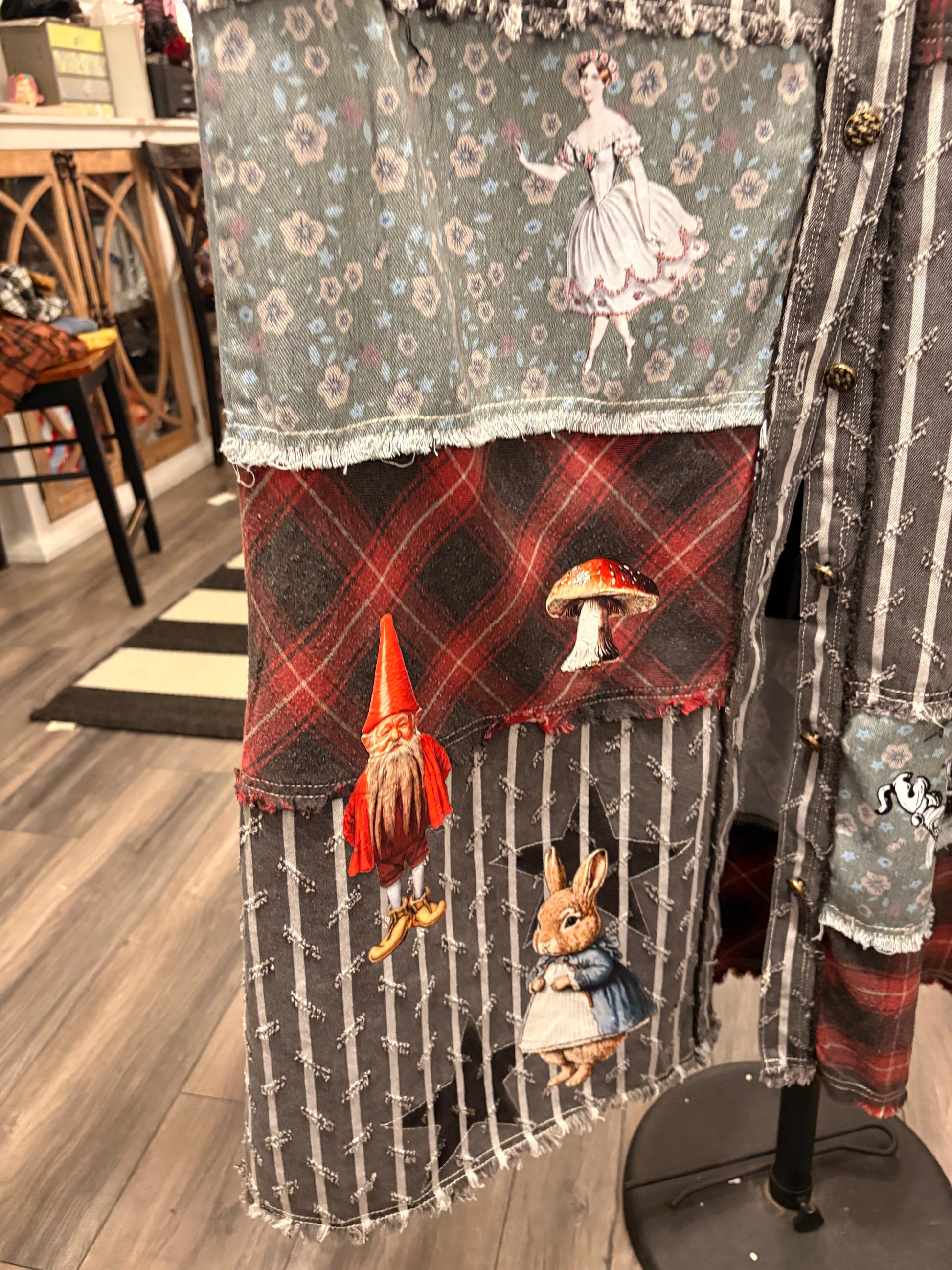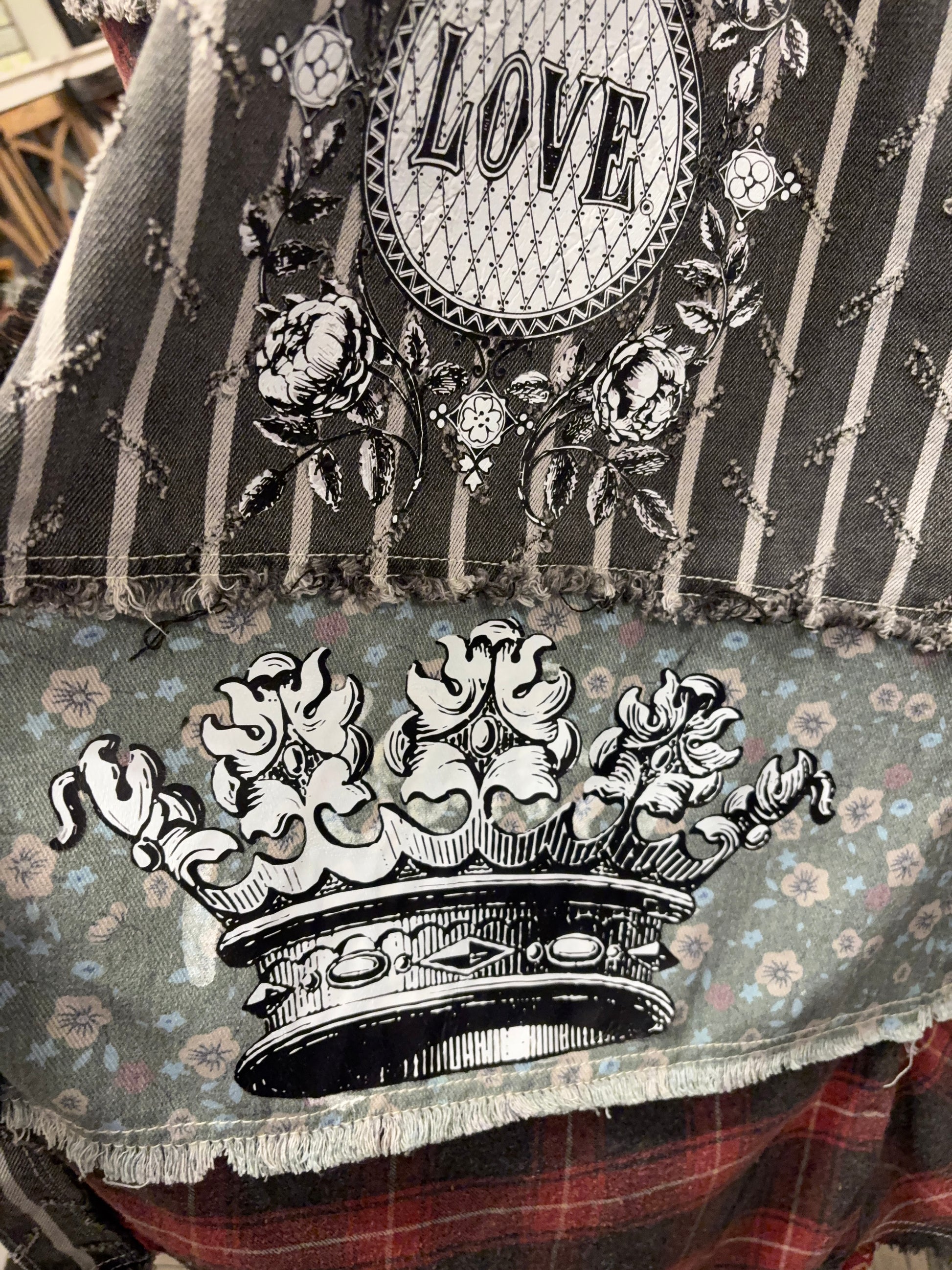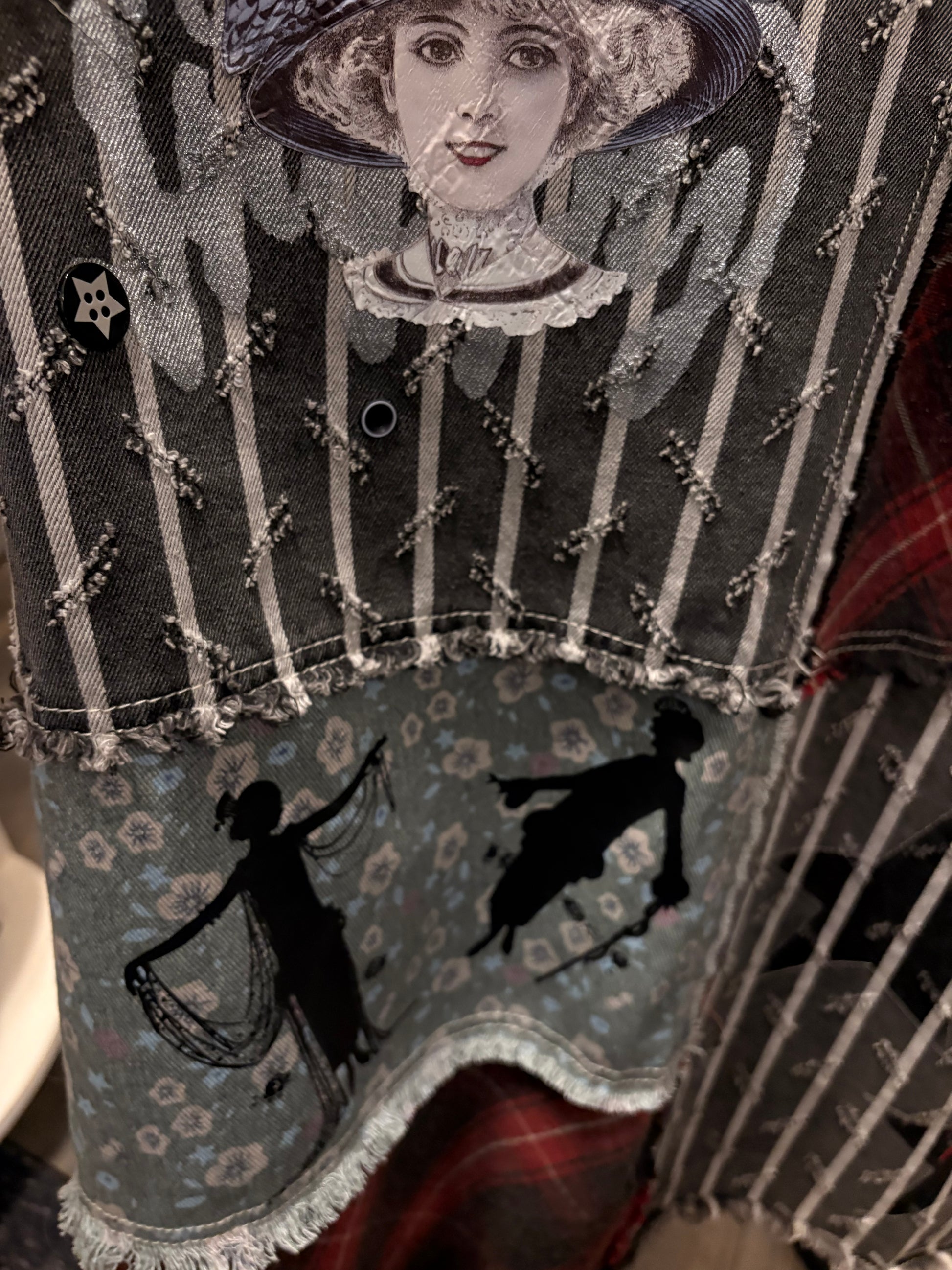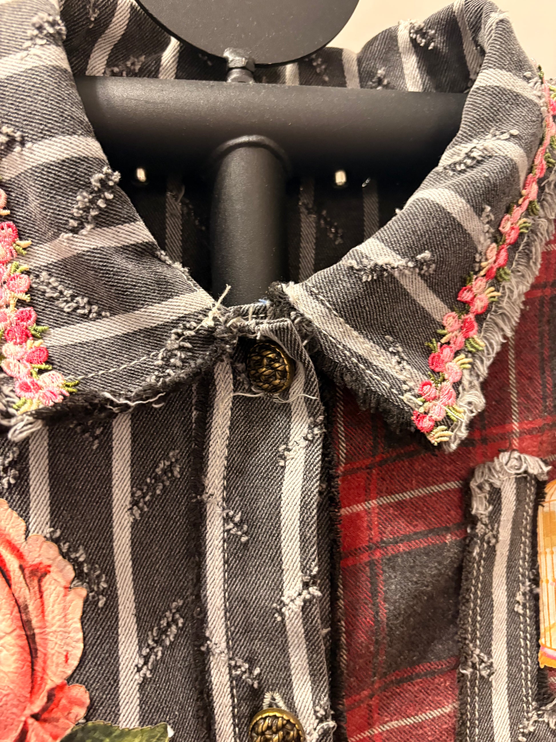 Inspired by the process of making Junk Journals. Each piece is completely Original and one of a kind. Refashioned patchwork denim button down shirt dress , vintage graphic images, hand painting, crochet, embroidered floral trim, and ornate buttons. Each piece takes hours to days to create… this is a work of art!!! *does not have pockets