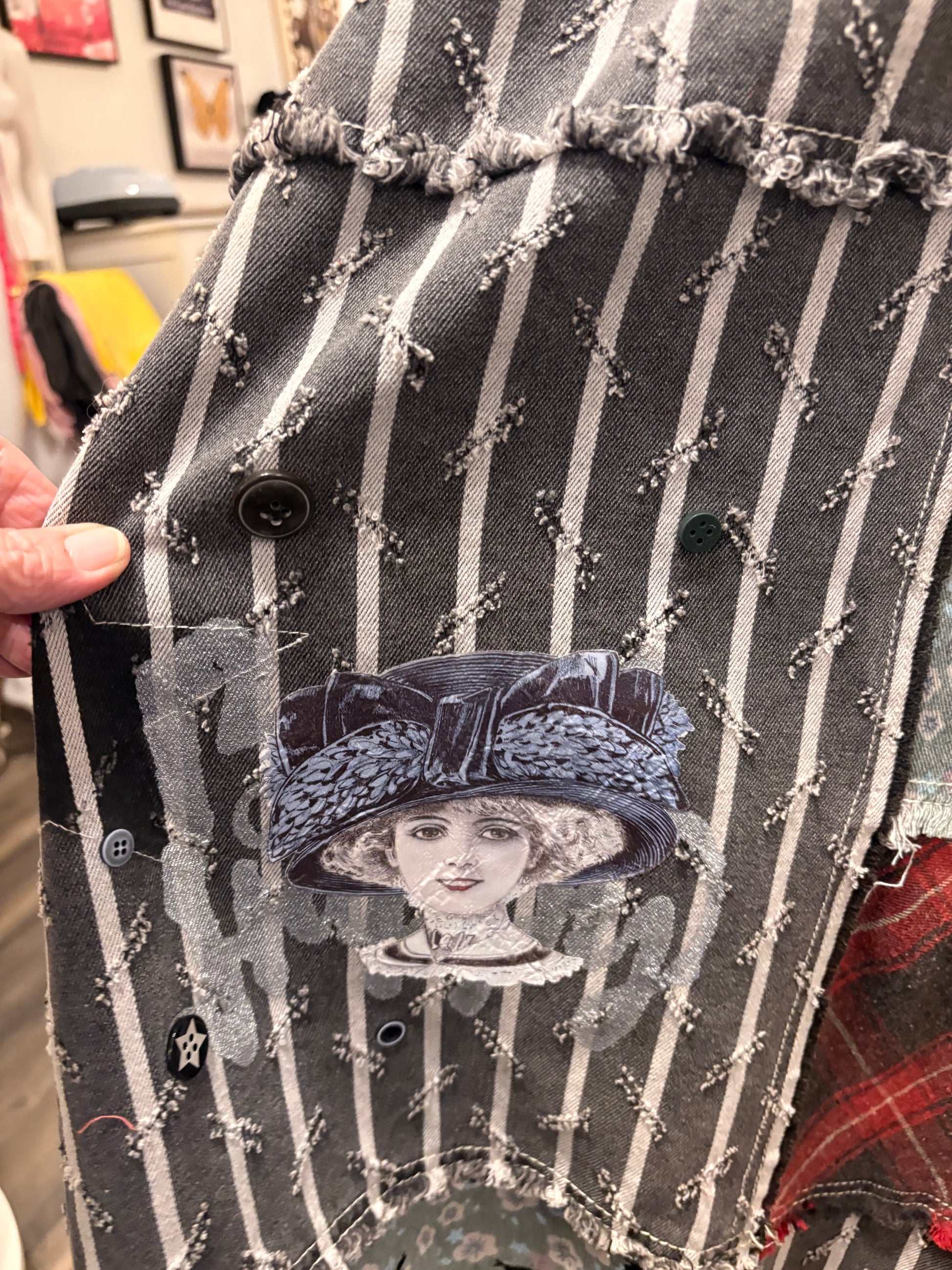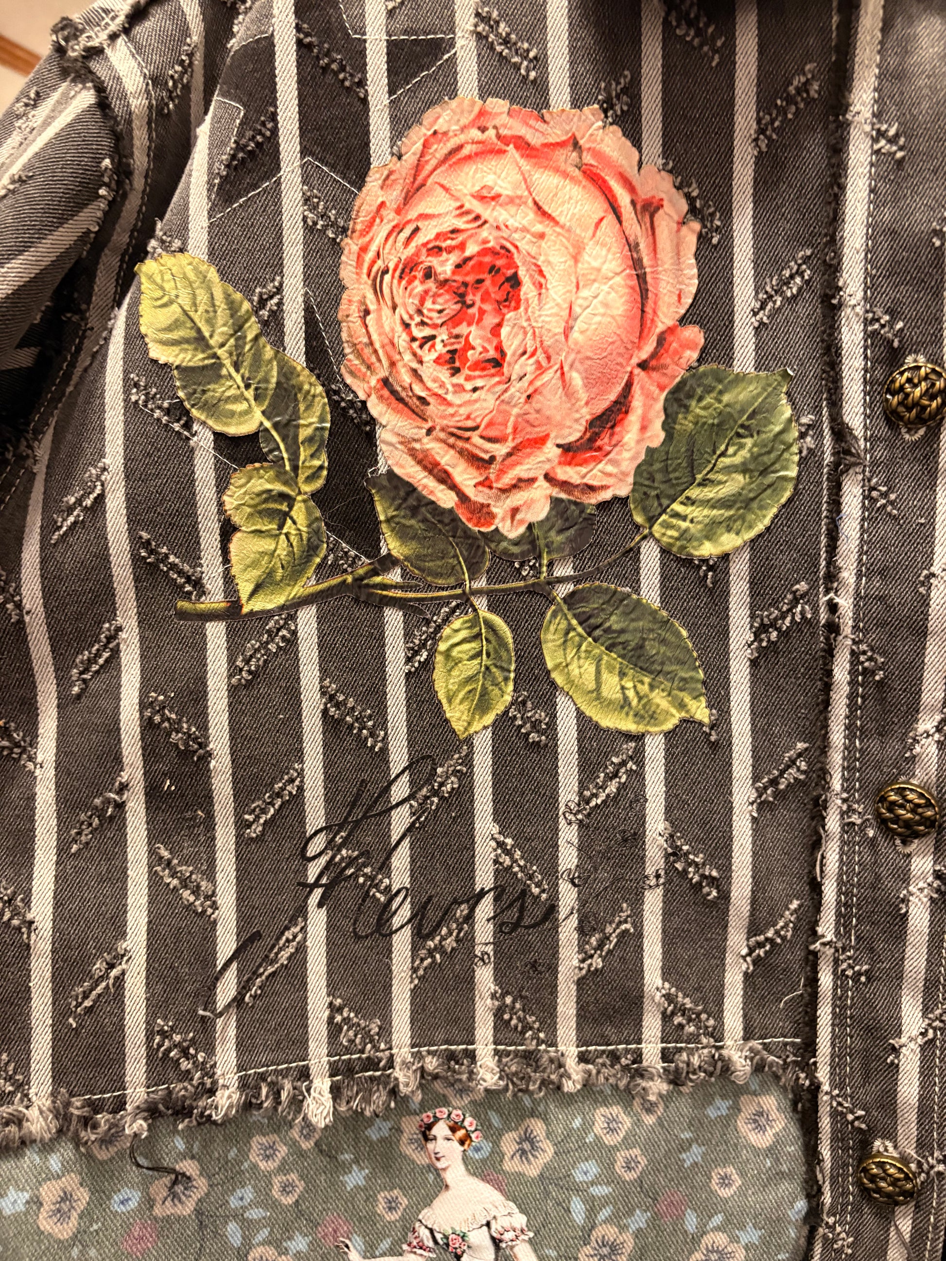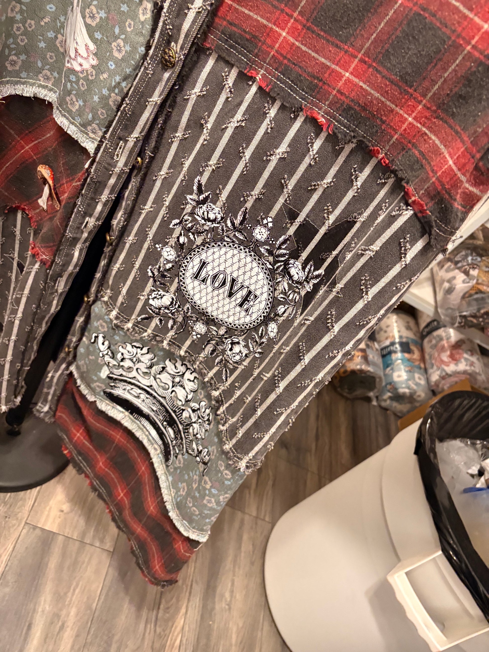 Inspired by the process of making Junk Journals. Each piece is completely Original and one of a kind. Refashioned patchwork denim button down shirt dress , vintage graphic images, hand painting, crochet, embroidered floral trim, and ornate buttons. Each piece takes hours to days to create… this is a work of art!!! *does not have pockets
