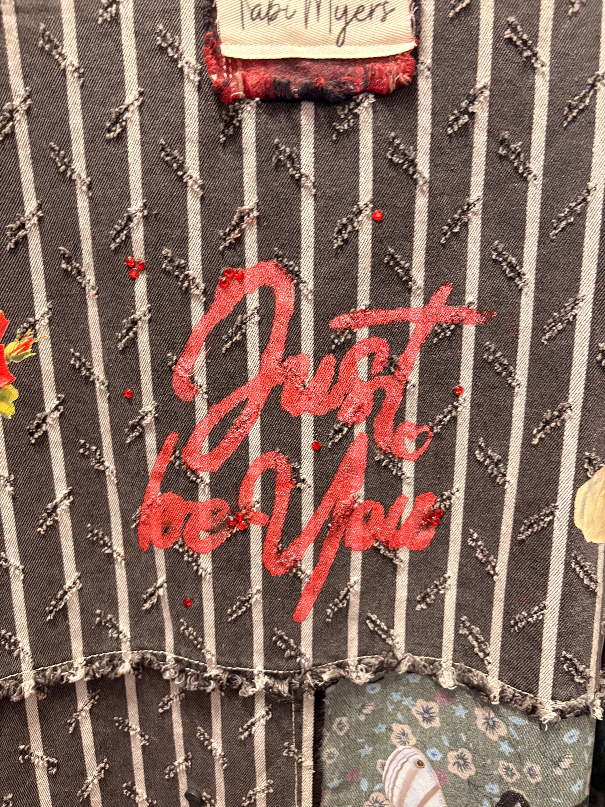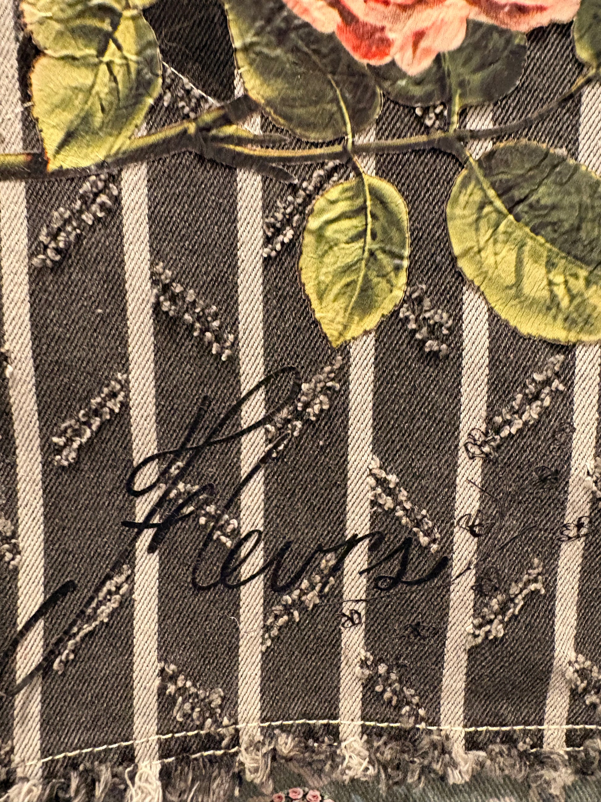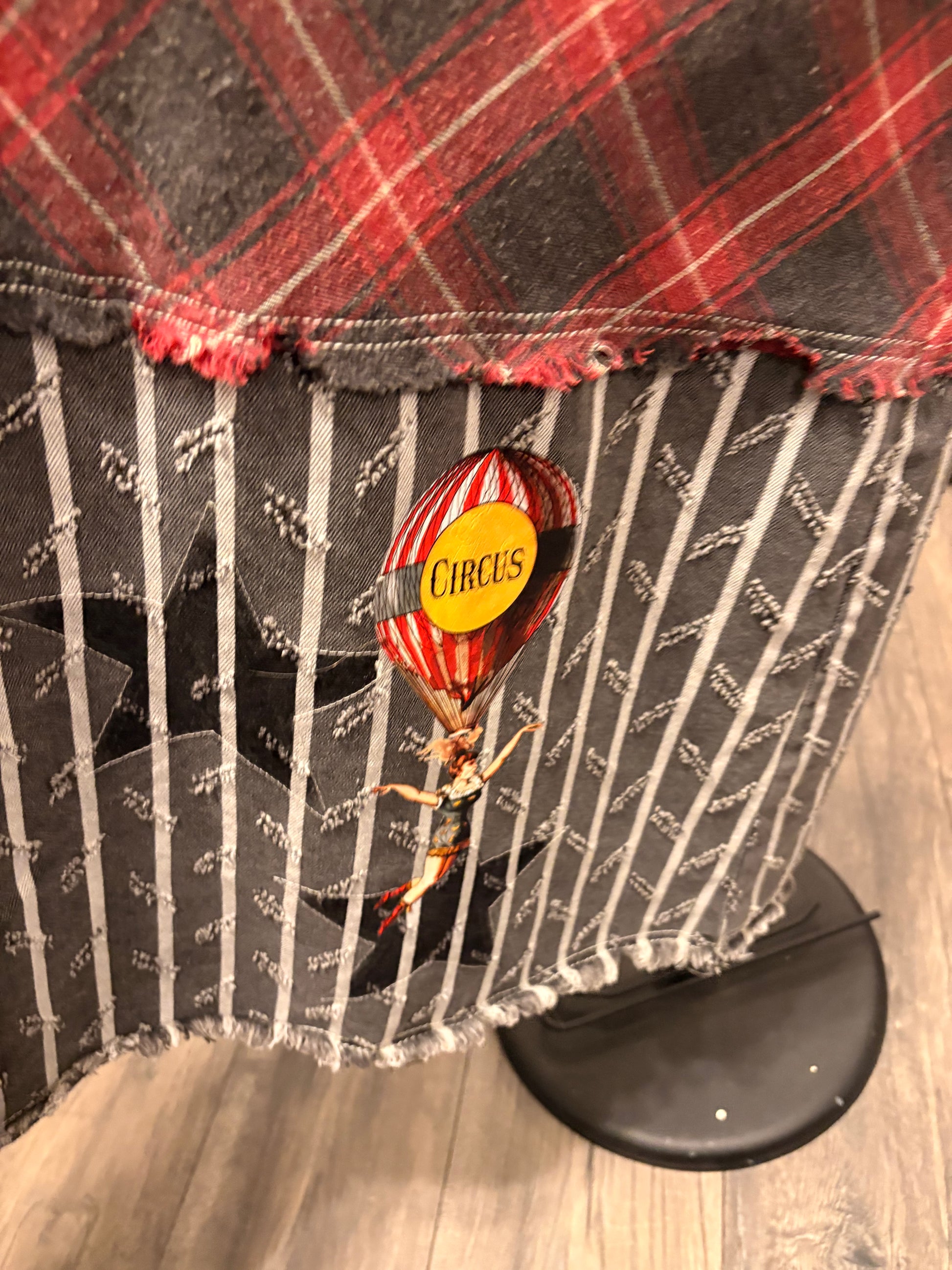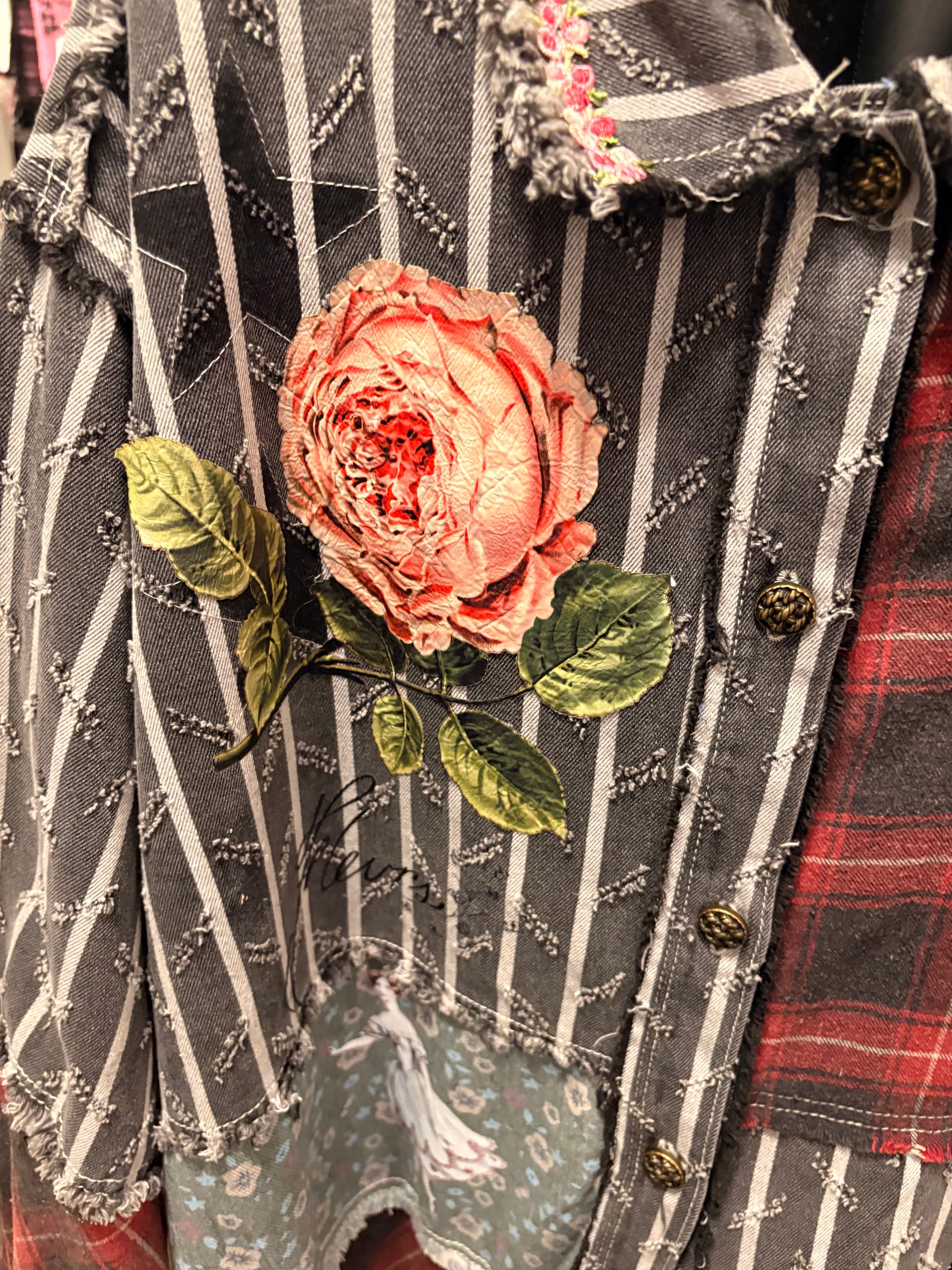 Inspired by the process of making Junk Journals. Each piece is completely Original and one of a kind. Refashioned patchwork denim button down shirt dress , vintage graphic images, hand painting, crochet, embroidered floral trim, and ornate buttons. Each piece takes hours to days to create… this is a work of art!!! *does not have pockets