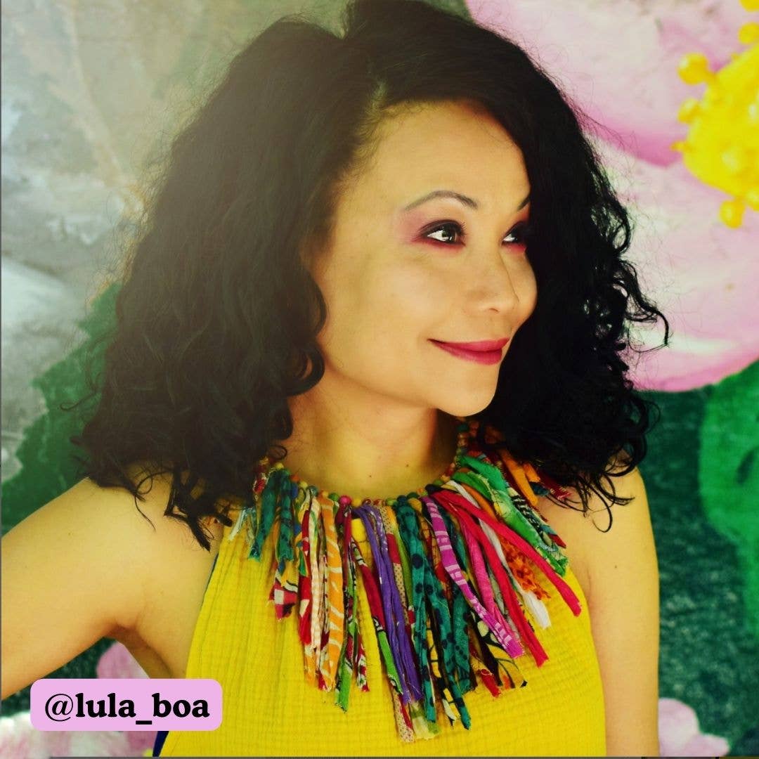 This stunner features a fringe of curled Sari ribbons that drape into a V from a single strand of colorful Kantha beads. • Measures 5.5" in diameter or 16.5" in circumference; with a 3.75" extender and a 6.5" fringe drop. • Colors & patterns will vary due to repurposed textiles. • Sustainably handmade by women artisans in India.