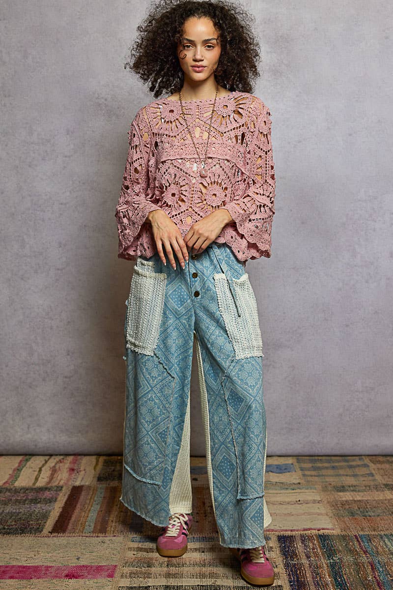 Round neck 3/4 sleeve crochet cropped top: ROSE PINK / Os